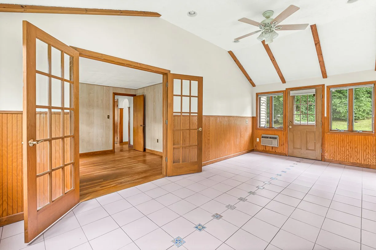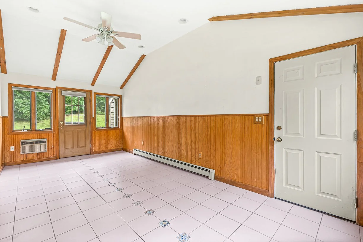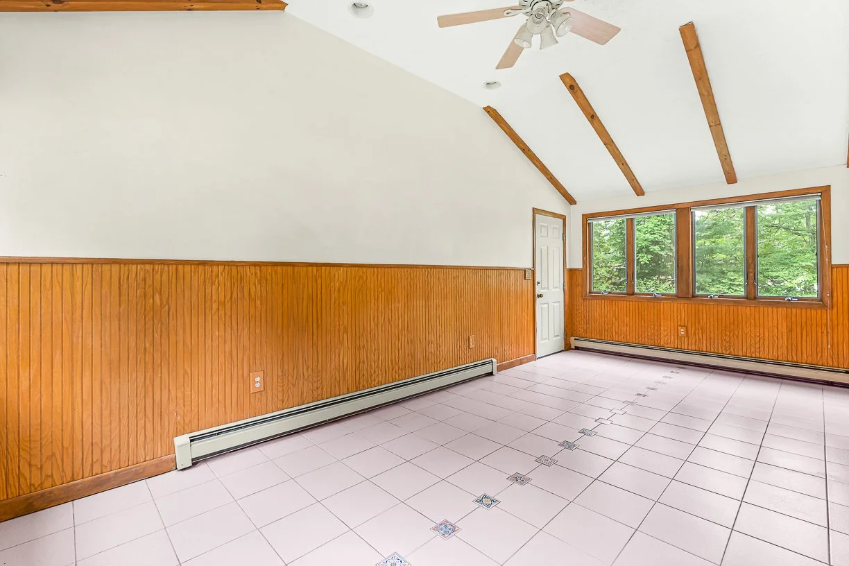 Between the office and the garage is a second living space/den with tall vaulted ceilings, tile floors, a separate entrance and lovely natural light.