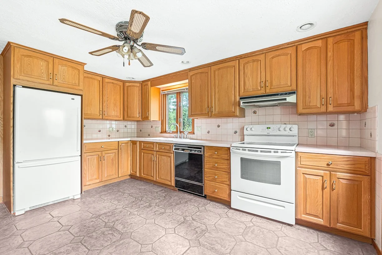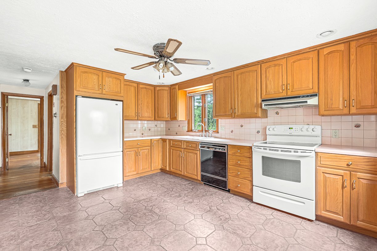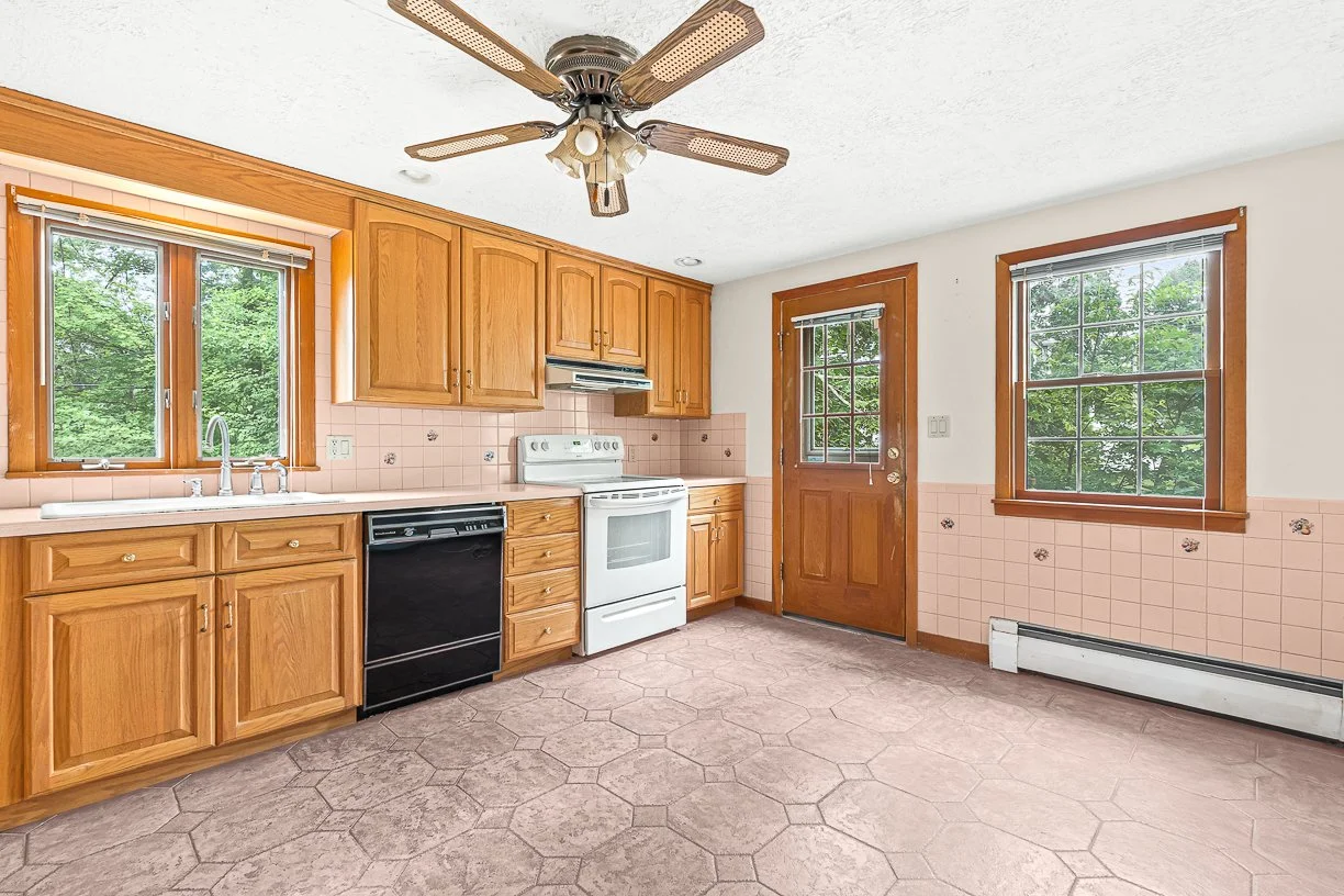 The quaint kitchen features an electric stove, dishwasher and refrigerator and has ample cabinets and countertops with ample space for a dining table. There’s a separate side entrance from the kitchen off the side driveway for convenience and accessibility.