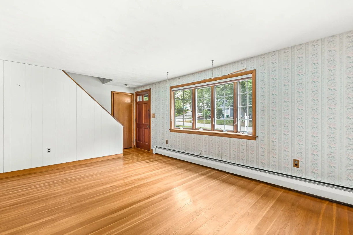 Enter this lovely single family home from the front door and be greeted by a spacious living room with bay windows, a coat closet and staircase that leads upstairs.