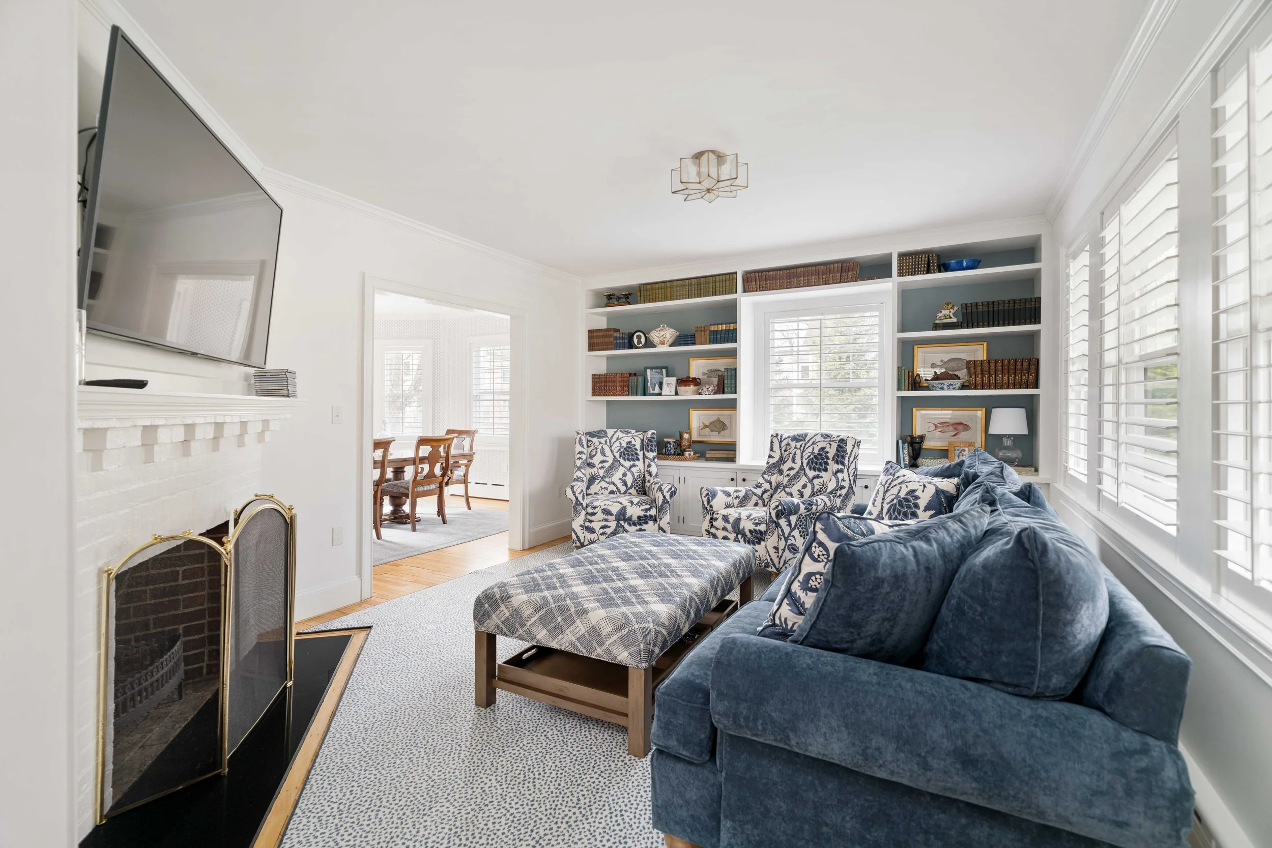 The living room is just off the dining room, with a fireplace, and custom built-ins with generous space for books and storage.