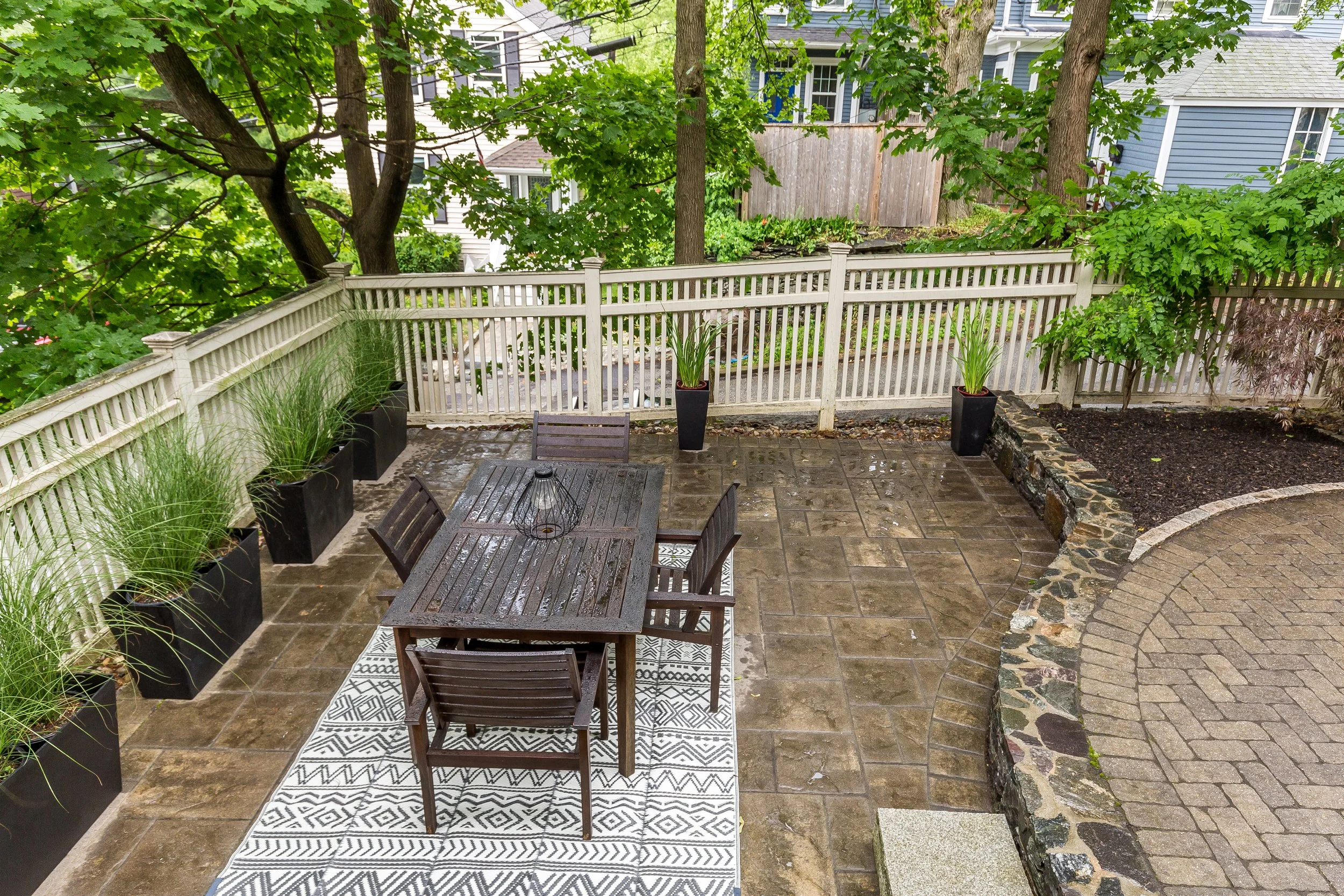 The front door overlooks a recessed and fenced-in private paver patio with mature landscaping and tree-cover