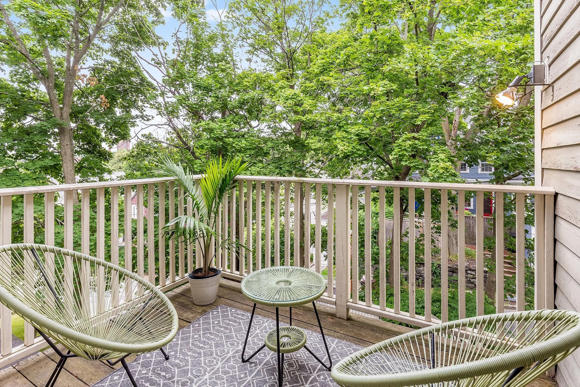The primary bedroom features its own private outdoor balcony that overlooks mature trees in the backyard