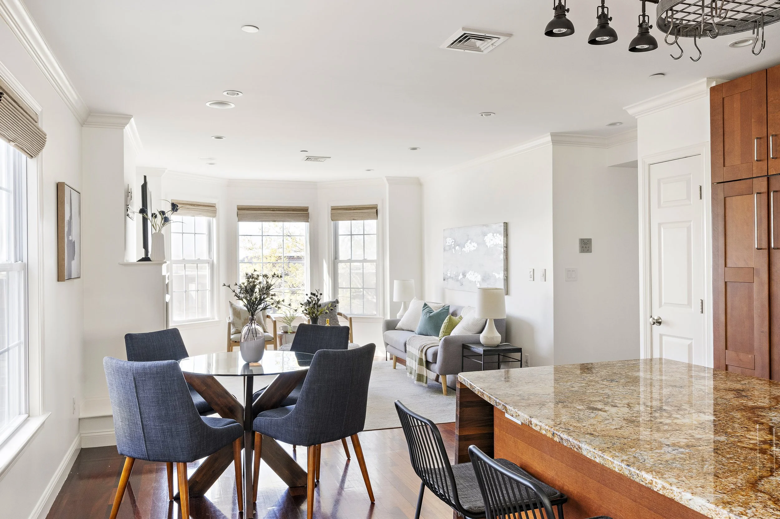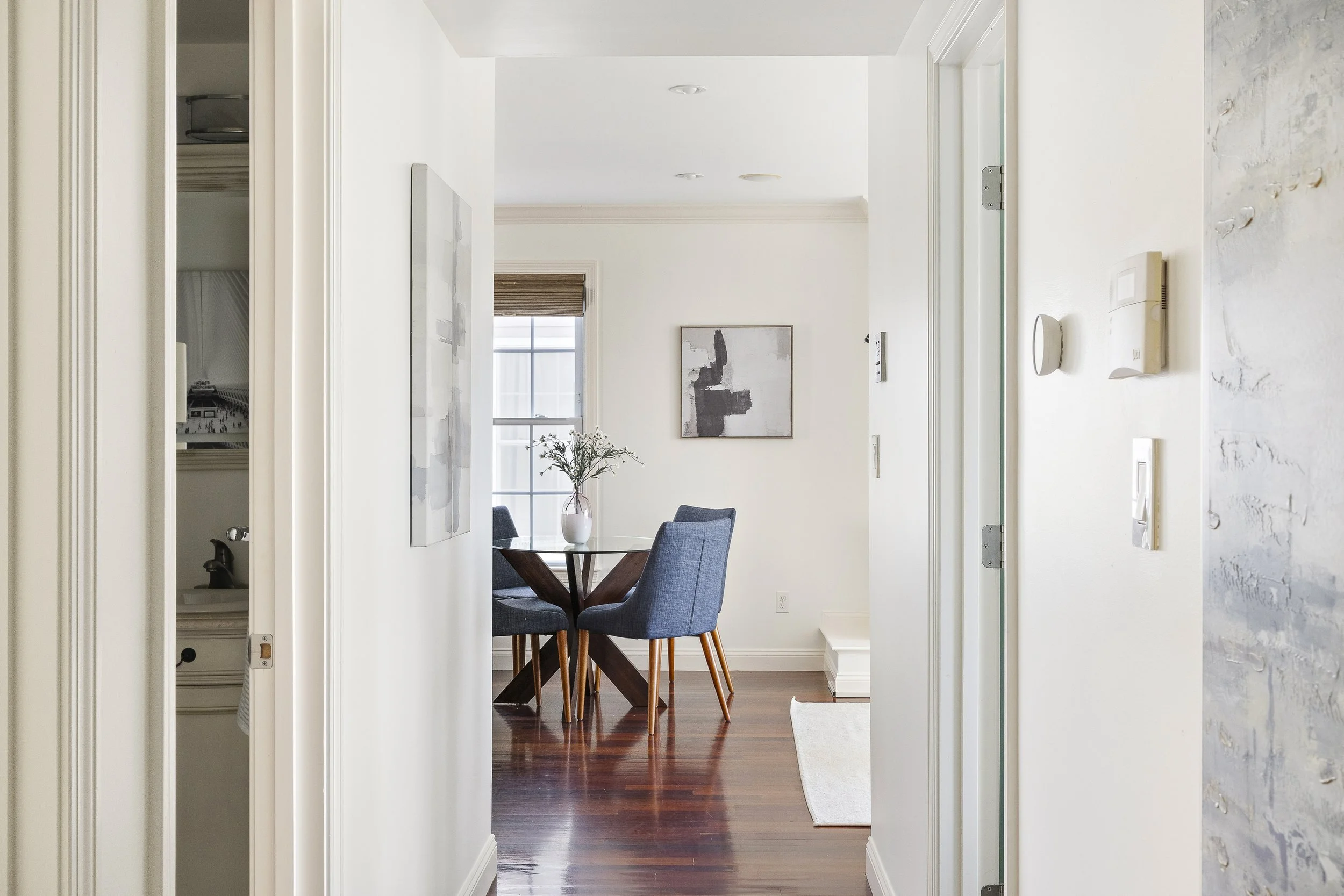 Located at the penthouse level, this well appointed condo features handsome dark wood floors, tall ceilings with crown molding, custom window treatments, and plentiful large windows for beautiful light throughout.