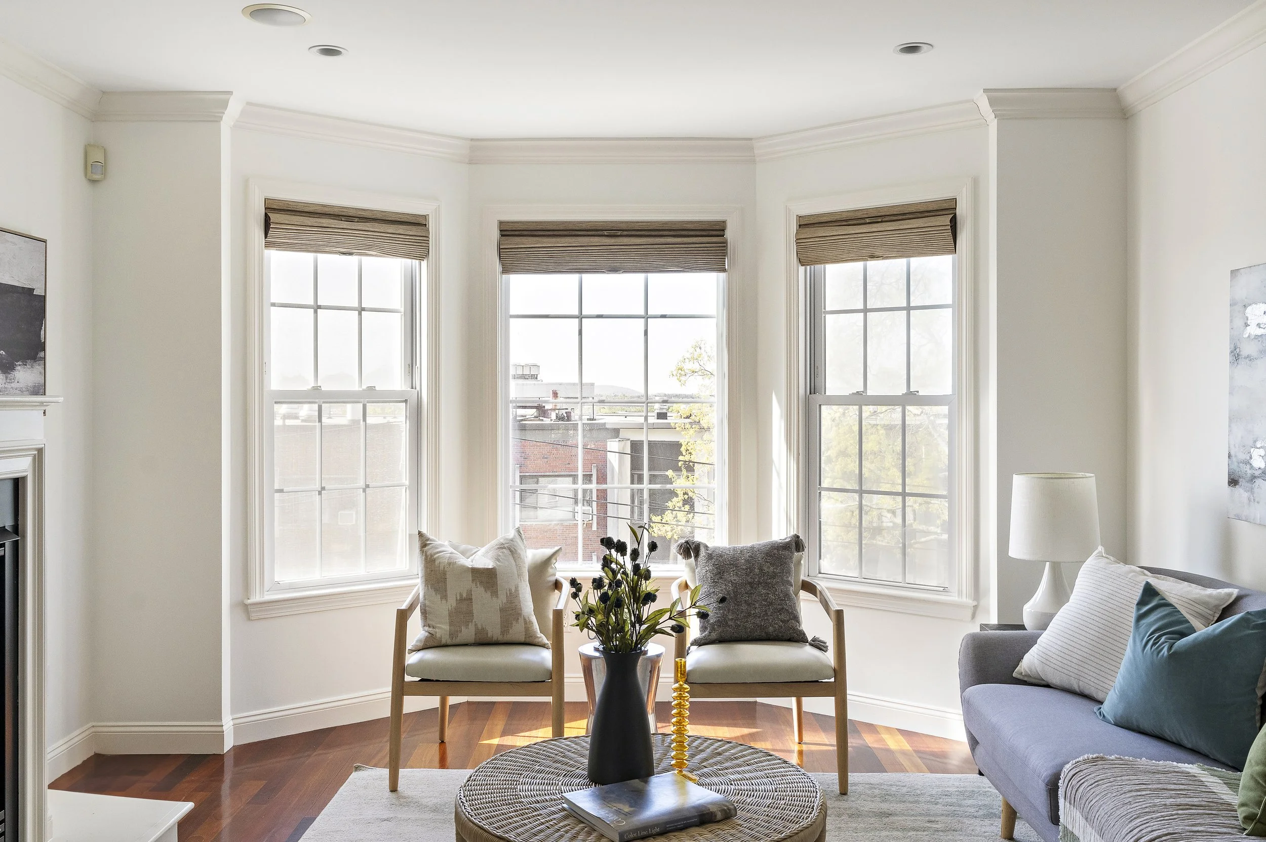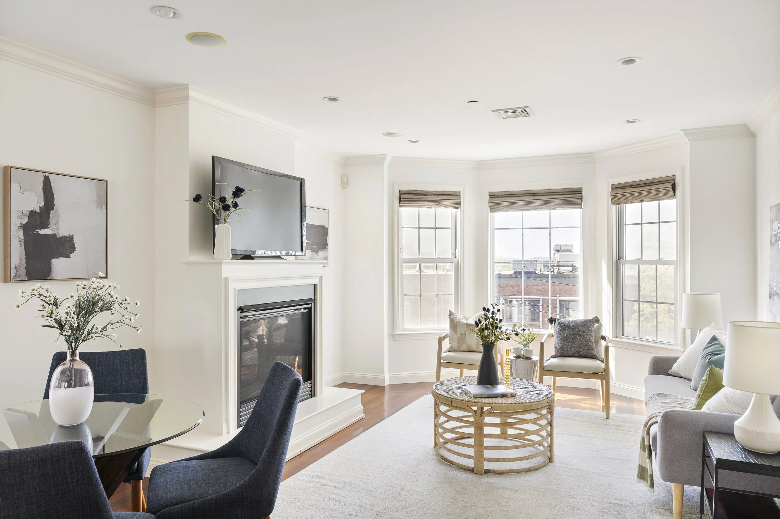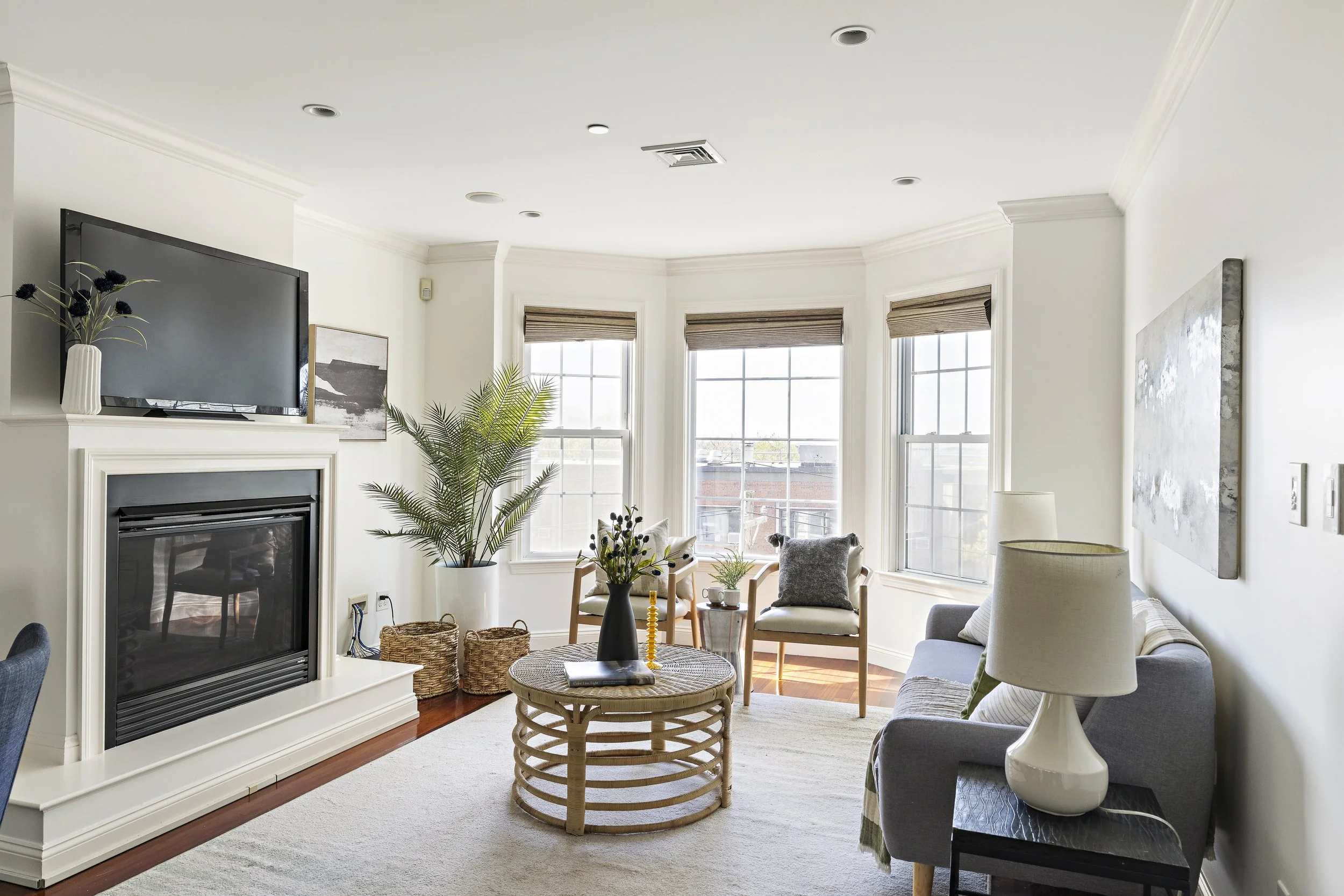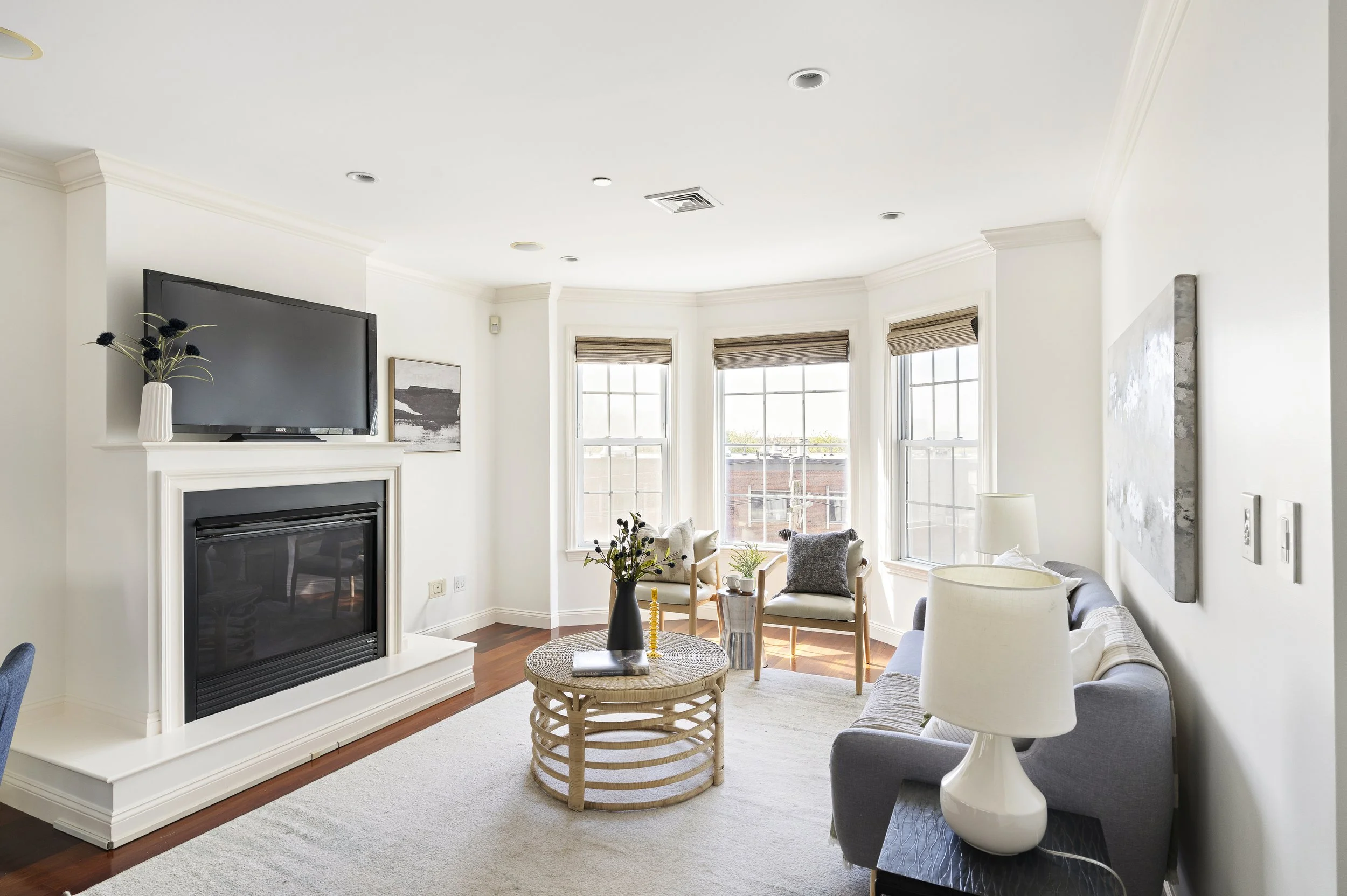 The adjacent living room is good sized and has 3 large windows in a bay, with beautiful views overlooking Fisher Ave and the Jamaica Plain neighborhood beyond. A large gas fireplace with a wooden mantle and hearth lends warmth and character to the space. The living room and kitchen are also outfitted with ceiling mounted speakers that can connect to your wireless systems.