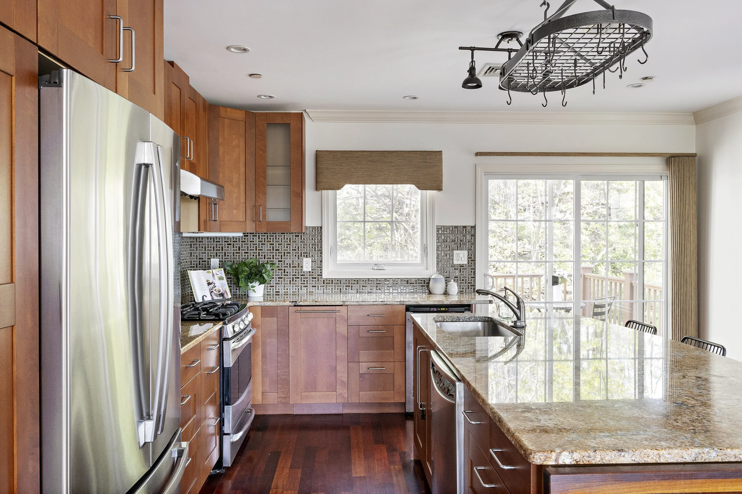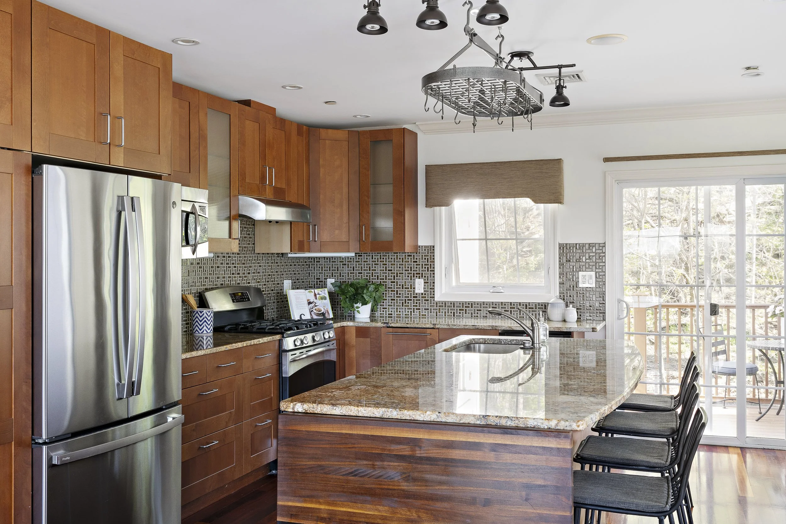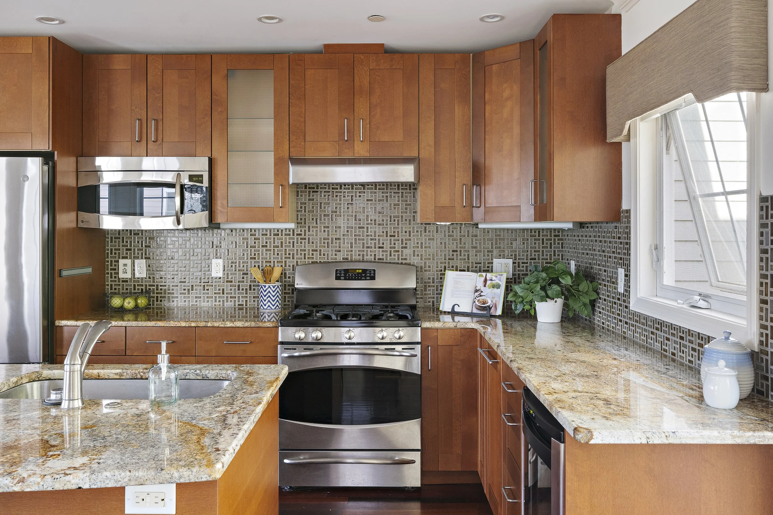 The chef’s kitchen is outfitted in rich earth tones and features warm Shaker-style wood cabinetry with brushed nickel hardware, tan granite counters, and a coordinating mosaic tile backsplash. An oversized kitchen island with drop leaf style walnut extension easily accommodates 6-7 seats and is accentuated by a large steel pot rack and adjustable track lighting overhead. All appliances are stainless steel by GE Profile and include a refrigerator with double doors and bottom freezer drawer, a 5-burner gas range, a dishwasher, a microwave, and a wine refrigerator.