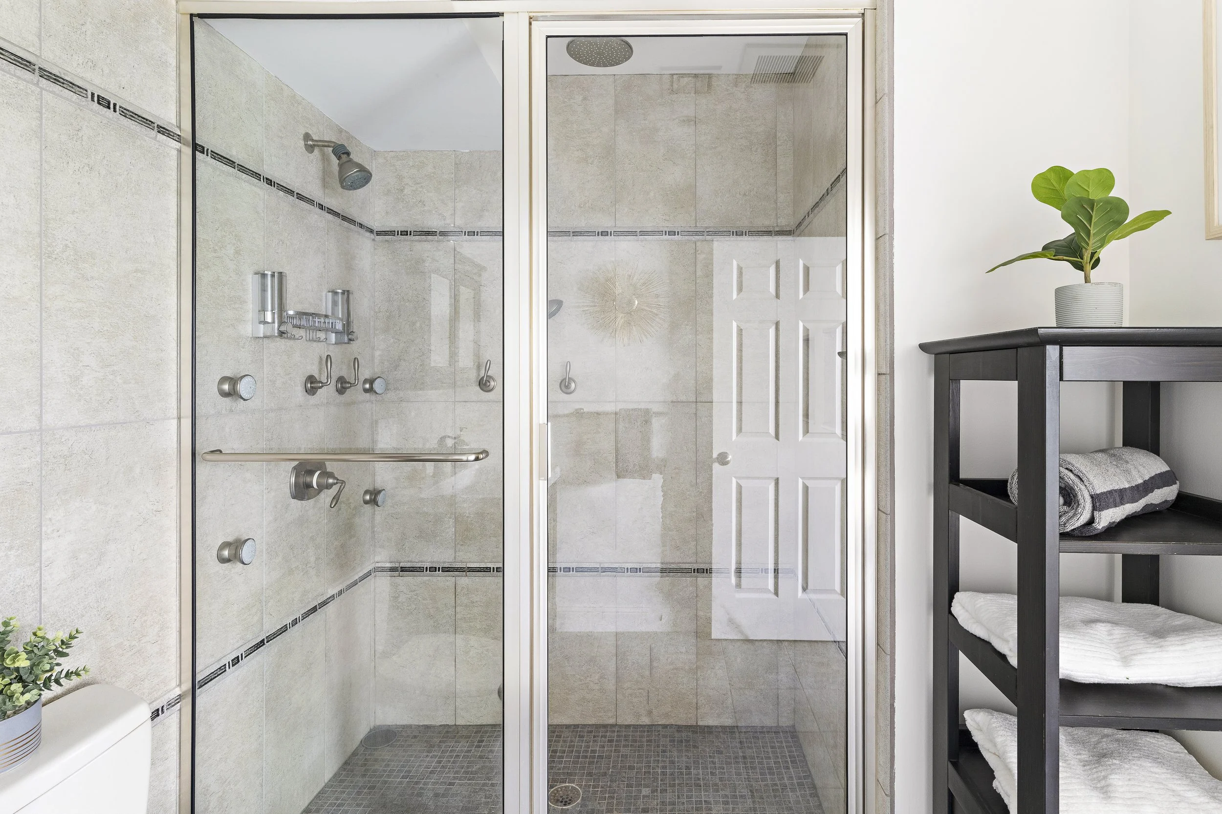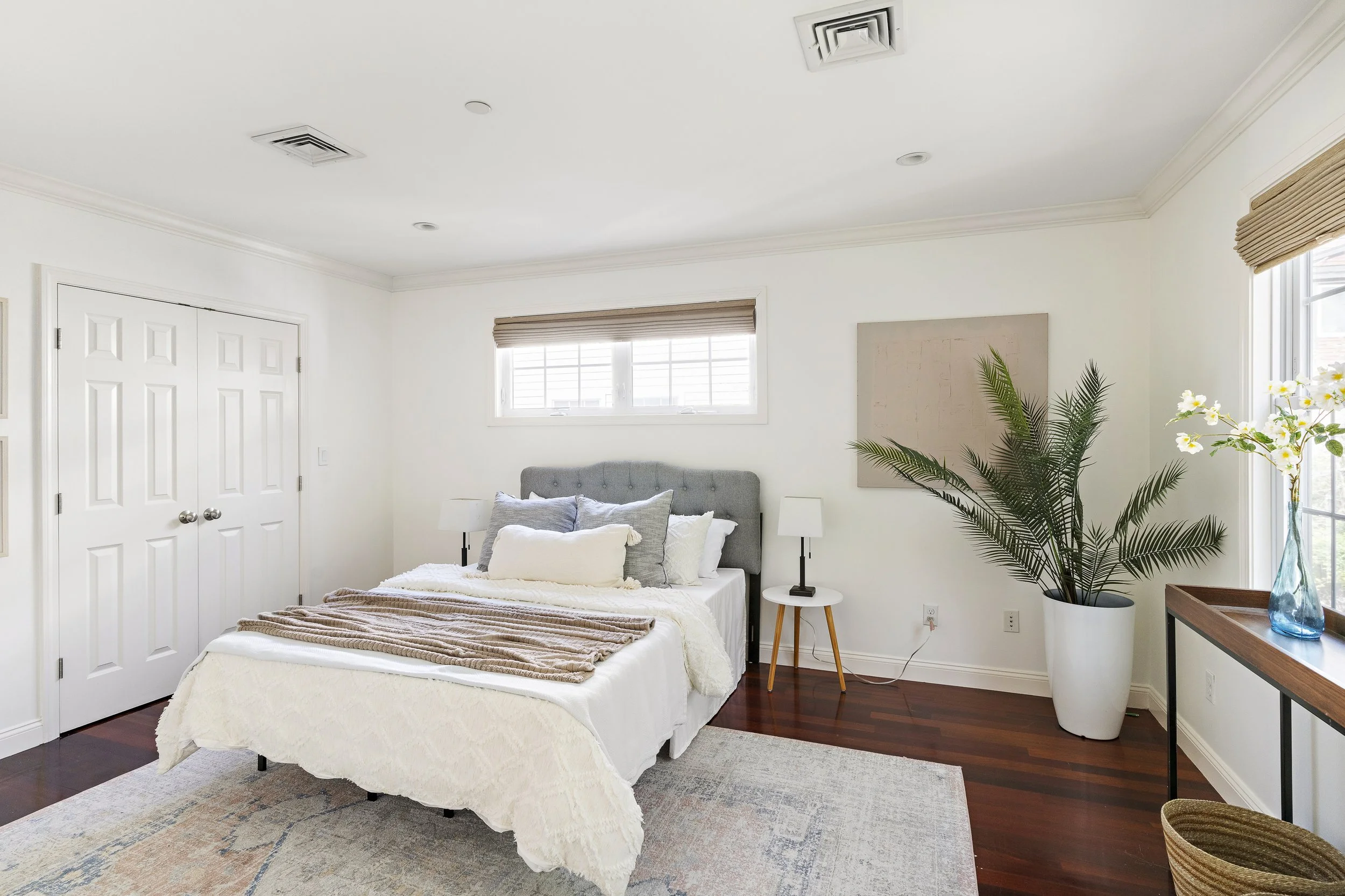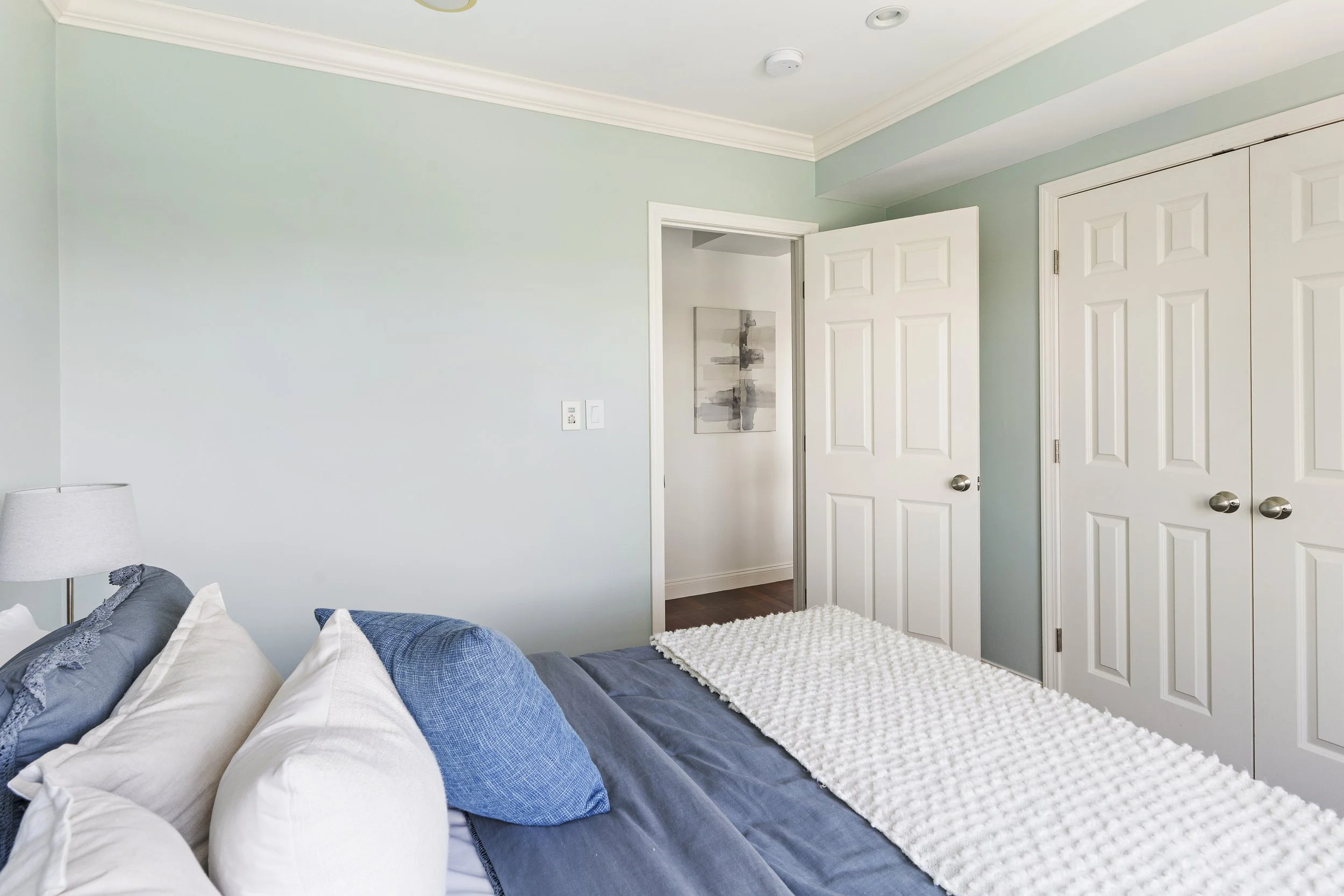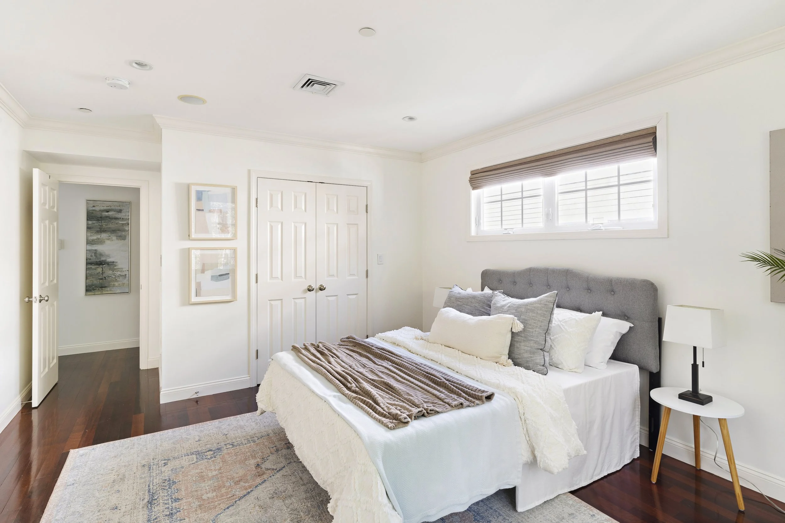 The generously sized primary bedroom has 3 large windows that bring in abundant natural light and are outfitted with room darkening woven shades. The room comfortably accommodates a queen- or king- sized bed and features a second gas fireplace for a distinct sense of luxury! Not to be missed is a large closet with extensive custom built-ins for the ultimate wardrobe organization.