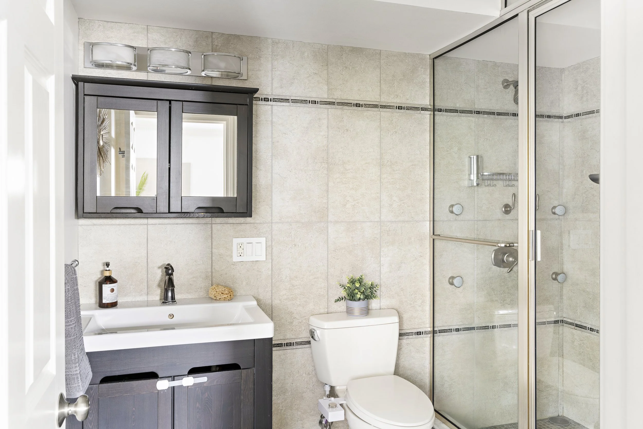 An ensuite bathroom is outfitted with a gray ceramic tile flooring and surrounds with mosaic accents, a black wooden vanity with a porcelain sink and black faucet, a ttoilet with bidet and a matching mirrored medicine cabinet. The generously sized walk-in shower offers both wall-mounted and handheld sprayers, a luxurious steam function, and tall glass doors.