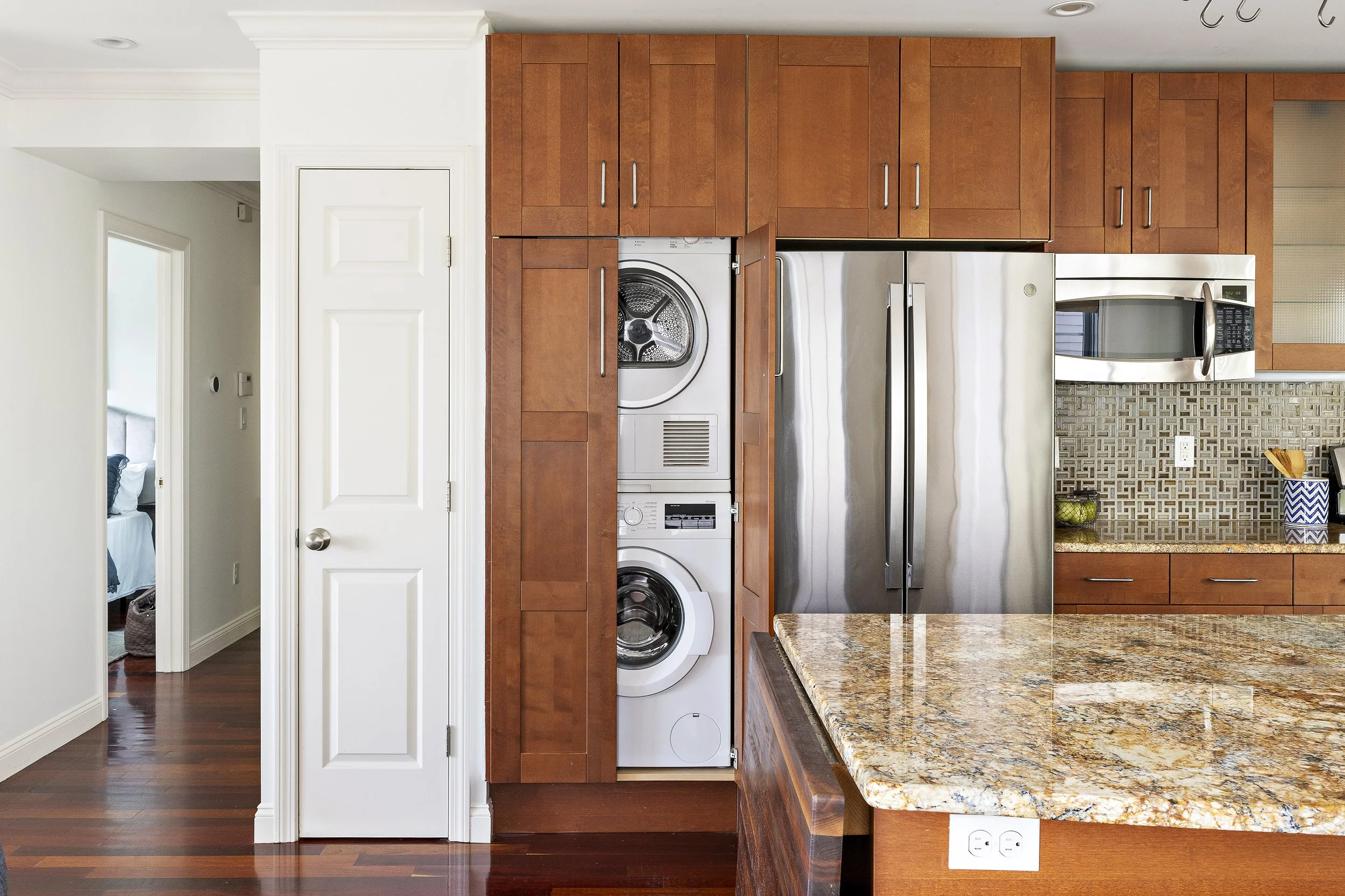 A stacking Bosch washer and dryer set are located in a cabinet in the kitchen, and are included with the sale.
