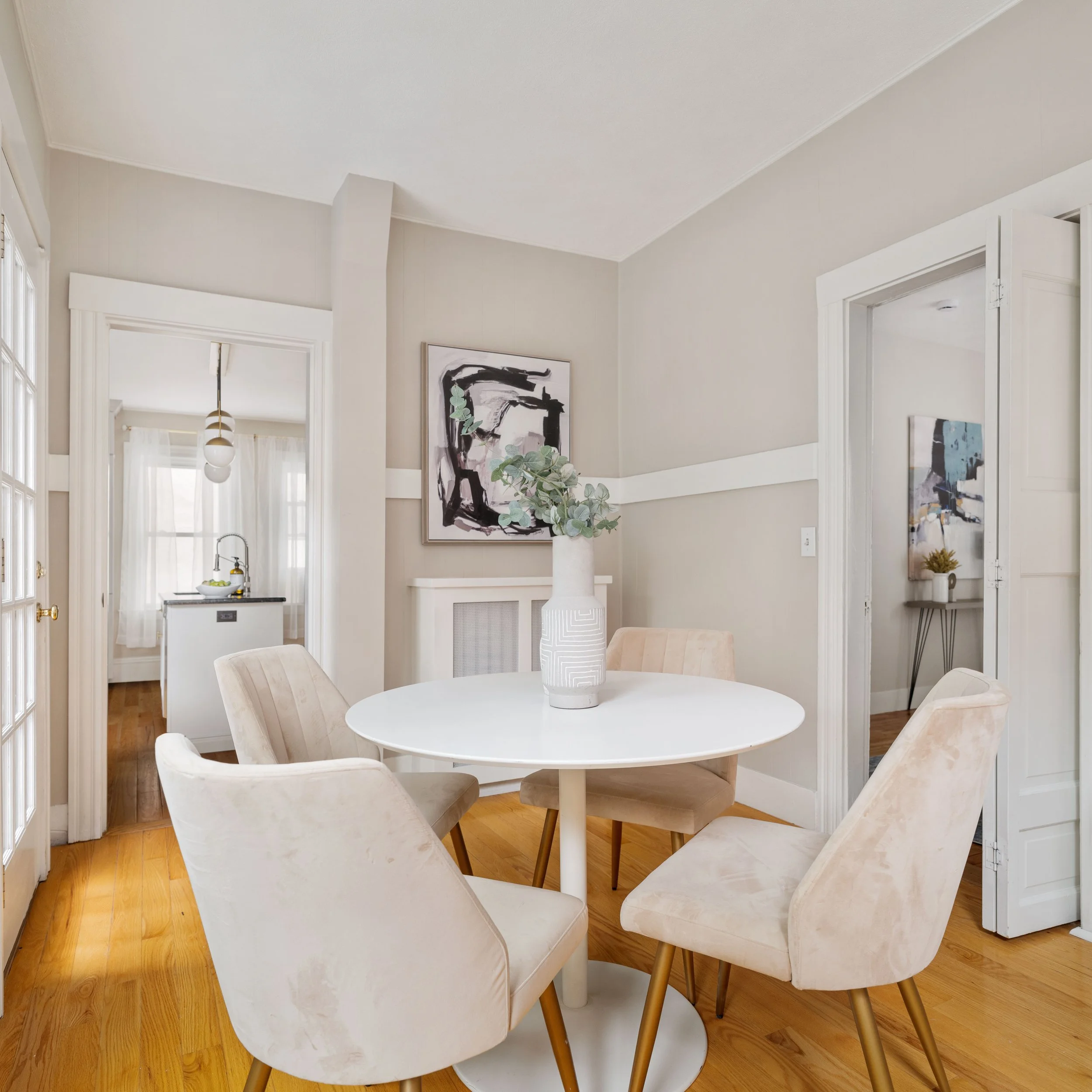Adjacent to the kitchen is a delightful and sun filled room overlooking the back porch, patio, and shared backyard. Use this as a dining area, home office, or workout space - your choice. It features 4 large windows and a French door leading outside. What a perfect spot for lounging and enjoying morning coffee!