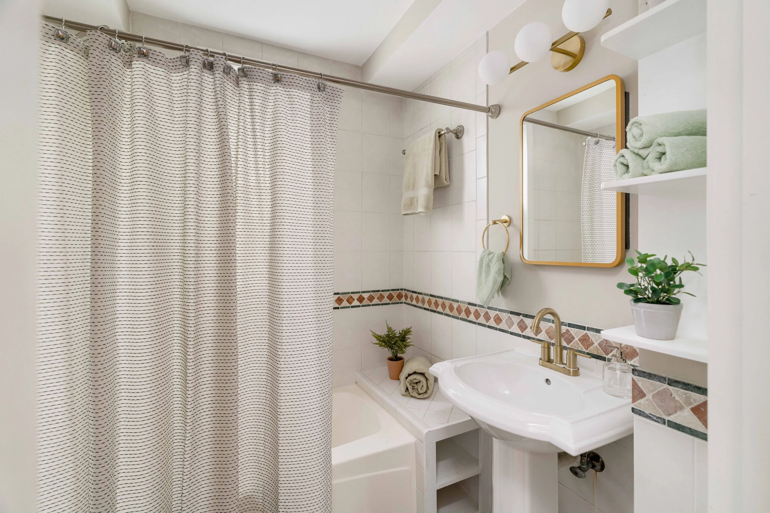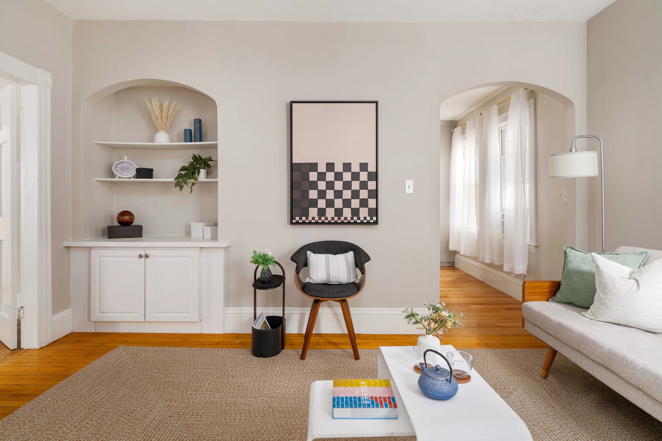 At the center of the condo, the living room has two windows, a gracious built-in hutch, a playful brass and glass chandelier, and an extra deep closet.