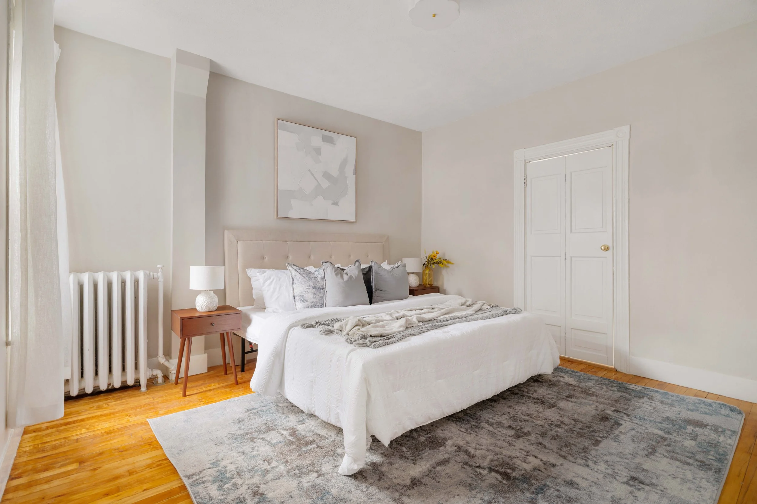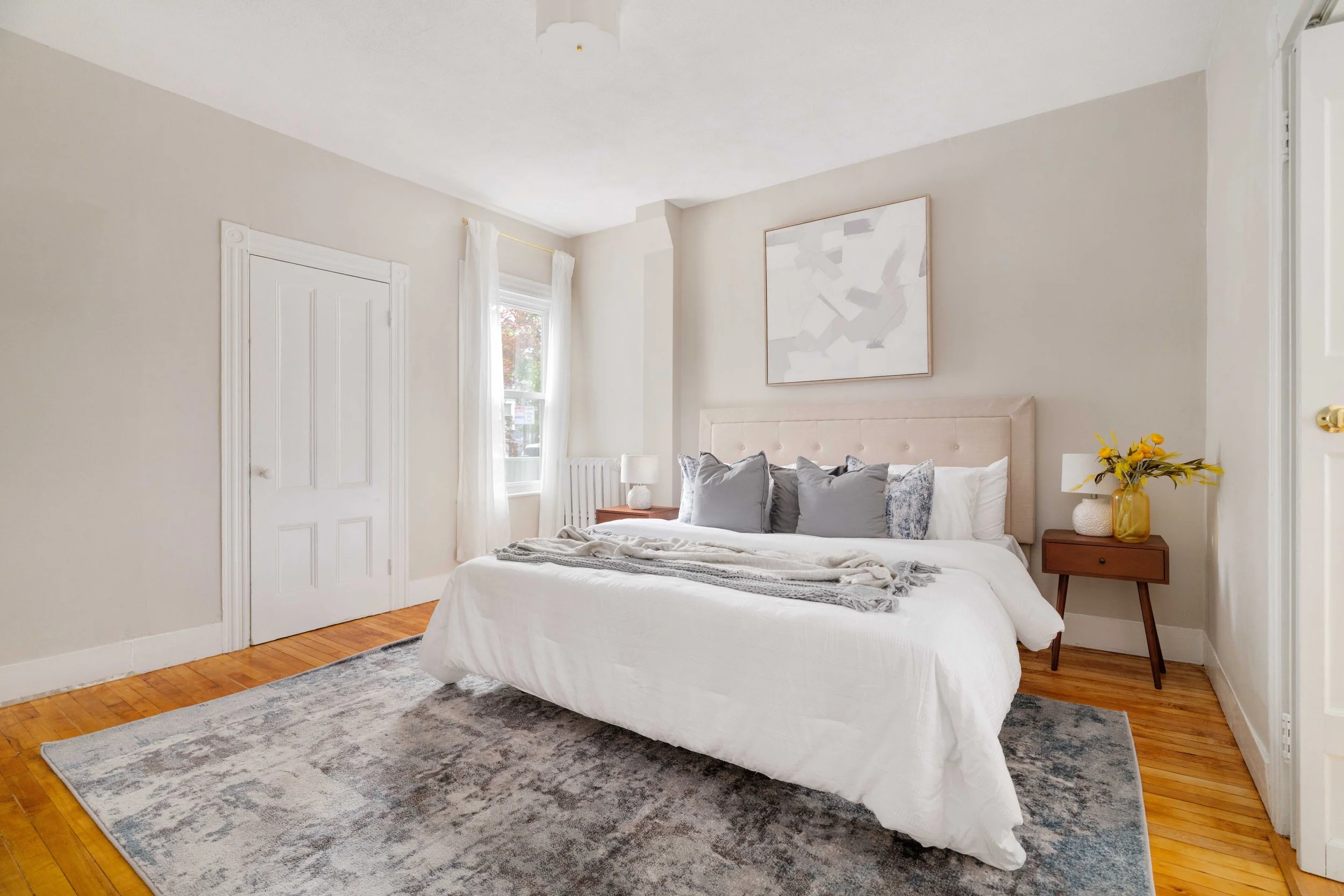 The primary bedroom is amply sized, with plenty of space for a king bed, and has one window and a walk-in closet.