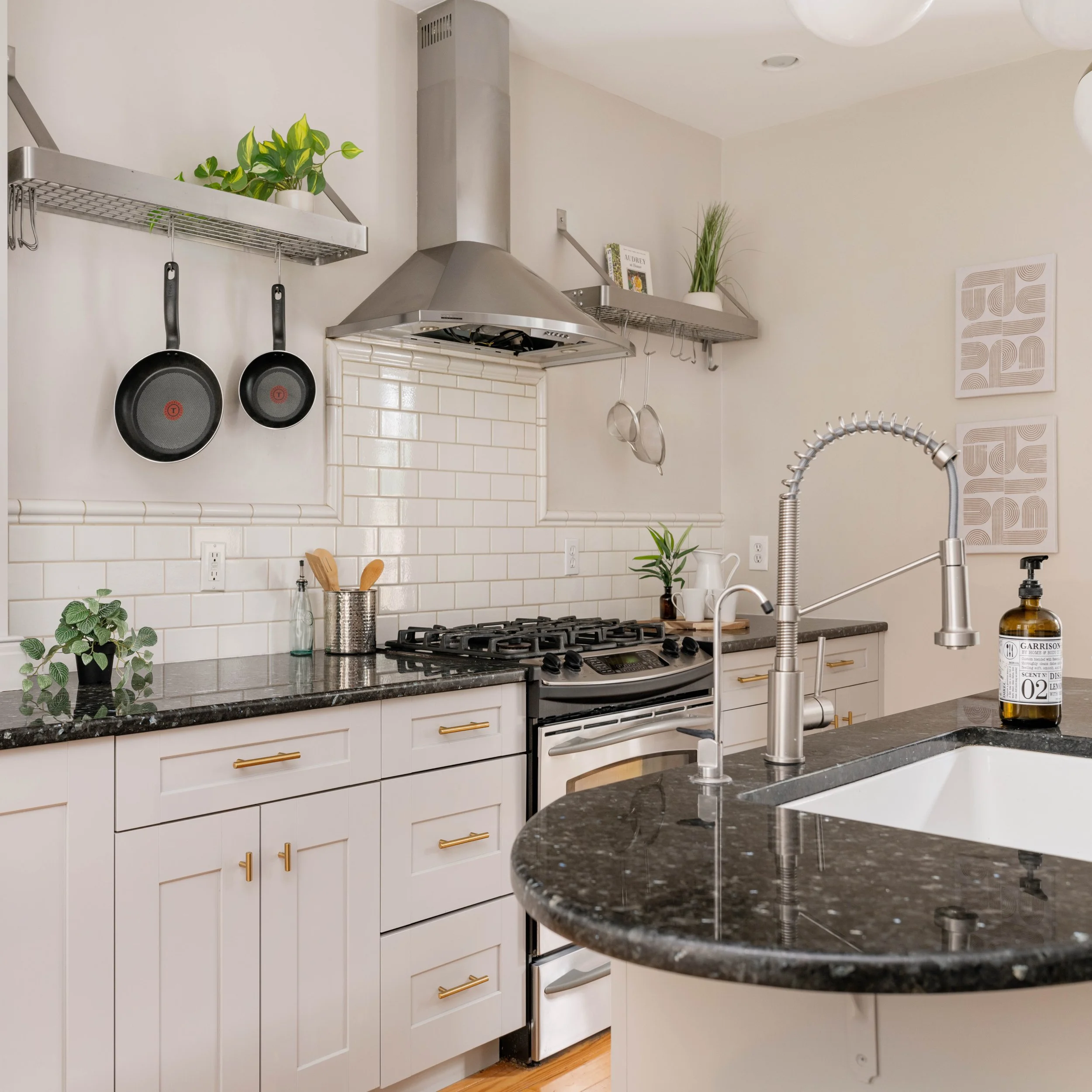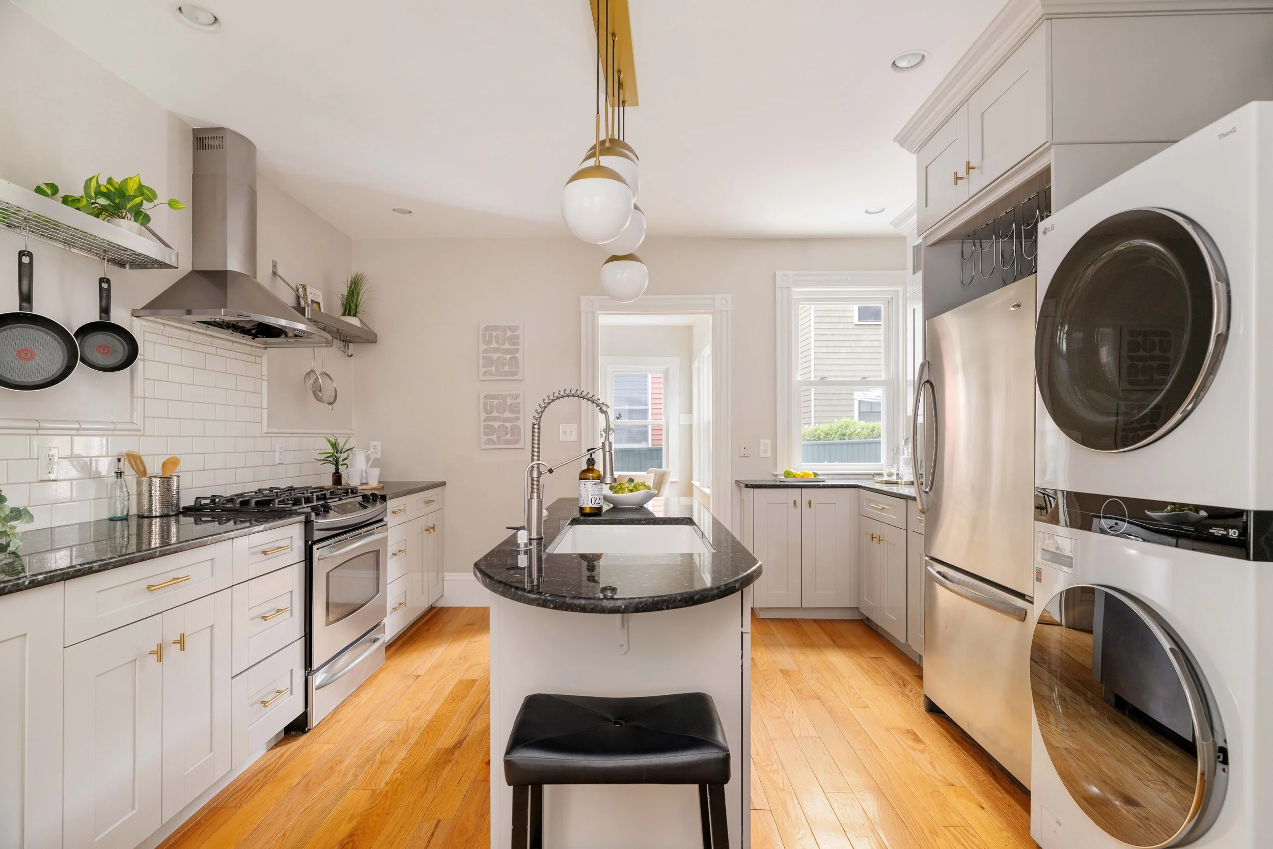 The kitchen features oak hardwood floors, black granite counters, a subway tiled backsplash, handsome gray cabinetry with thick crown molding, two stainless steel pot racks, a center island with an oversized porcelain sink, and an eye-catching white glass and brass chandelier overhead. Appliances include a GE Profile gas stove with a Zephyr exterior-venting hood, a Bosch dishwasher, an Amana fridge with wine storage above, a sink disposal, and a stacking LG front-loading washer and gas dryer set (new in ‘22).