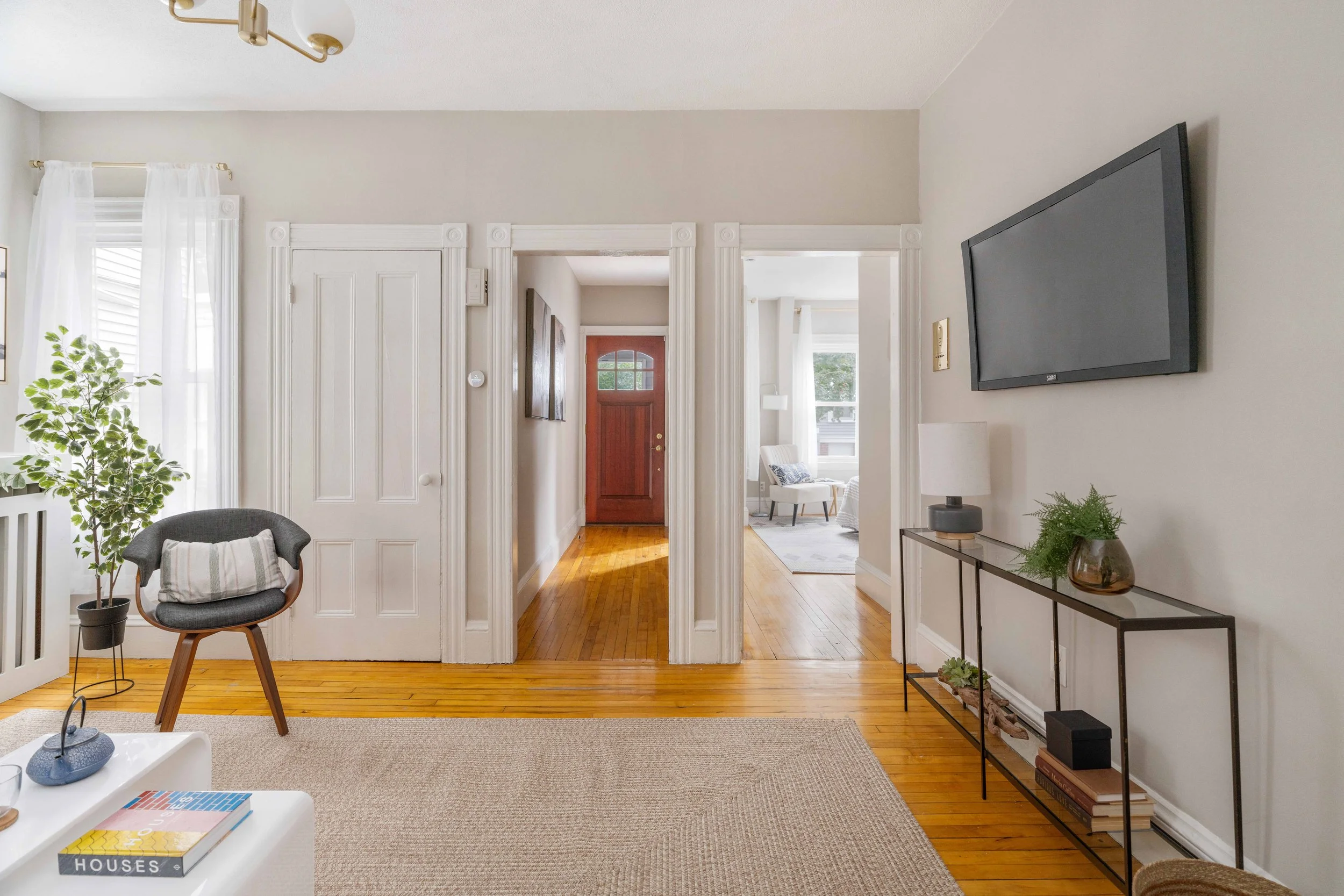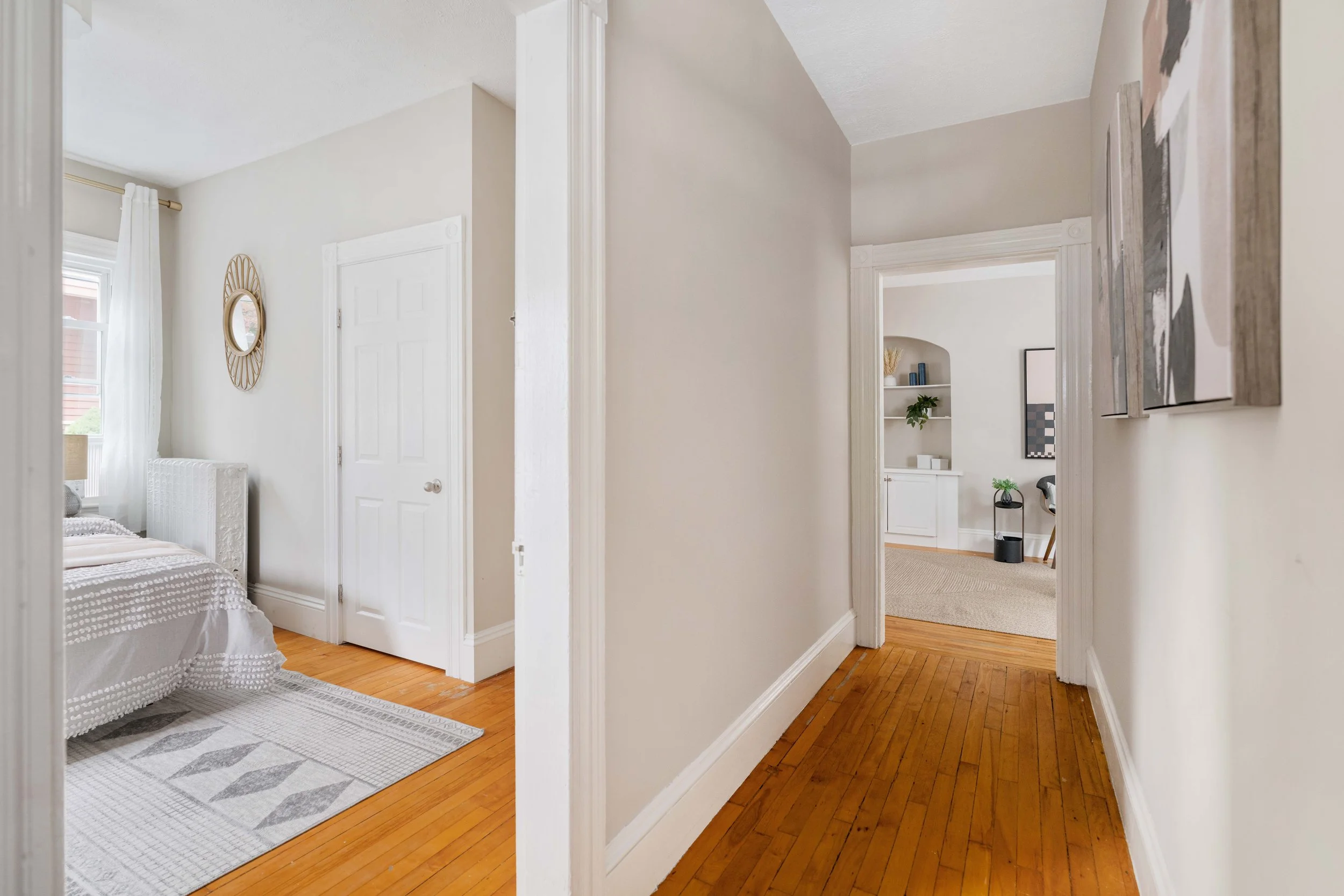 Enter into a central hallway leading to either the first bedroom on the left or the living room straight ahead.