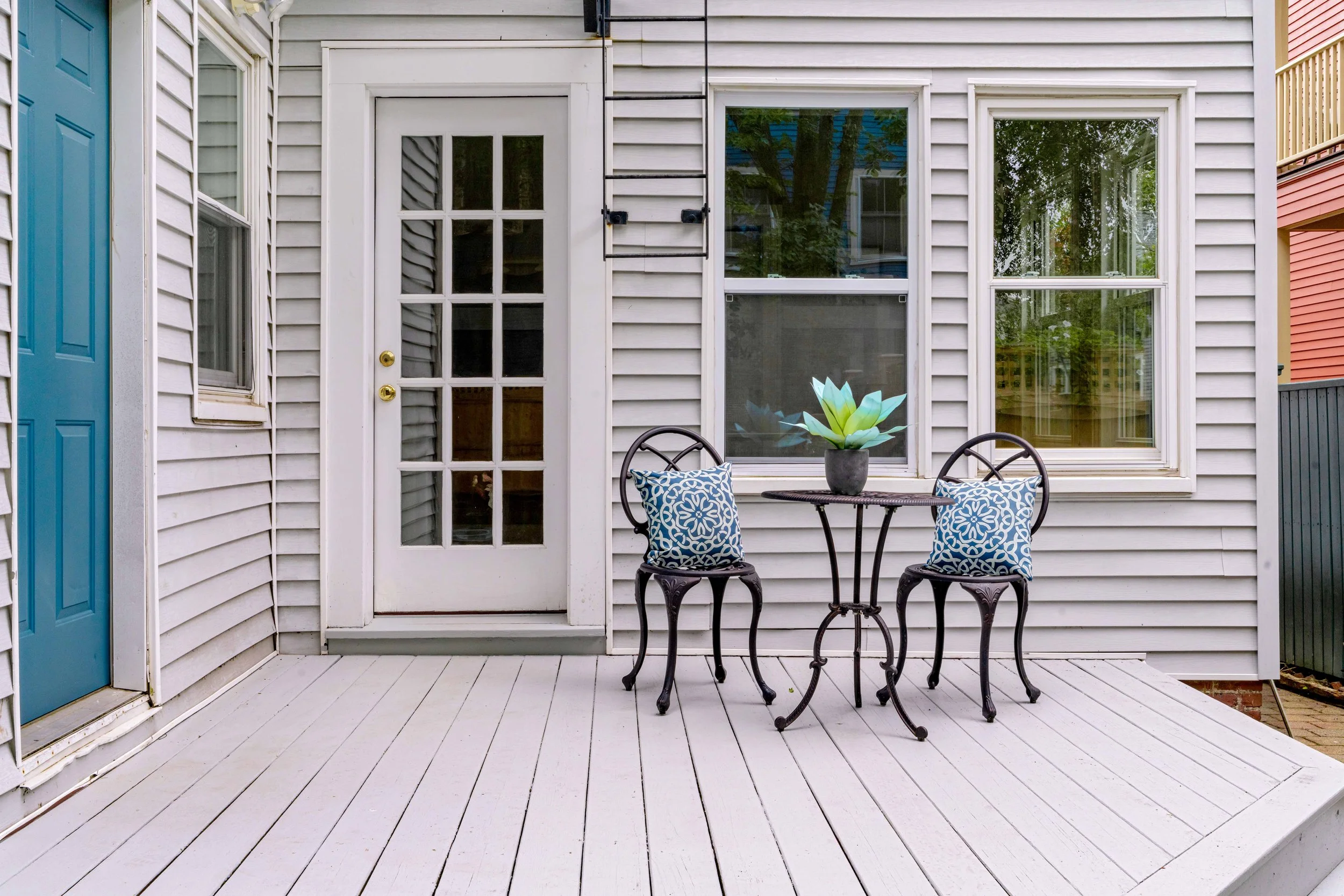 The back porch is accessed from the dining area and overlooks a shared patio and backyard.