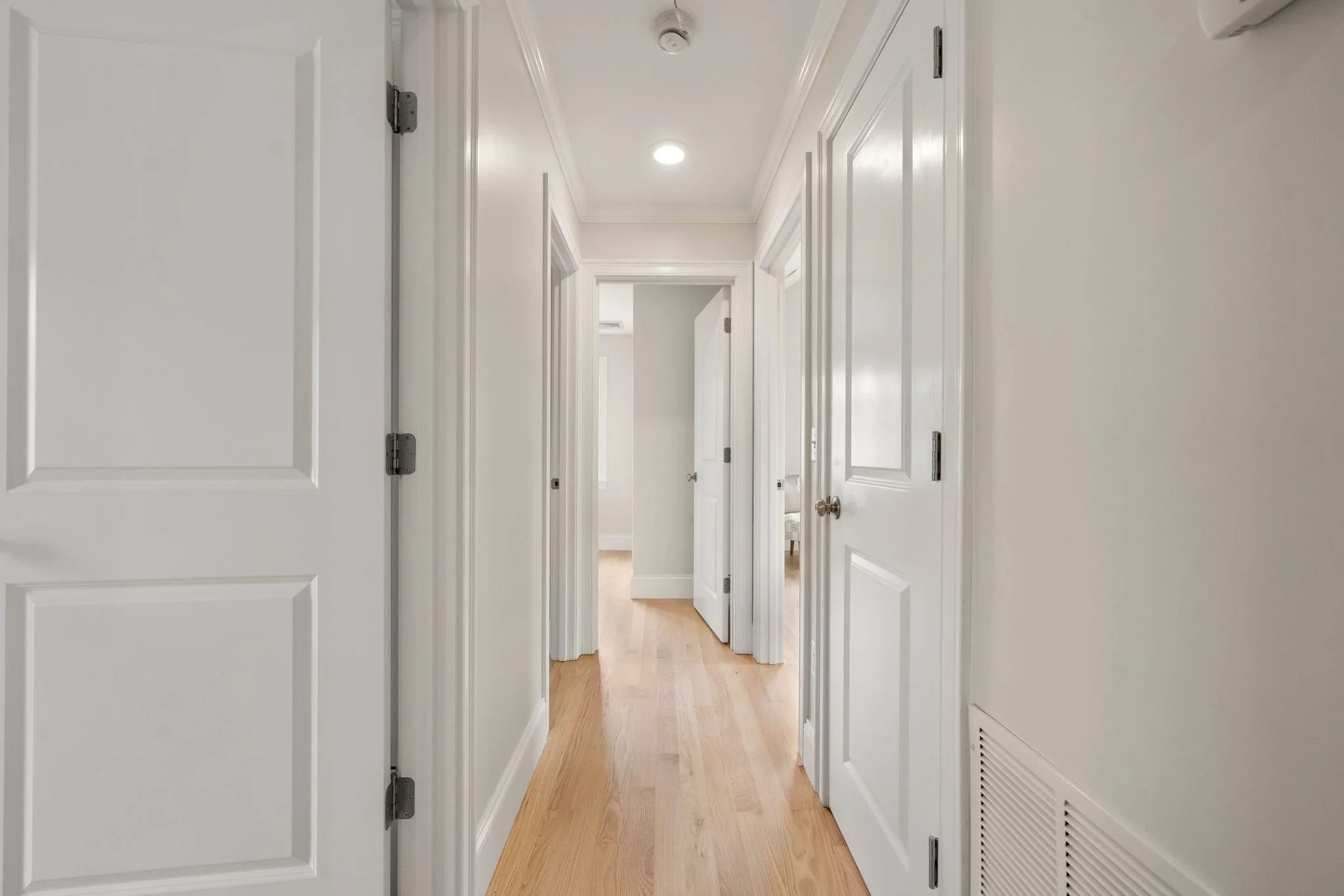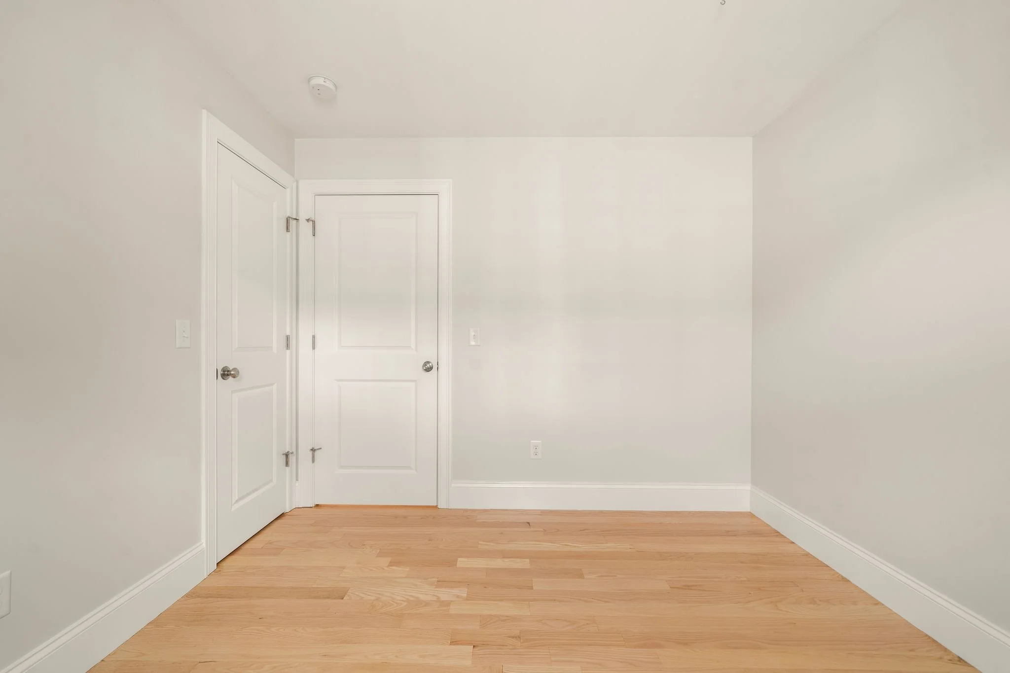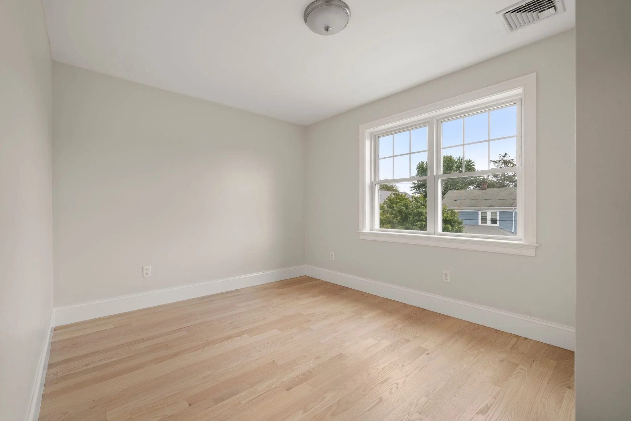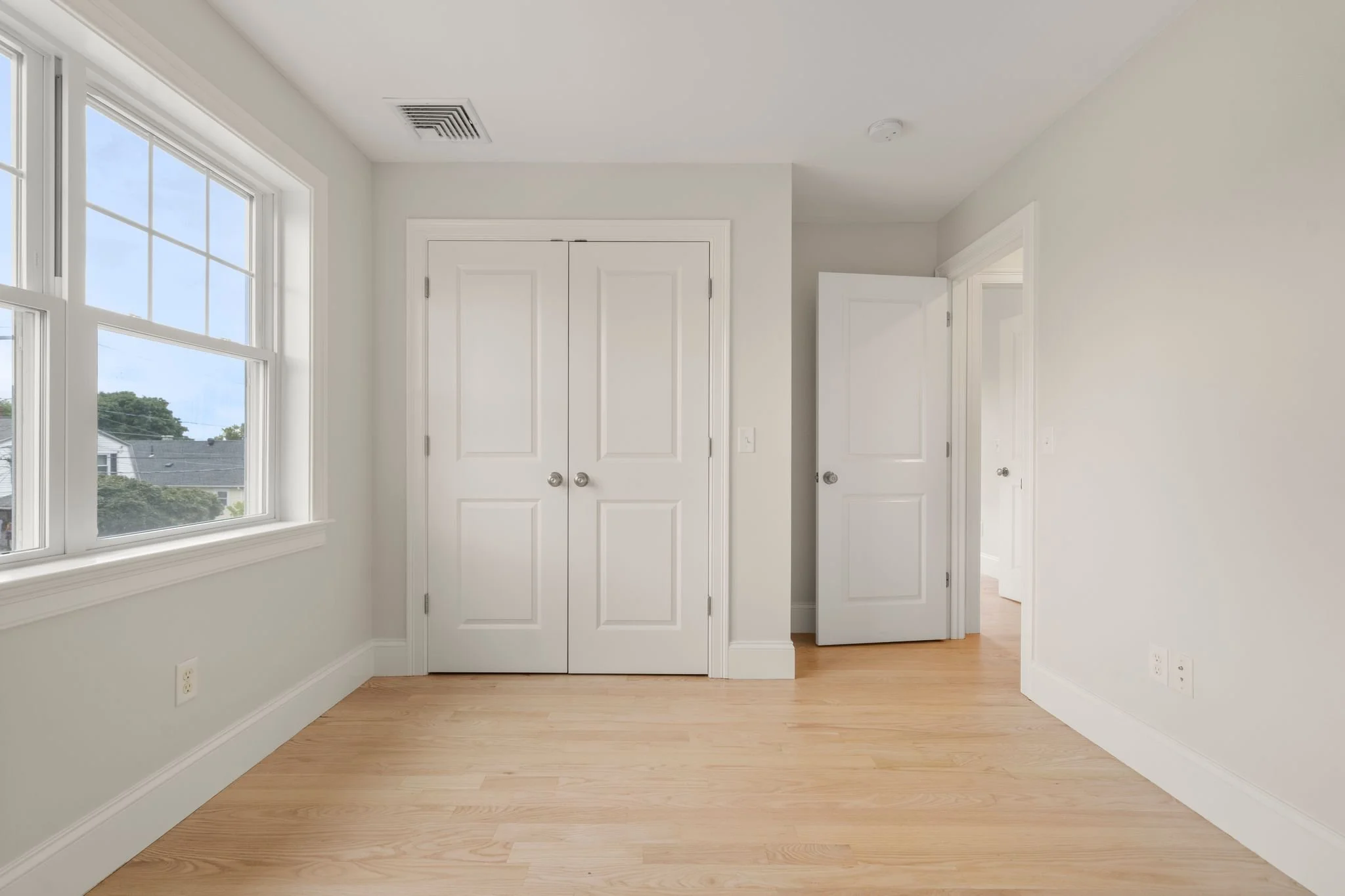 At the end of the hall is a second airy bedroom, with two large windows and a double closet.
