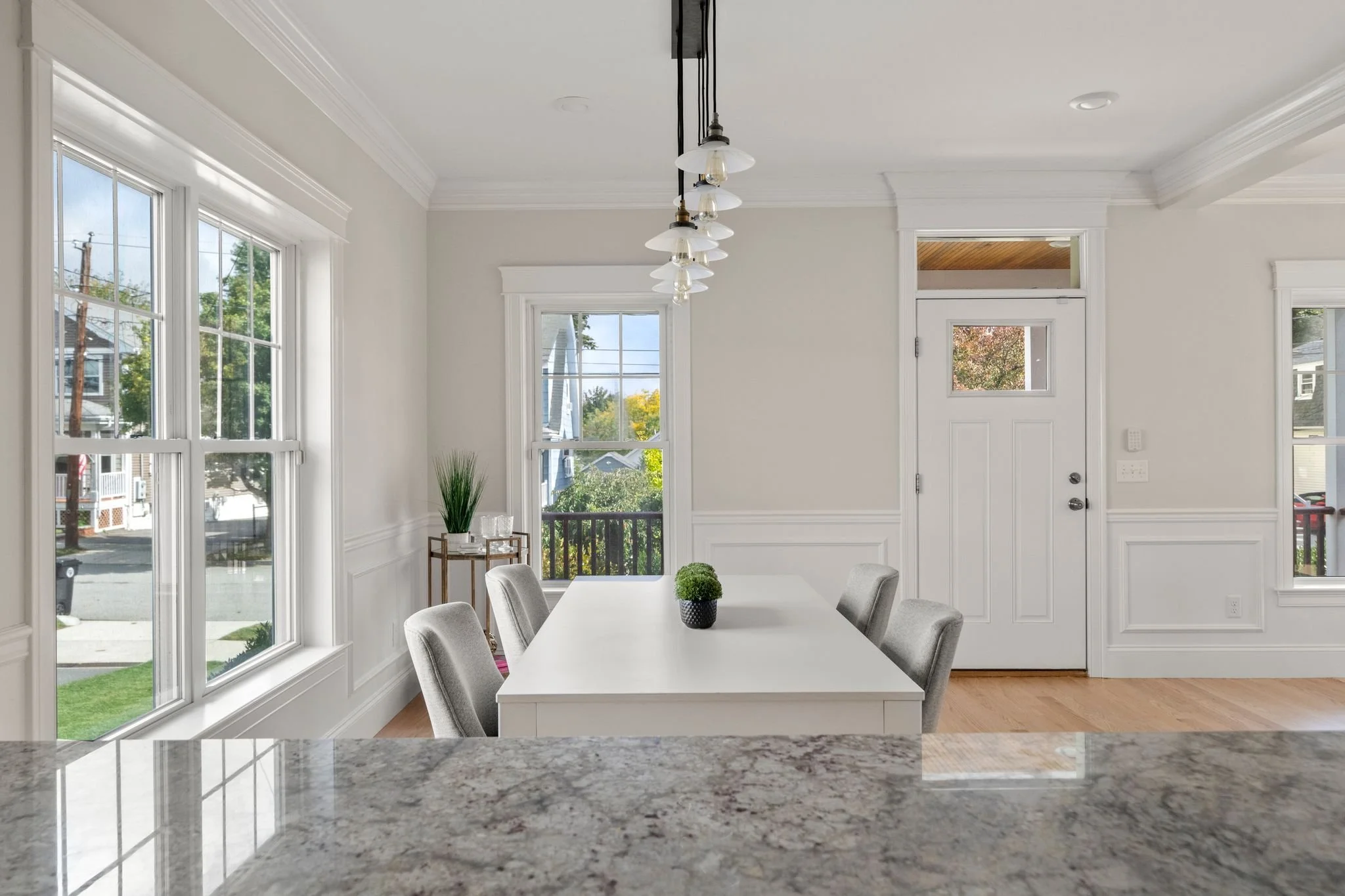The dining area is adjacent to the kitchen, easily accommodating an 8-top dining table, with an elegant 7-pendant chandelier.