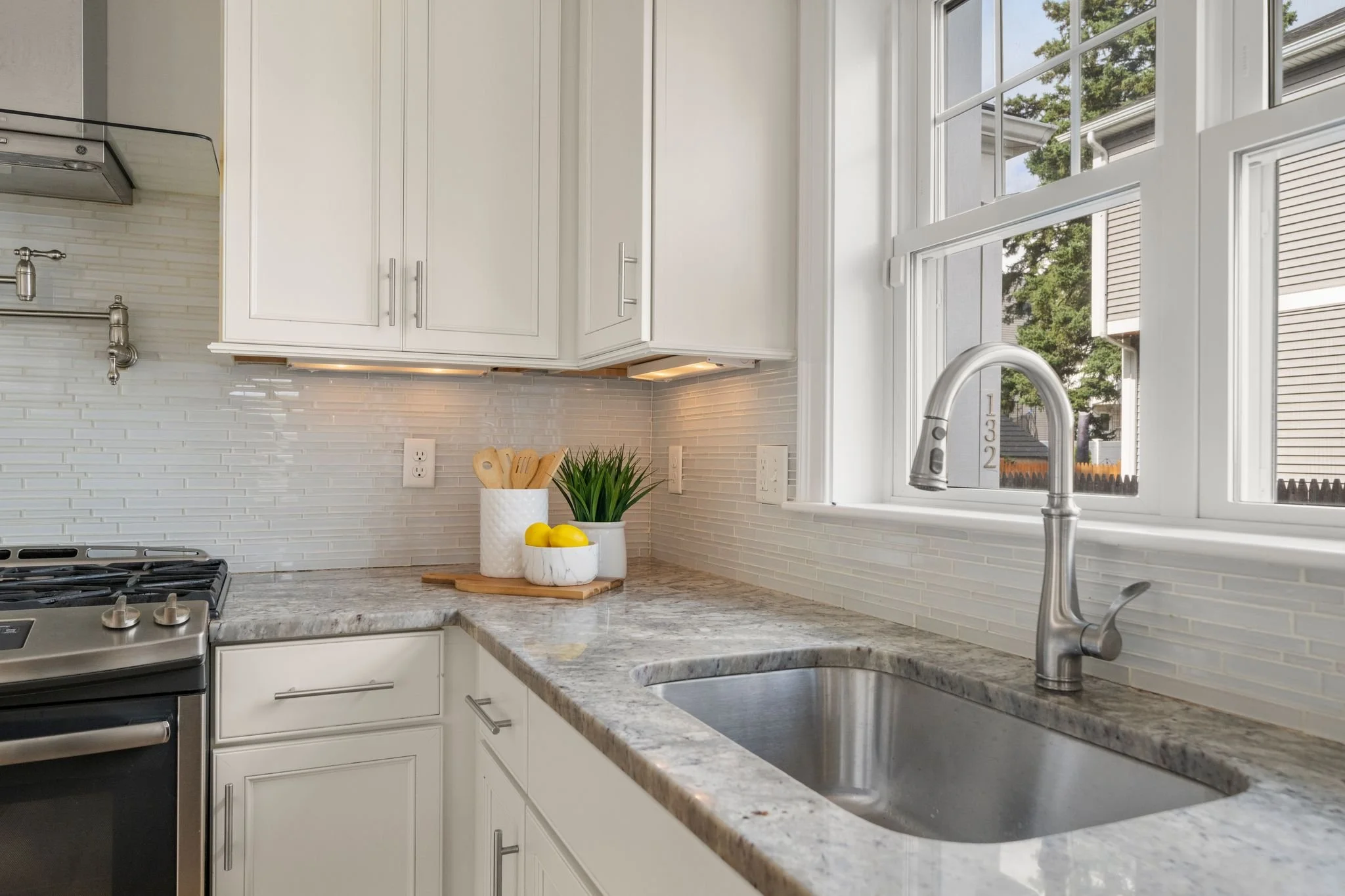 The designer kitchen features granite counters, white cabinets with brushed nickel hardware, a stainless sink and a disposal. There is bar seating at the peninsula countertop, a pantry for extra storage, and a pot filler over the GE gas range (2015). Additional appliances include a under-cabinet integrated GE microwave(2015), Profile vent hood (2015), KitchenAid dishwasher (2023), and a KitchenAid french door refrigerator with ice/water dispenser (2023).