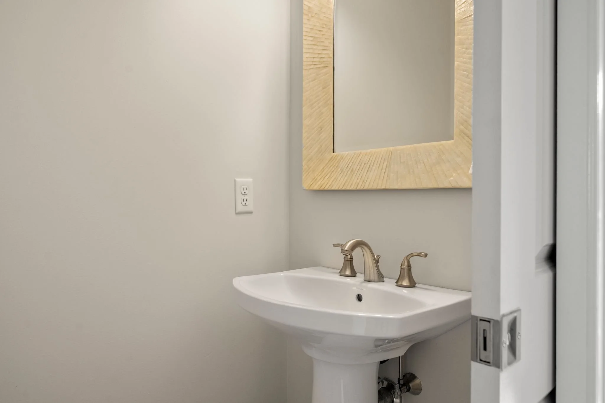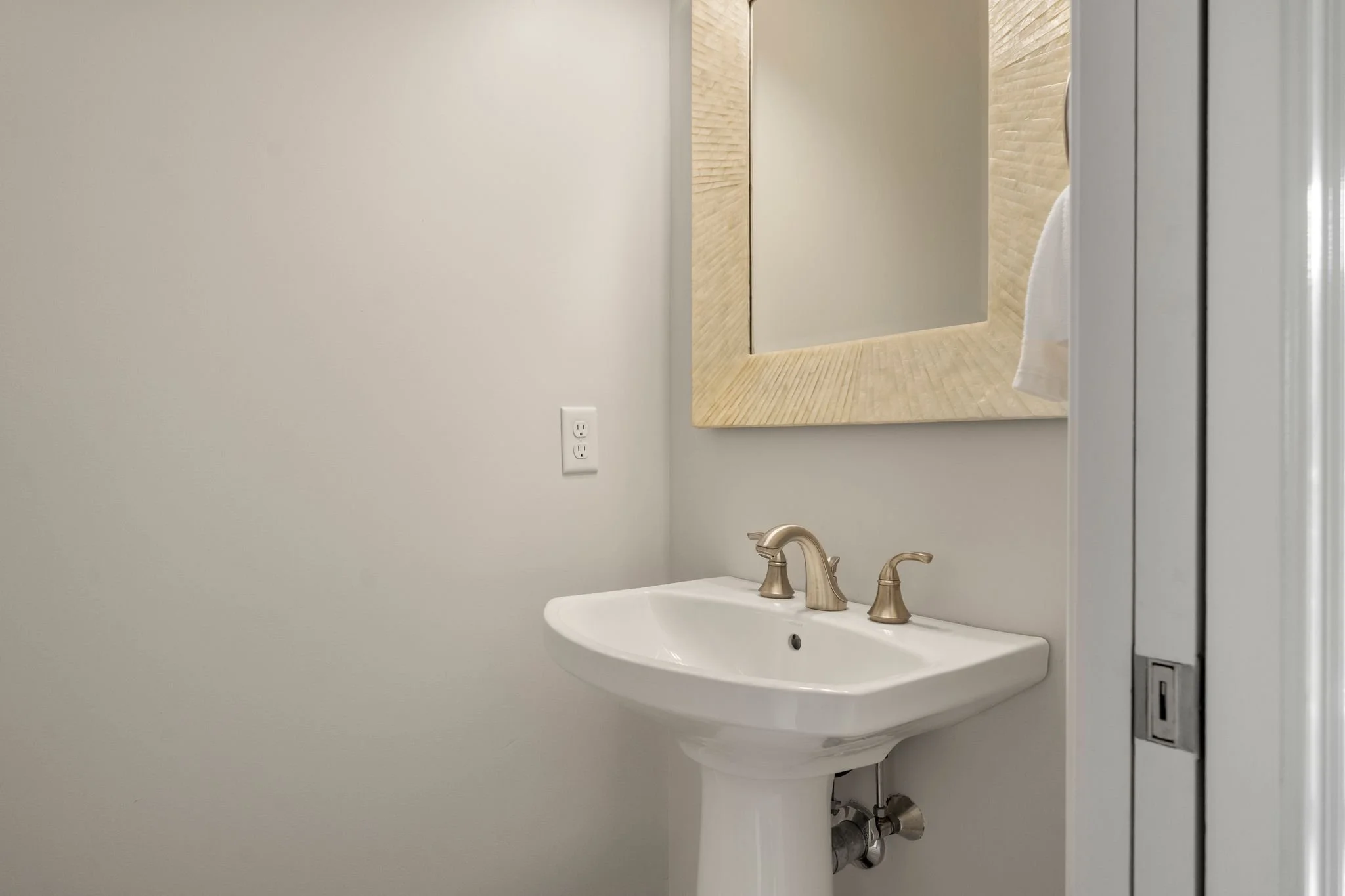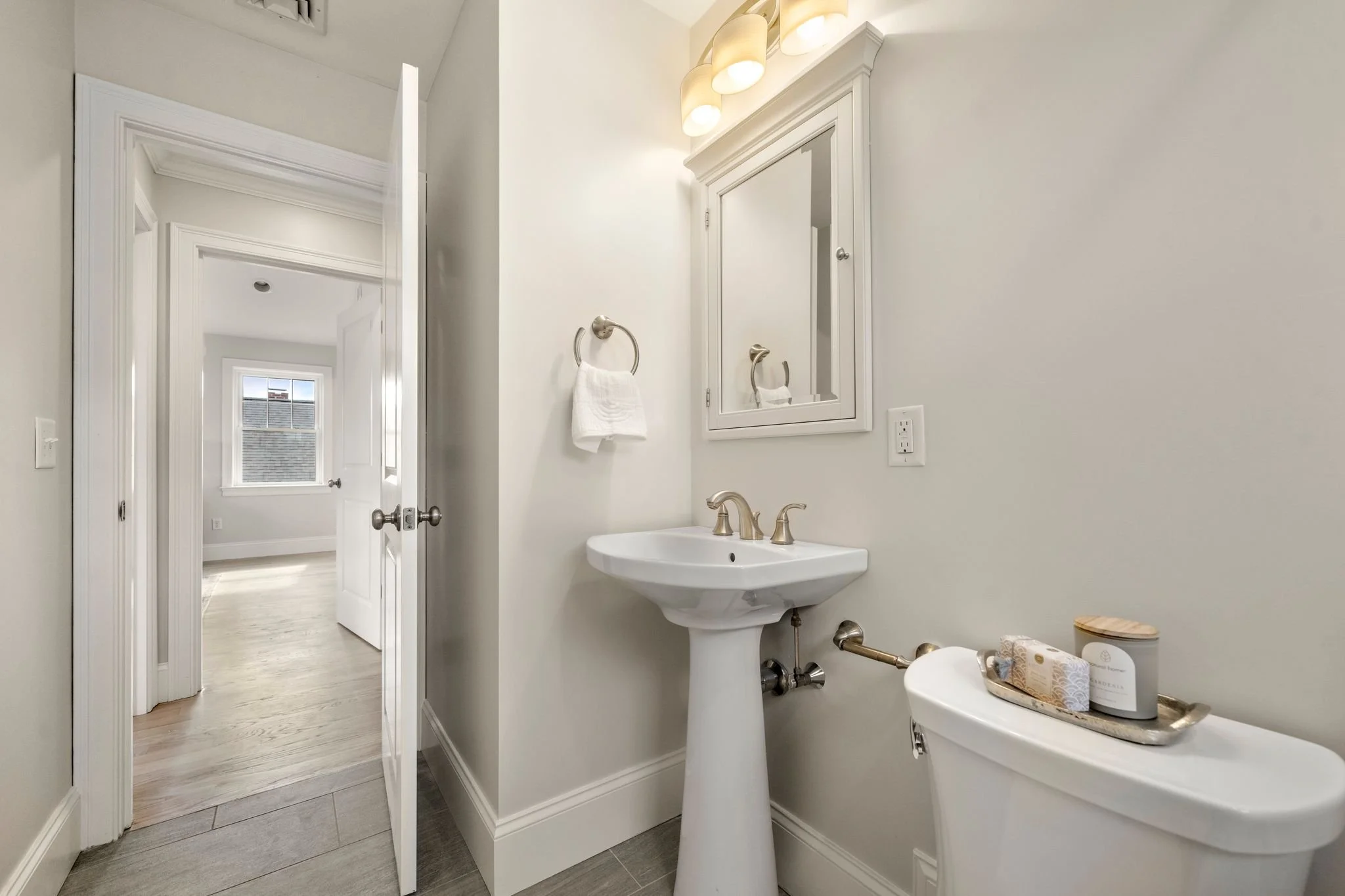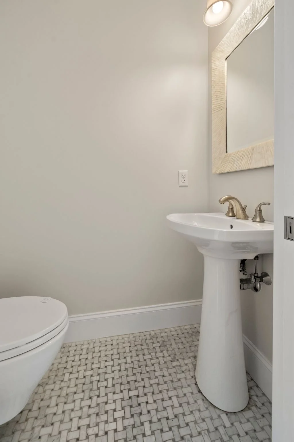 A half bath serving the main floor is neatly tucked off a hallway featuring marble flooring and kohler pedestal sink.