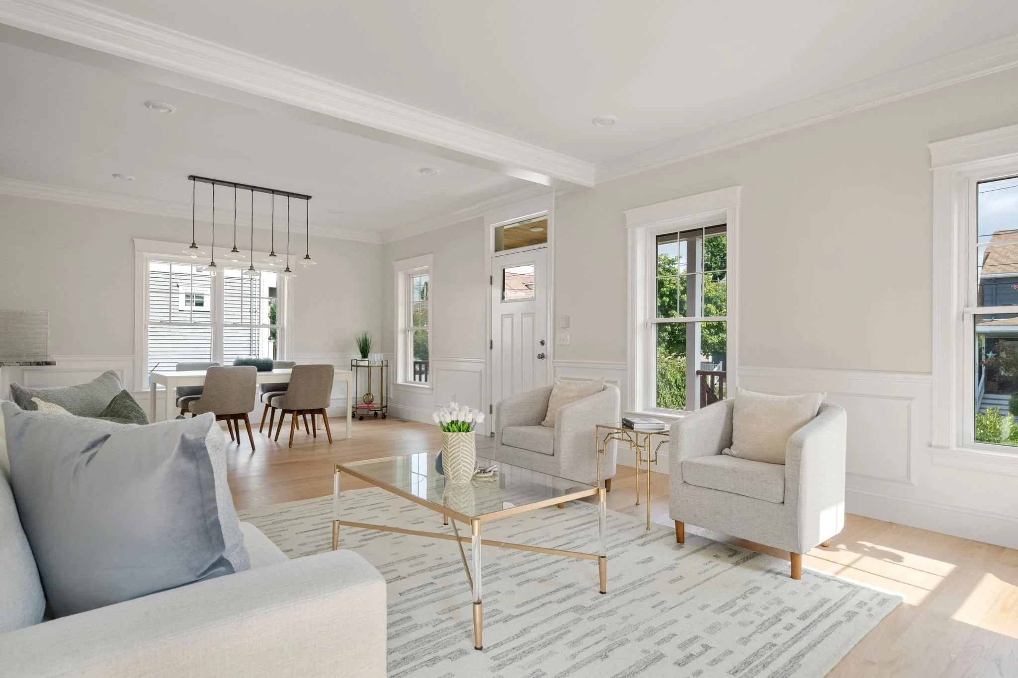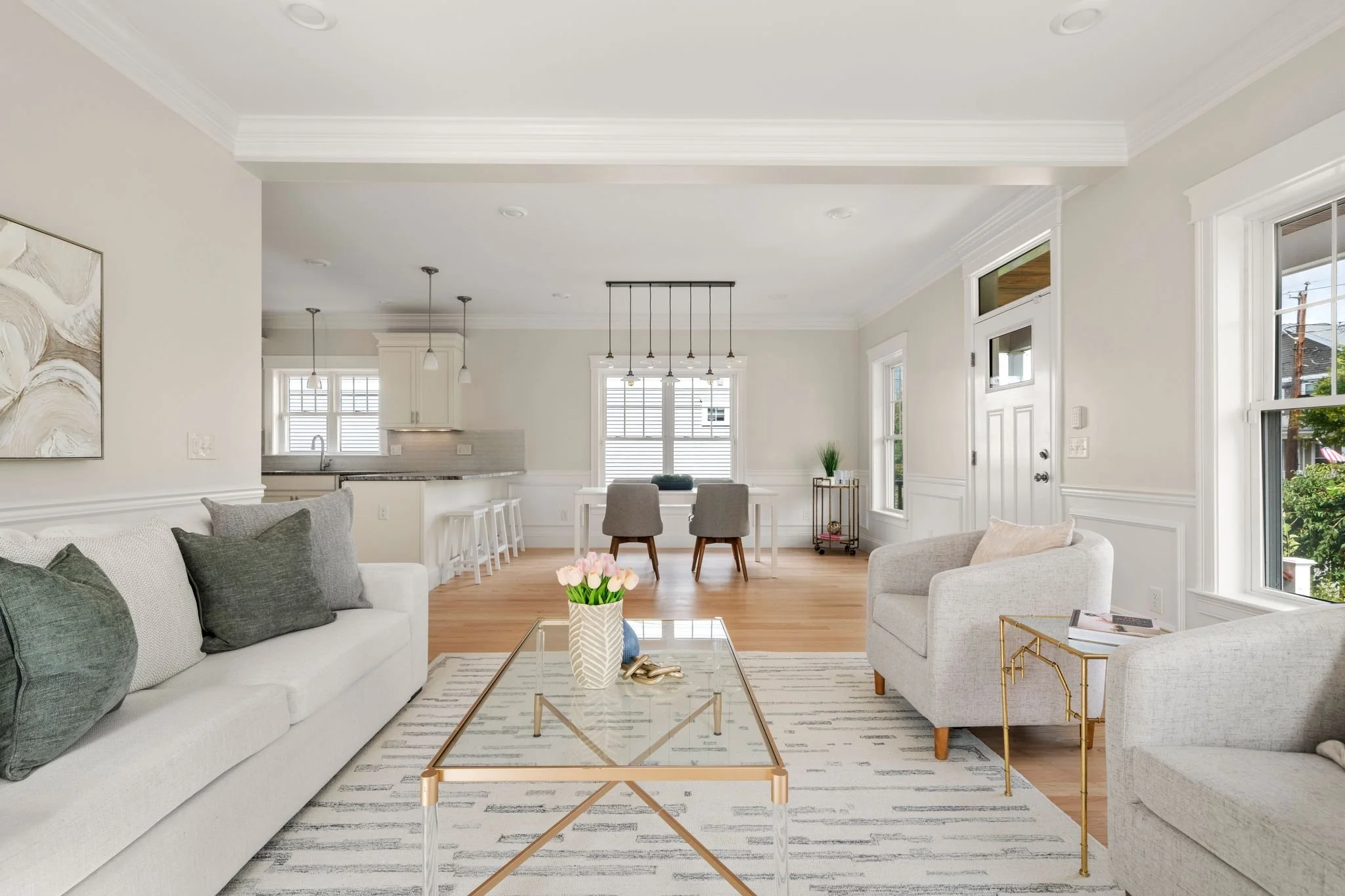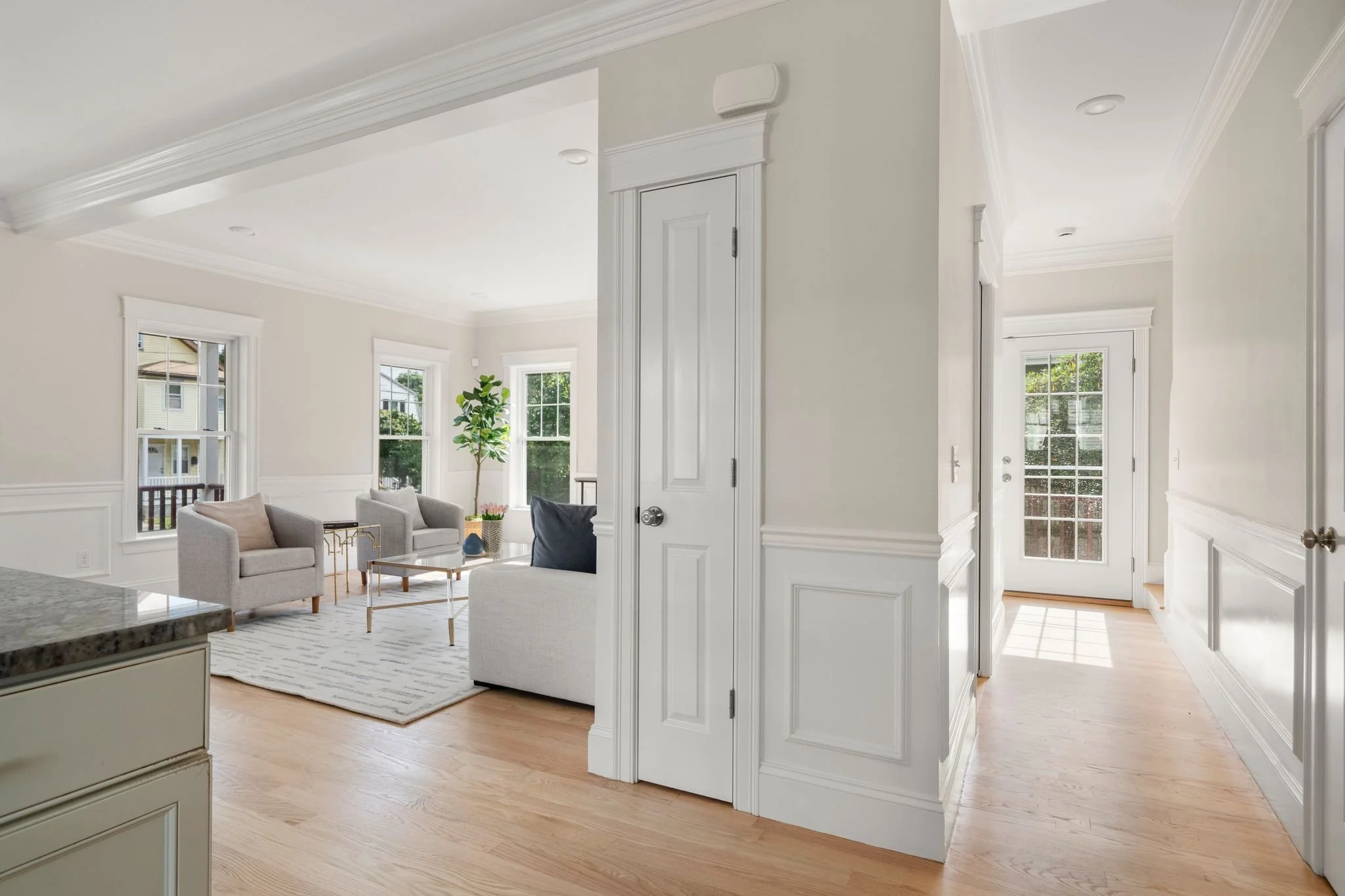 The first floor is open concept, with distinct kitchen, living, and dining areas, a coat closet, and a half bath. Oversized, energy-efficient windows provide ample natural light, complimenting newly refinished oak flooring throughout.