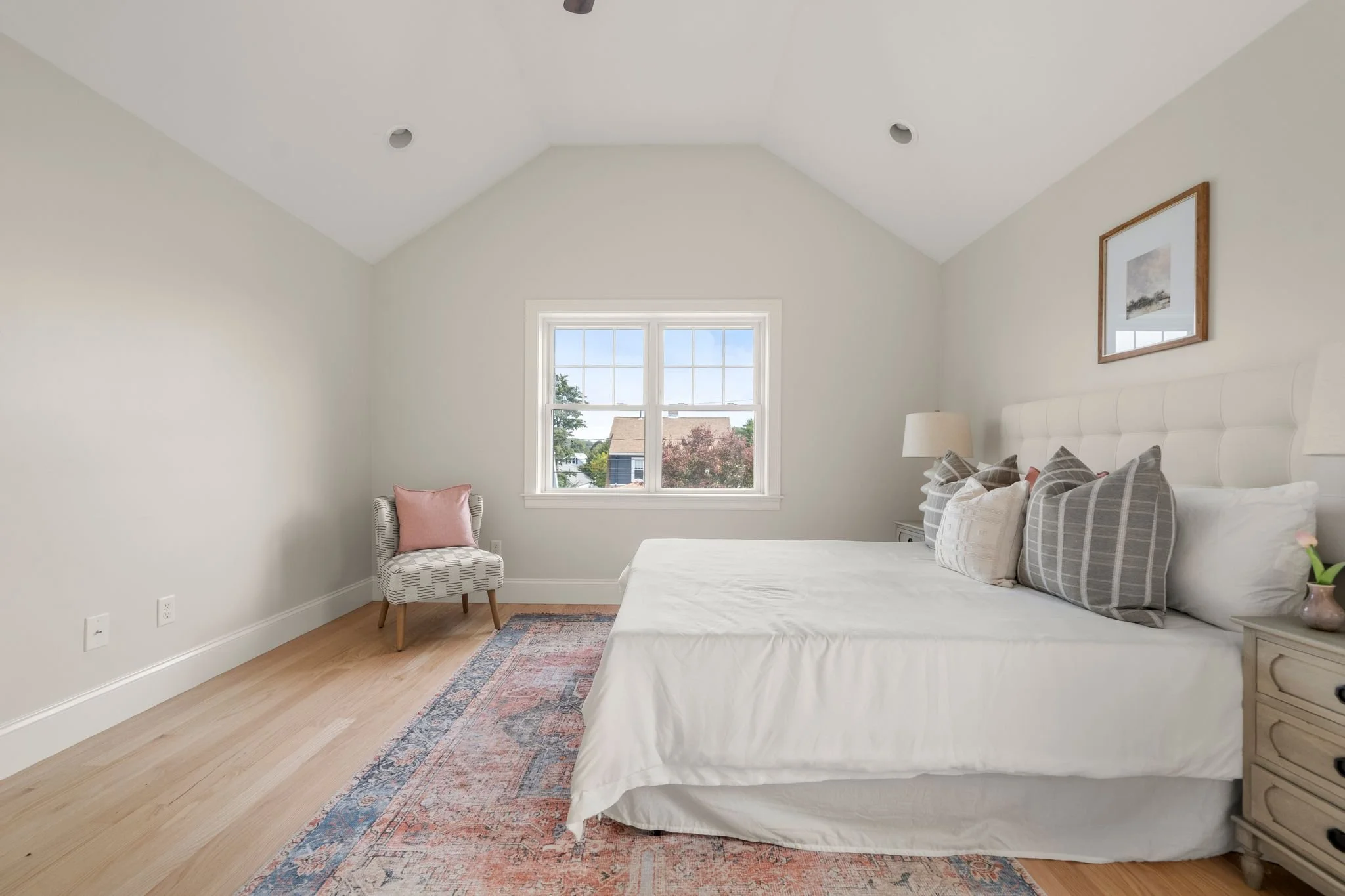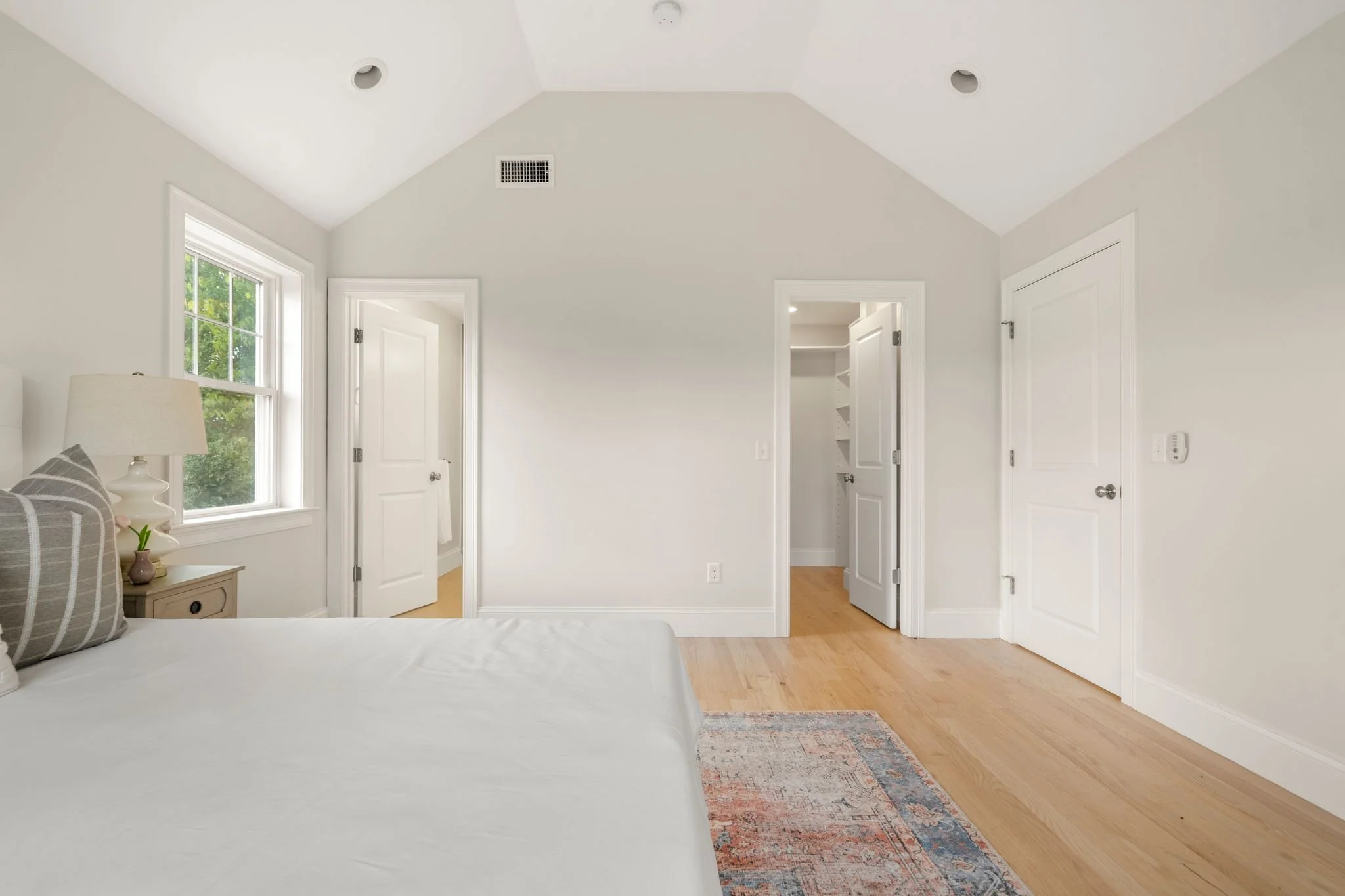 A gracious and private primary suite sits at the end of the hall on the right, with room to spare for a sitting area or additional furnishings. Vaulted ceilings and three windows allow for beautiful natural light. There is a walk-in closet, and an en suite bathroom, featuring a double vanity with ample storage and a sizable shower with tile surround.