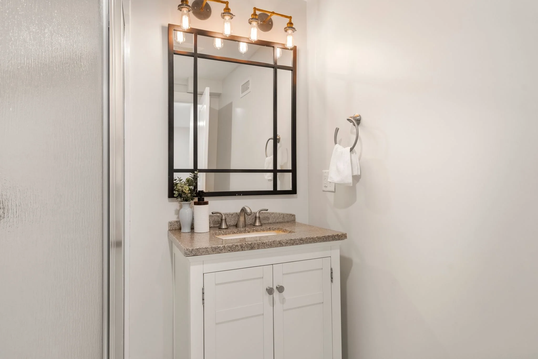 Conveniently located between the first two bedrooms is a full bath with tiled flooring, a combo shower/tub with tile surround, kohler pedestal sink, and medicine cabinet for storage.