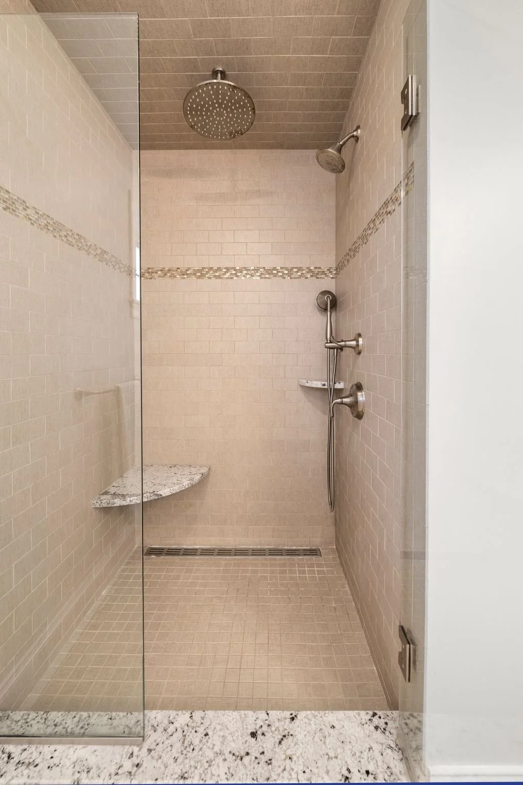 The second floor comprises three bedrooms and two full baths, including a primary suite, plus a linen closet.