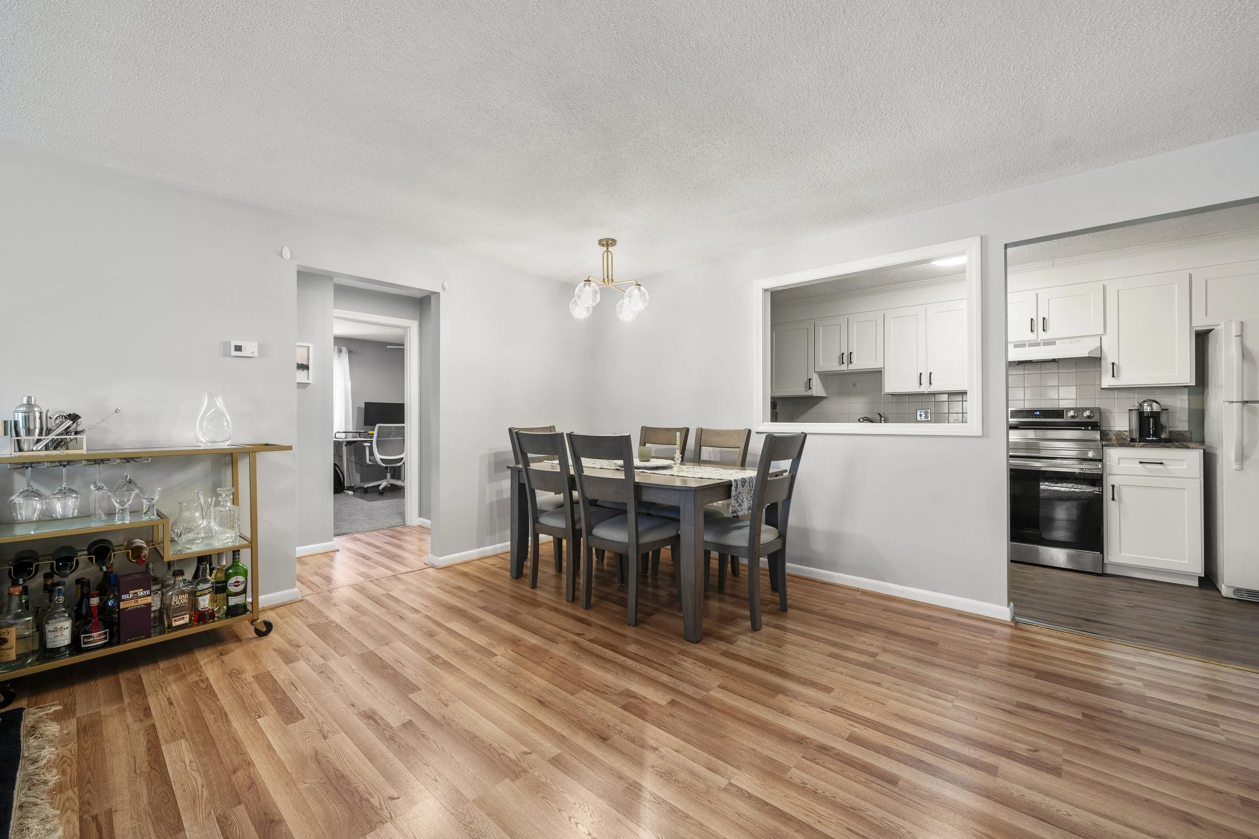 The dedicated dining area is illuminated by an orb chandelier, outfitted with 4 round glass bulbs and a bronze finish. The space is large enough to accommodate a rectangular table with seats for 6 - 8 people.