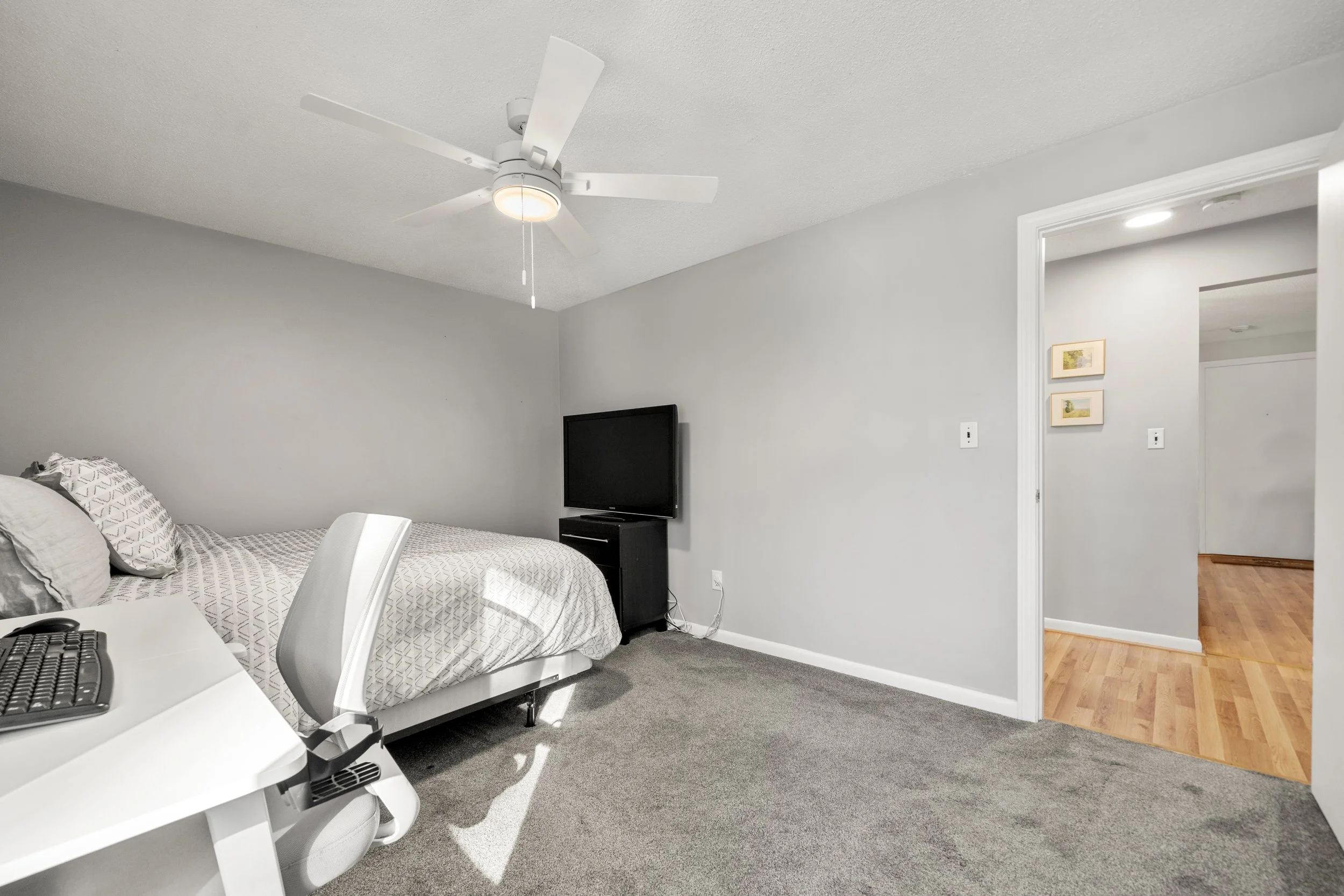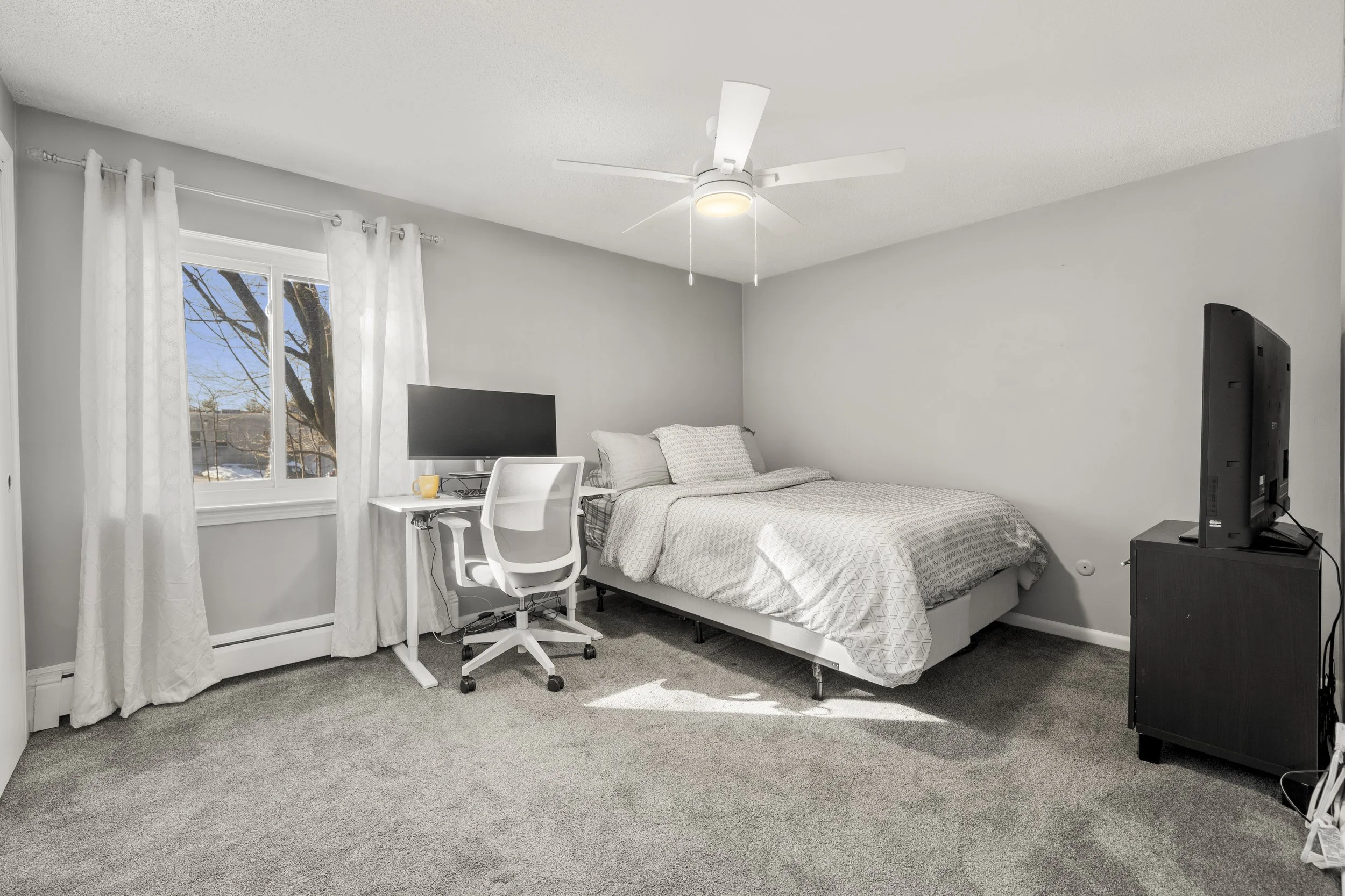 Each bedroom is generously sized with ample closet space, a window, and new carpet. The primary bedroom has a new wall mounted AC unit, and the secondary bedroom can serve as a private retreat for guests while doubling as a home-office.