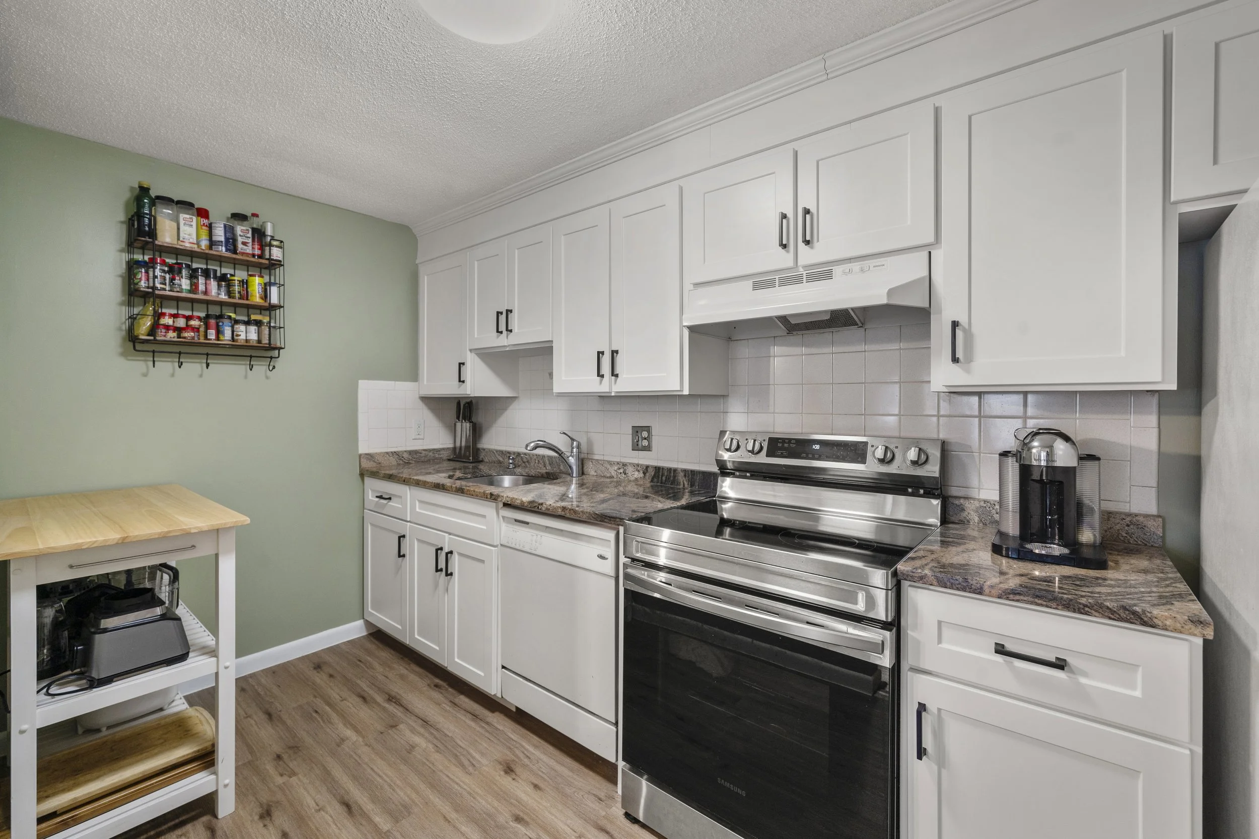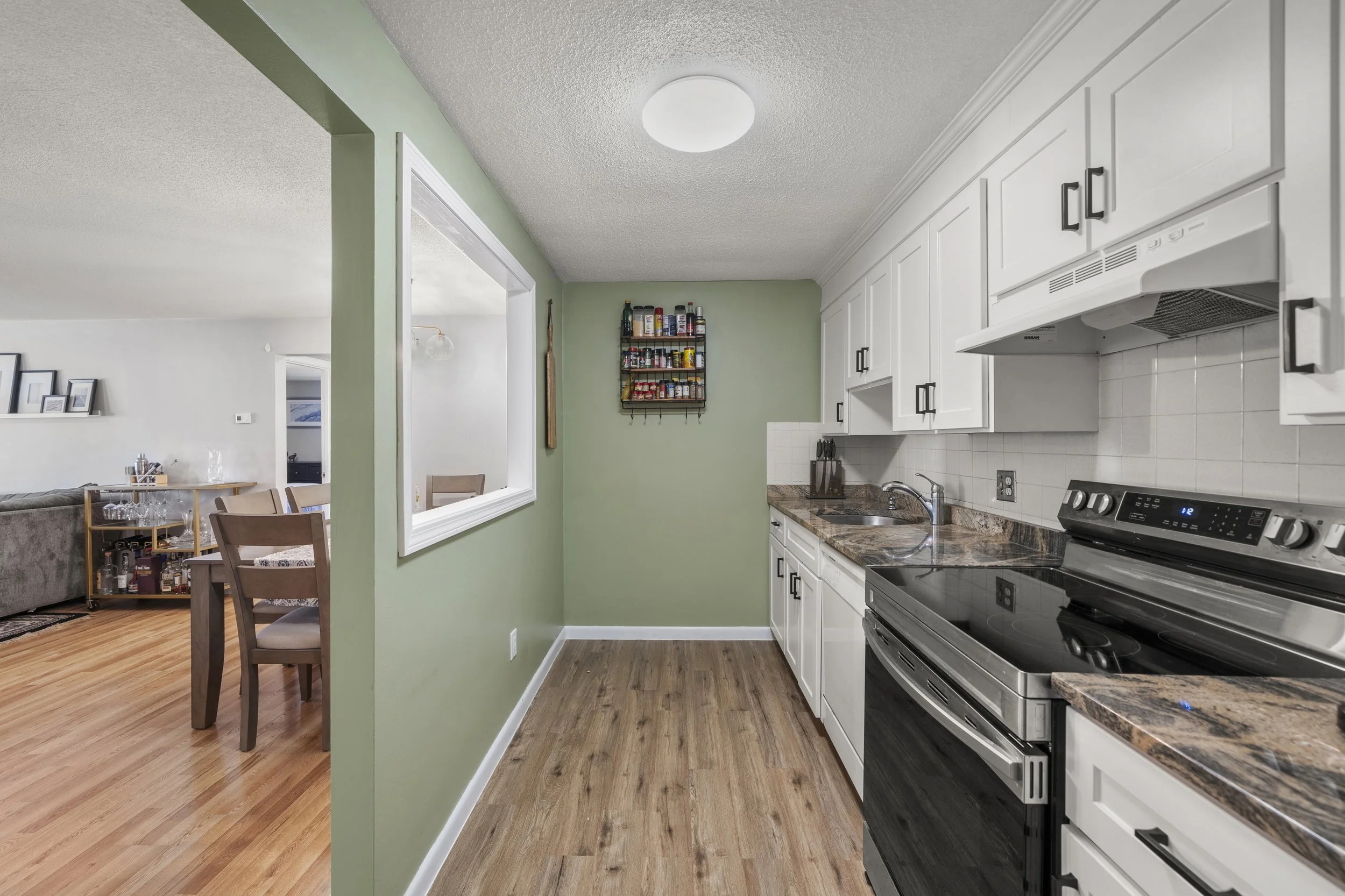 To the right of the dining room is the kitchen, featuring updated LVP flooring, granite countertops, and white cabinets with sleek modern pulls. It is equipped with an electric stovetop, dishwasher, refrigerator, and a sizable pantry. Adjacent to the sink, there is ample space for an additional storage cart or cabinet, providing extra counter space and added convenience.