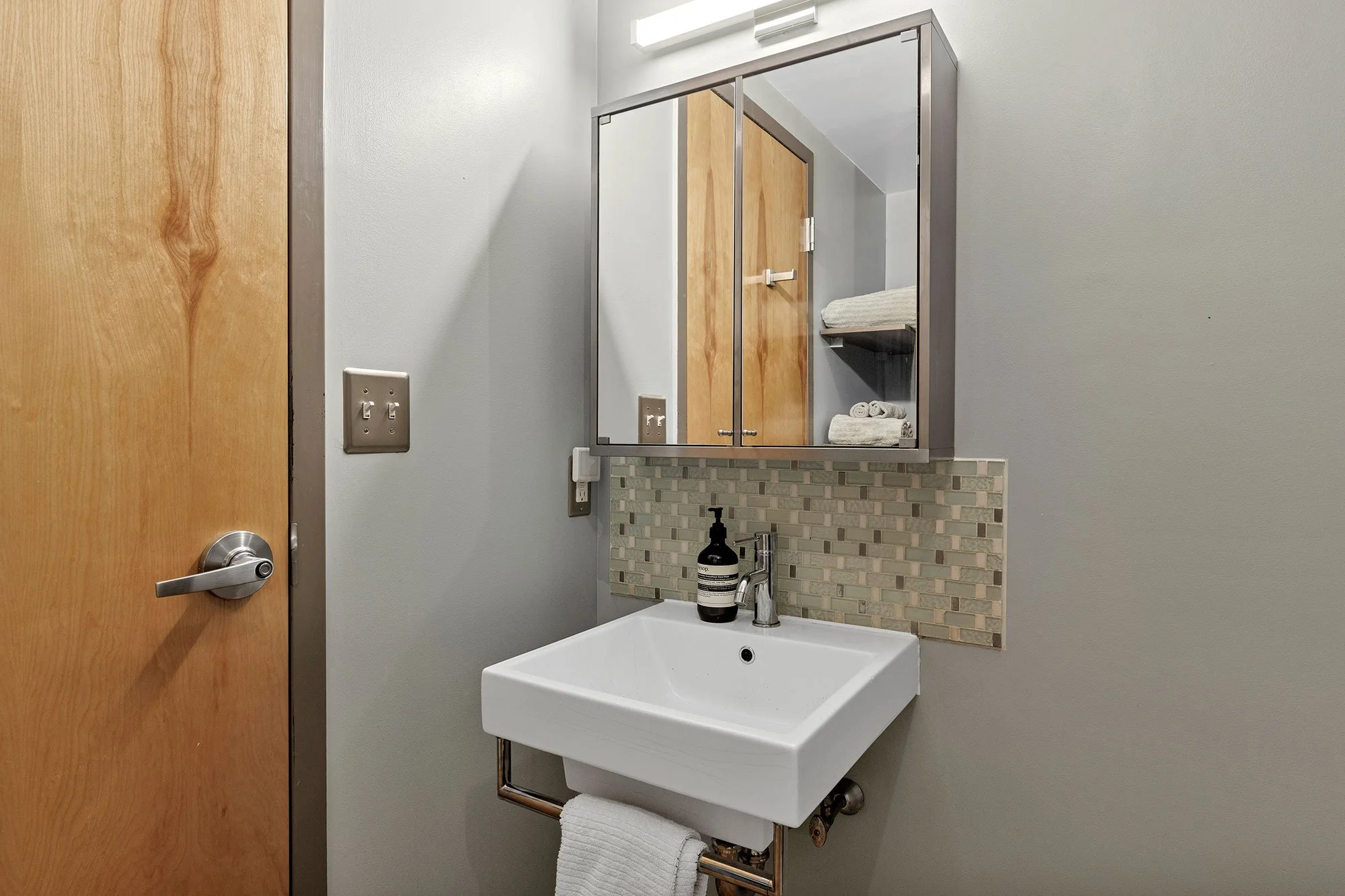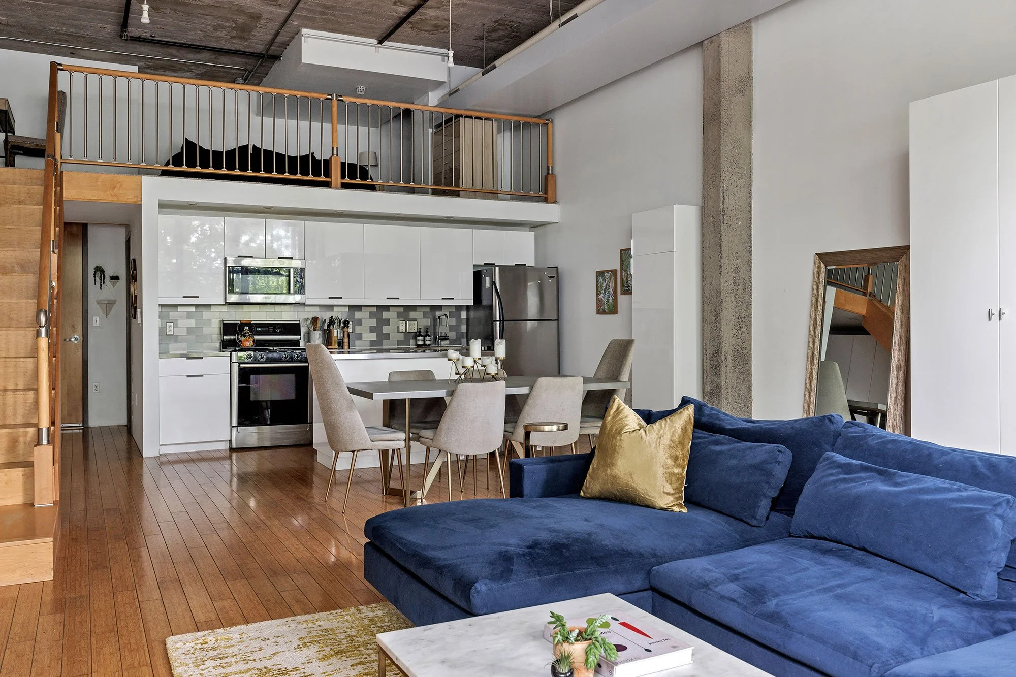 Entering Unit 113, there are convenient coat hooks, perfect for your everyday carry and coats. Stunning geometric built-ins are fitted to the entryway and nestled under the loft stairs, providing additional storage. Custom-designed by a local architect/artist to fit the space, there is also a secret bar car that wheels out to serve (and impress!) your guests.