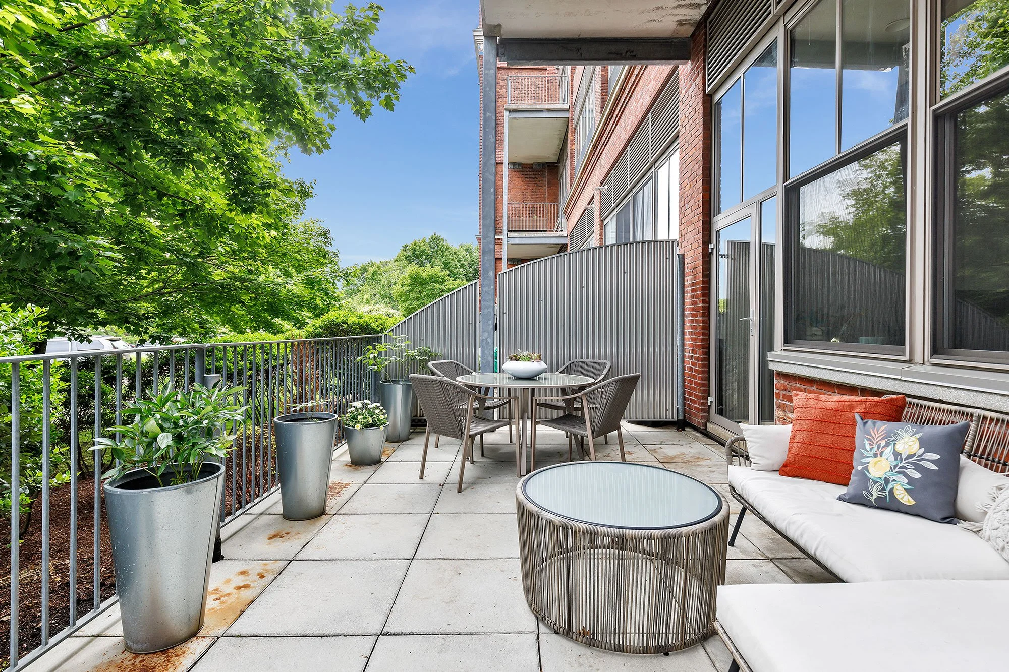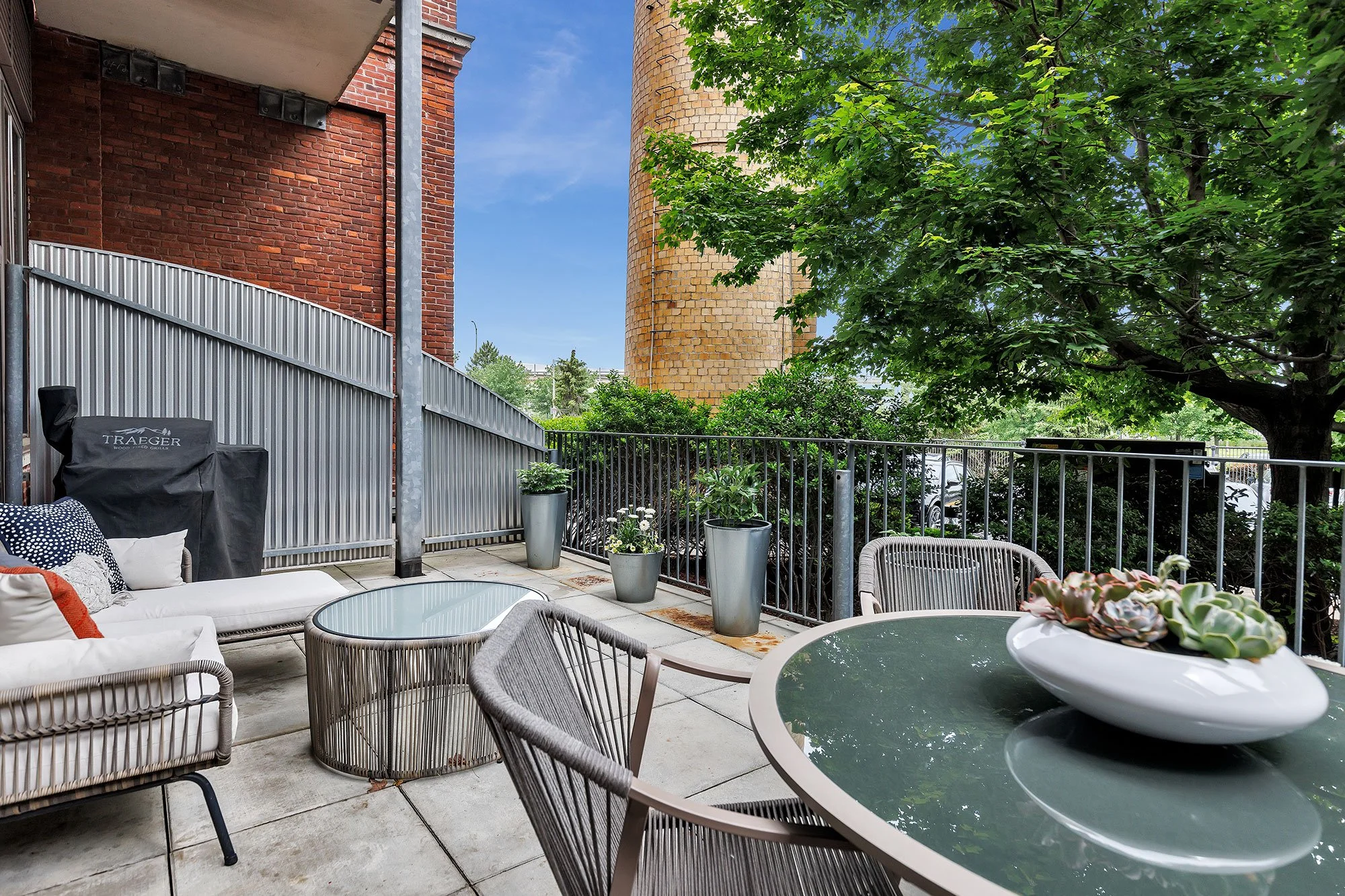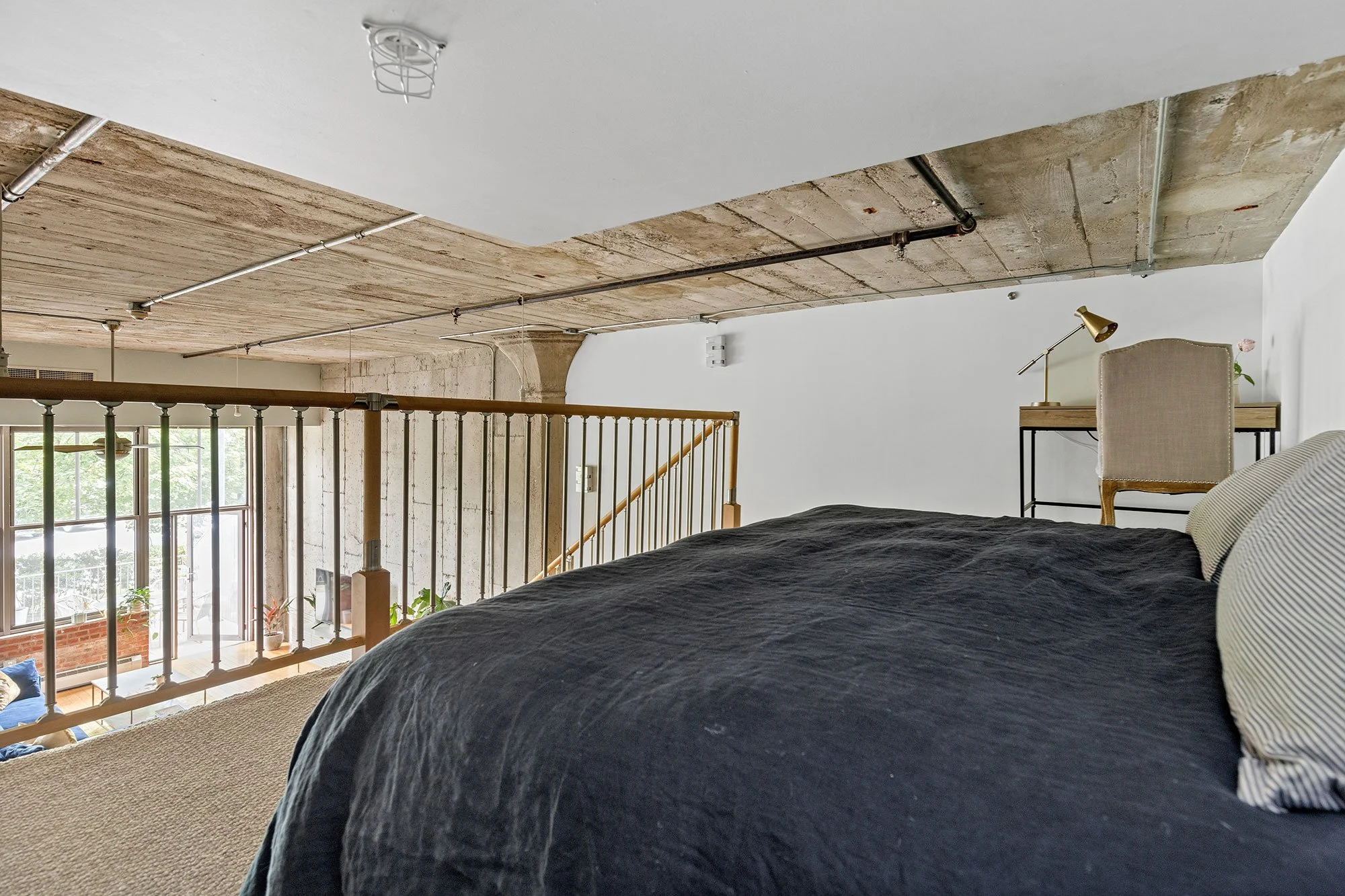 The living space at the back of the loft is nearest to the breathtaking, oversized windows, overlooking a large private patio and the neighboring park.