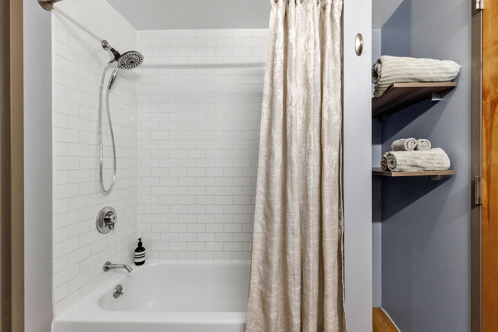 The bathroom sits apart from the living area, located near the entry. It features a shower tub combo, and storage shelving.