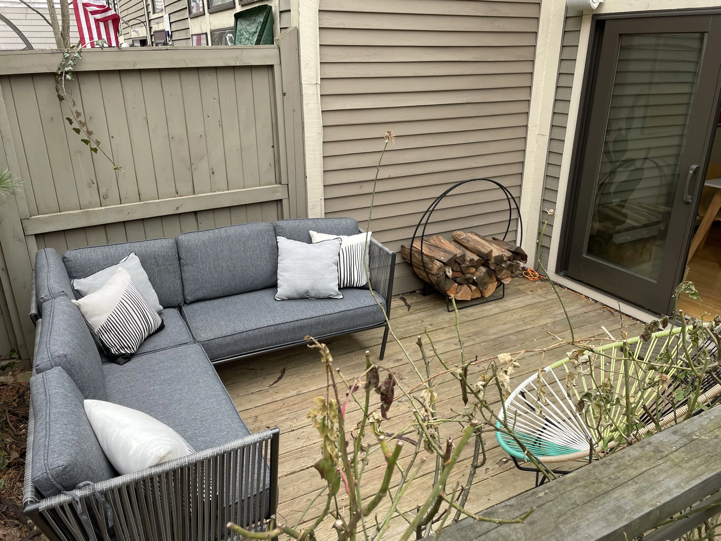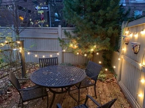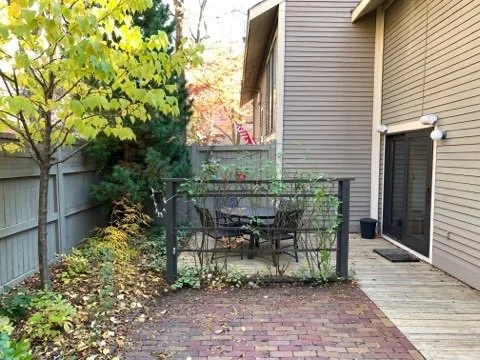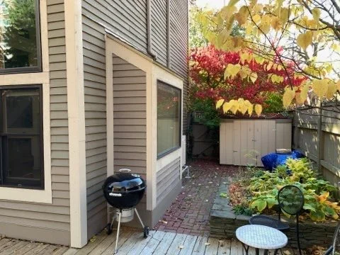 Private fenced-in and landscaped yard includes a wooden deck, a brick patio, and wall-mounted Polk outdoor speakers (included in the sale). Mature plantings include a lovely pine tree, two Japanese Lilac trees, hydrangea, fern, and other perennials. A raised bed is surrounded by a stacked stone wall and ready for your veggie or flower garden! There is also a large landscaped area on the right as you enter the courtyard that belongs to this house.