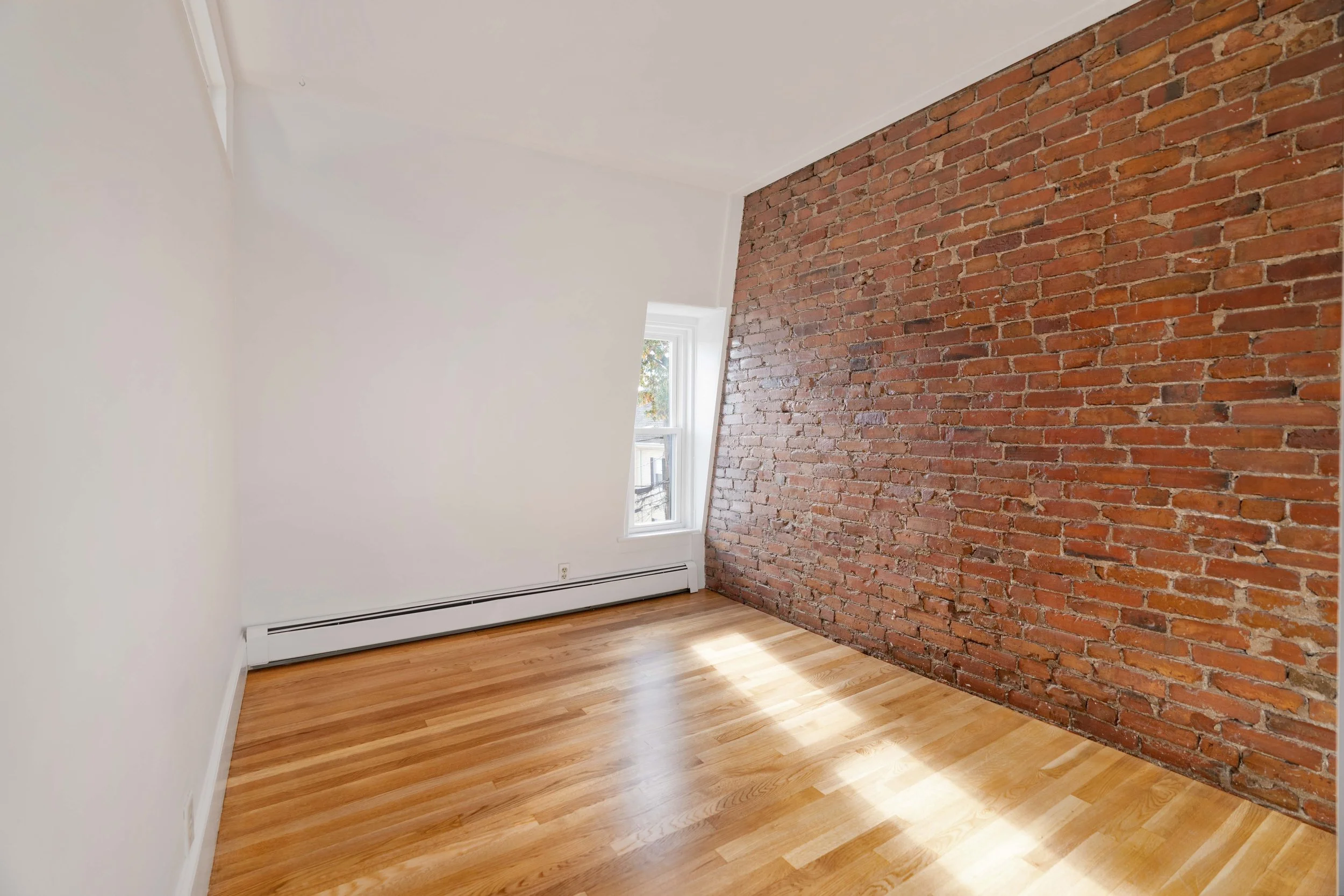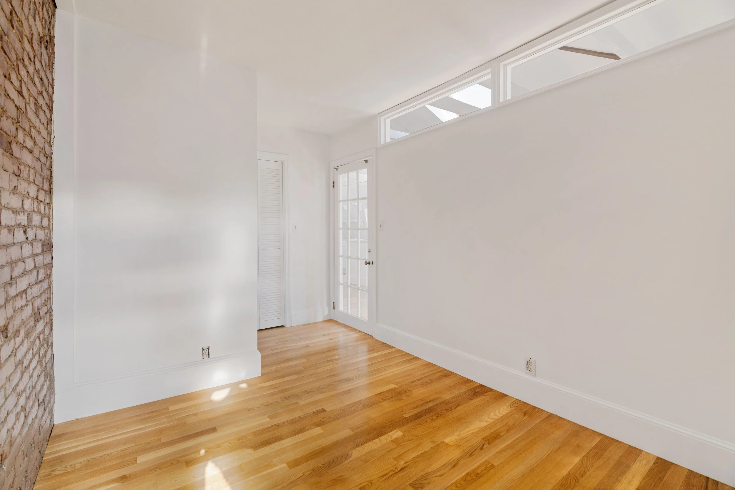 To the right of the living room behind an interior French door, is the ever-charming bedroom with two clerestory windows, an exposed brick wall, gorgeous wood flooring, lighted closet, and a window.