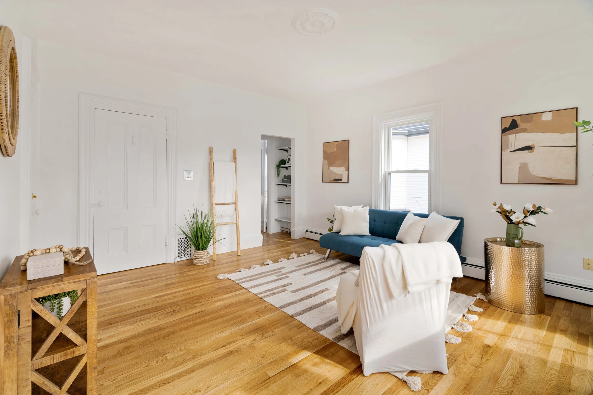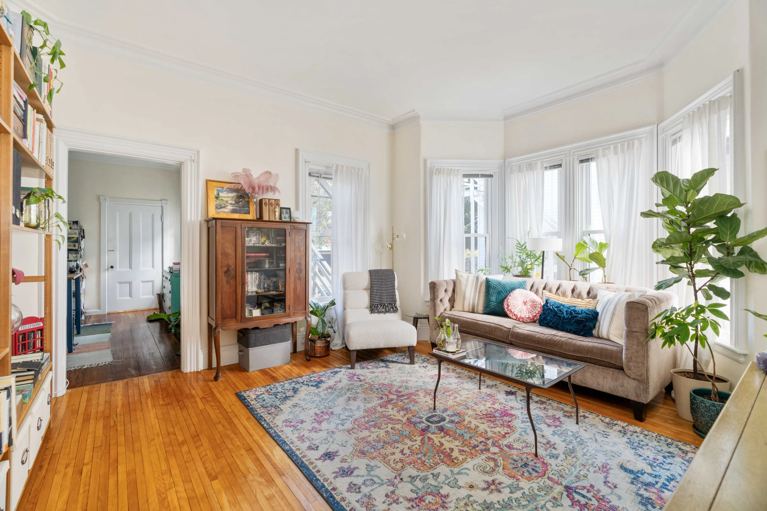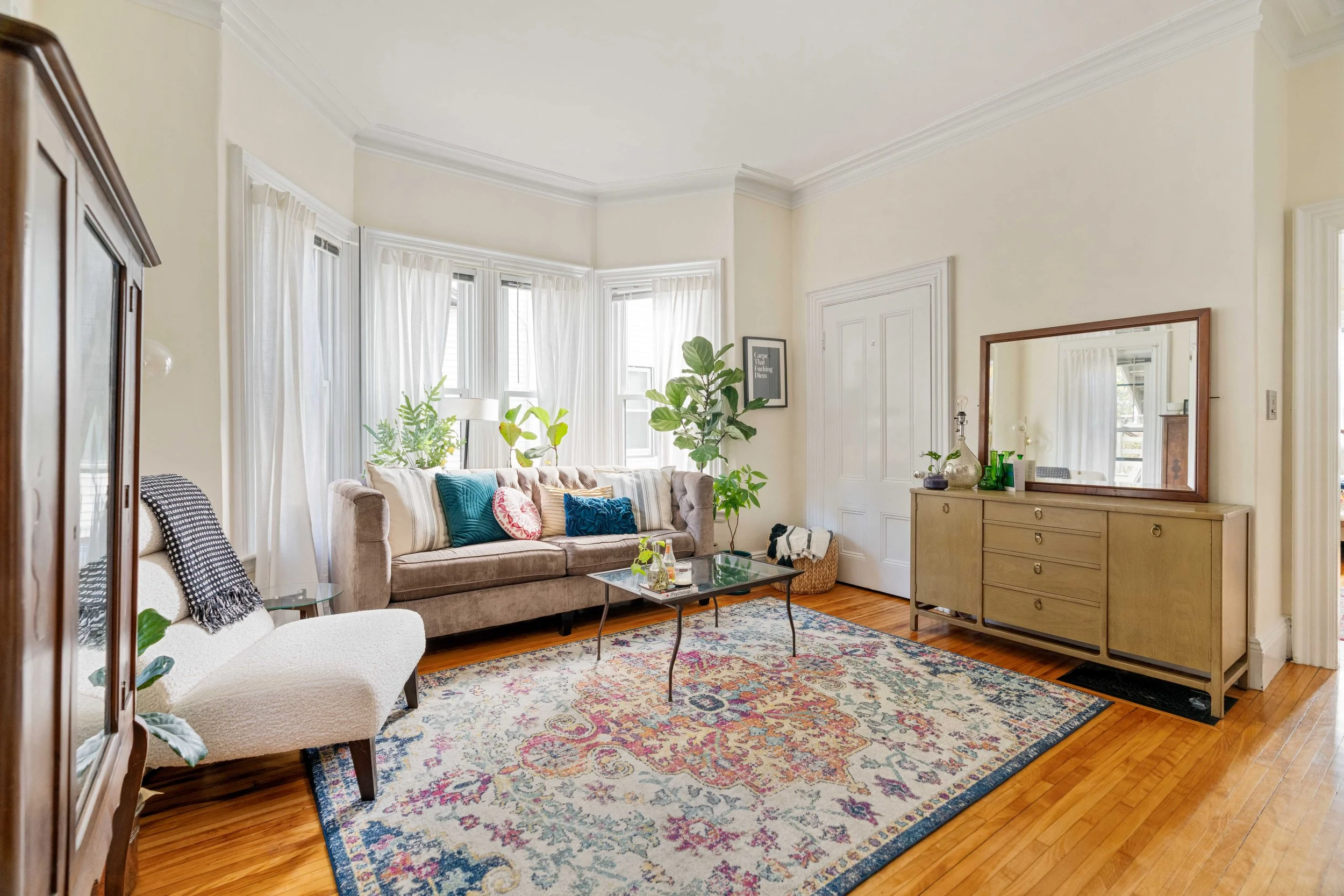The elegant living room has high ceilings, maple floors and a bay window. Period crown moldings and extra wide window casings highlight this bright and welcoming space. A large closet provides good storage.