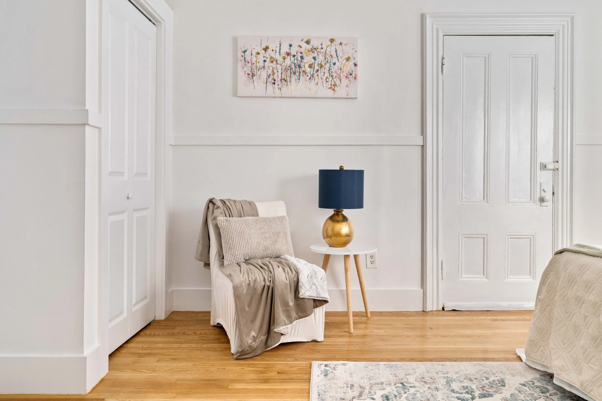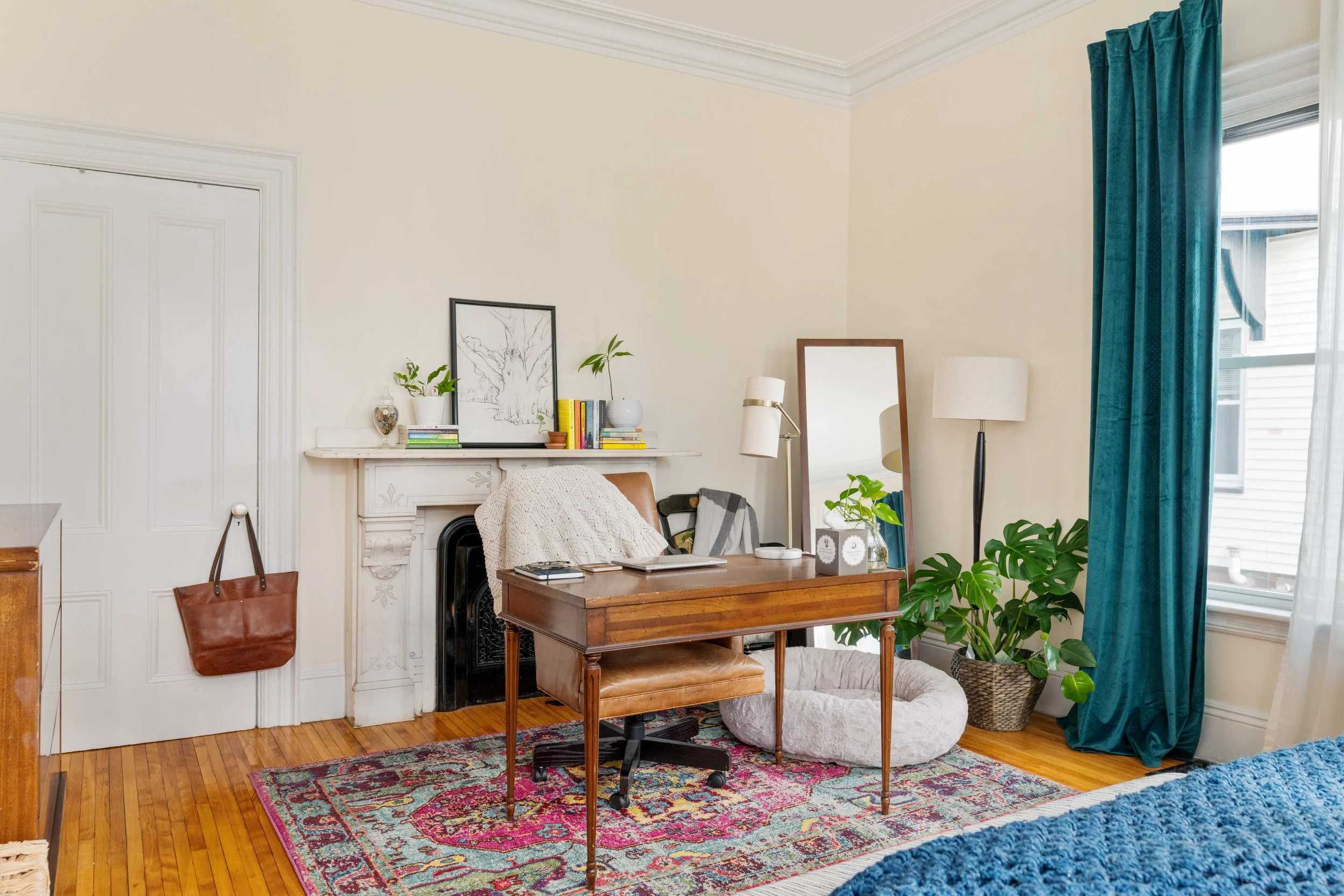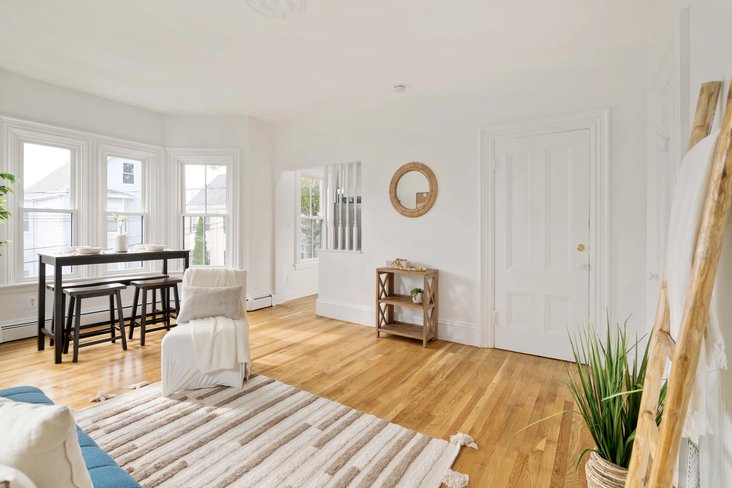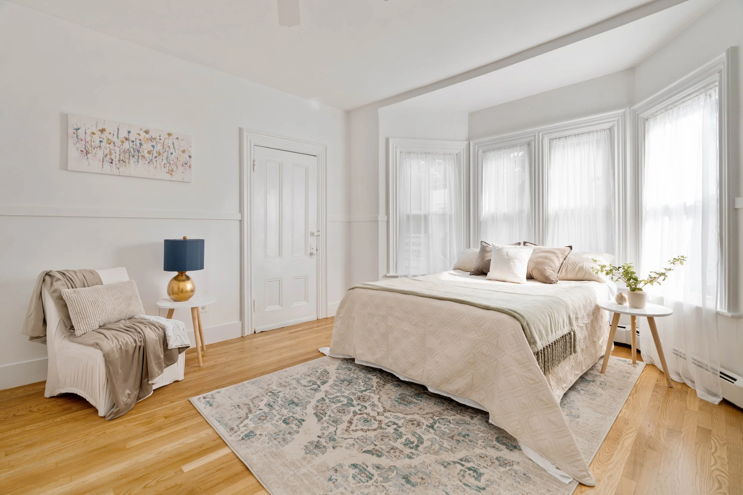 The elegant living room has high ceilings, maple floors and a bay window. Period crown moldings and extra wide window casings highlight this bright and welcoming space. A large closet provides good storage.