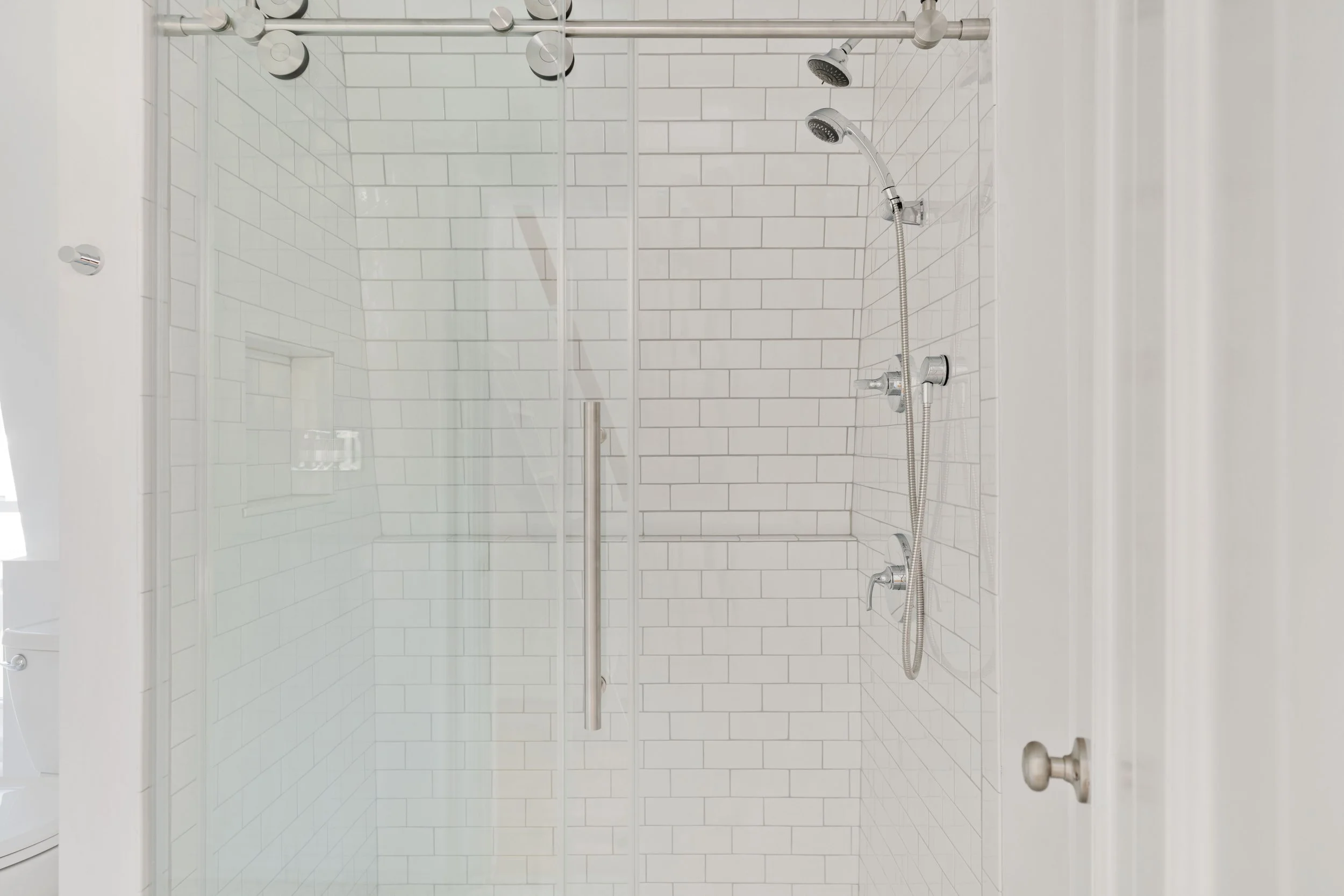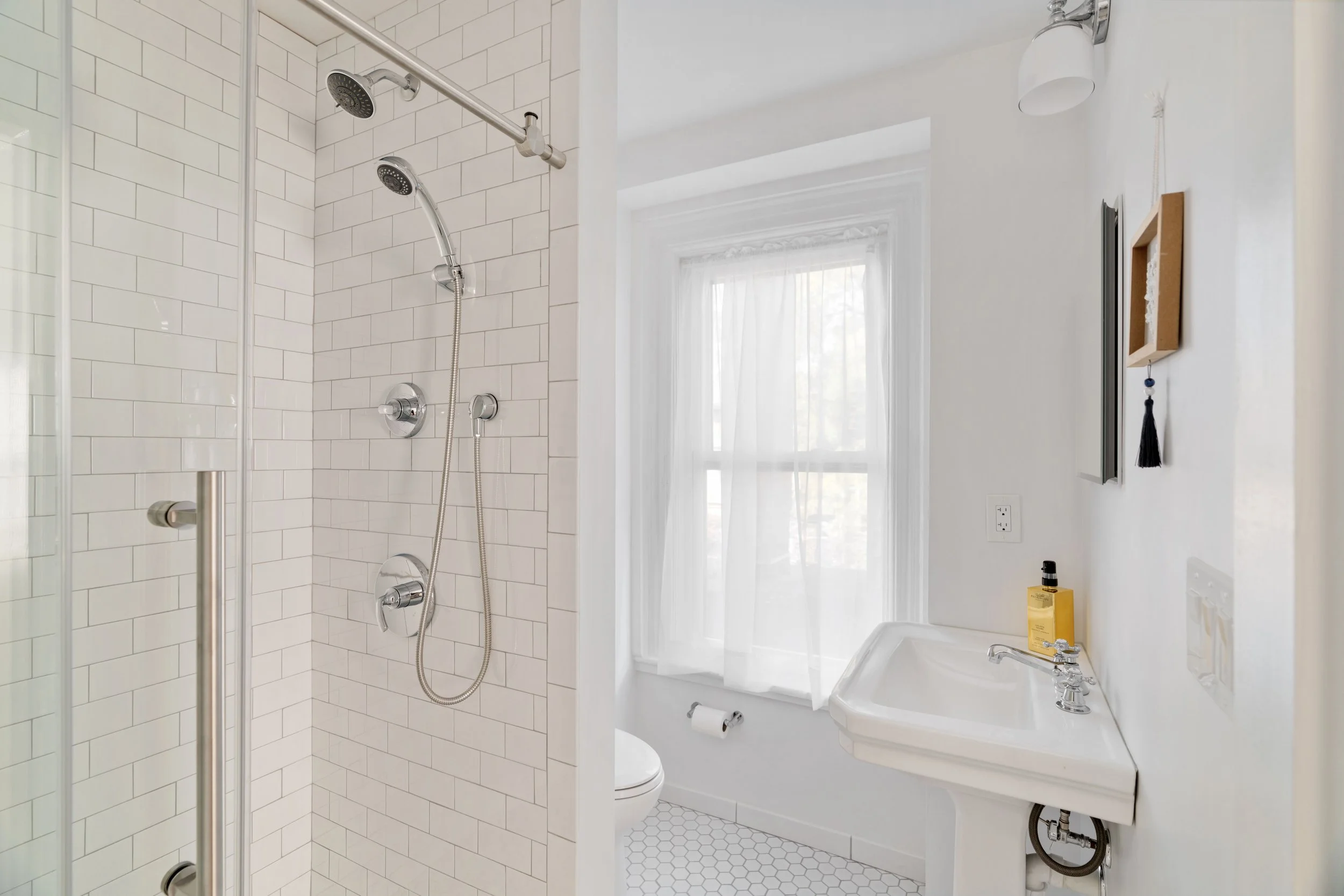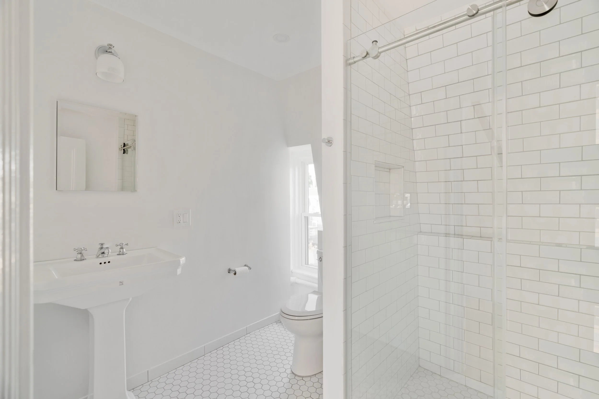 Newly renovated bath with large walk-in shower and sliding frameless glass doors. The shower has subway tile and there is a window, tile flooring and a pedestal sink topped with a medicine cabinet.