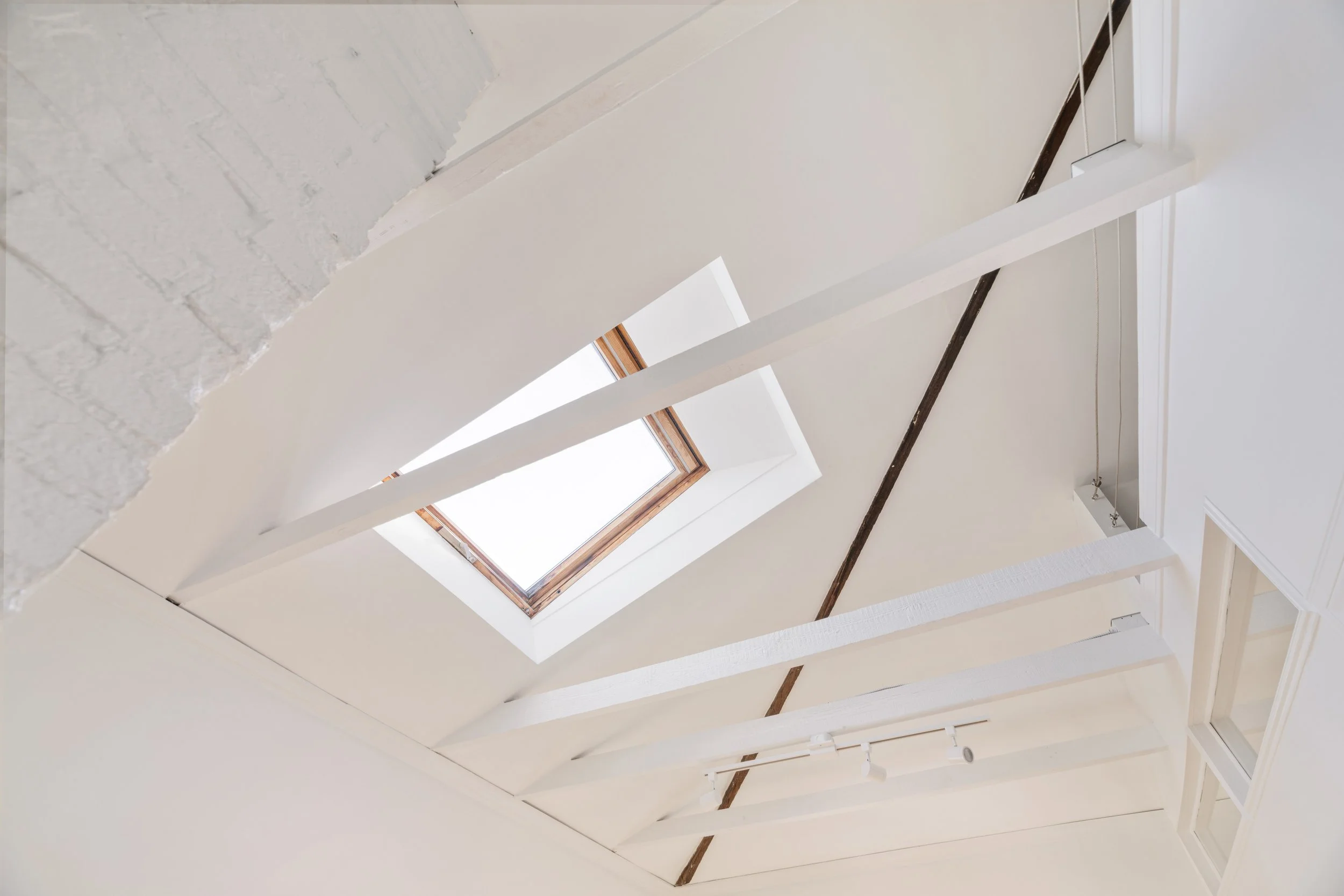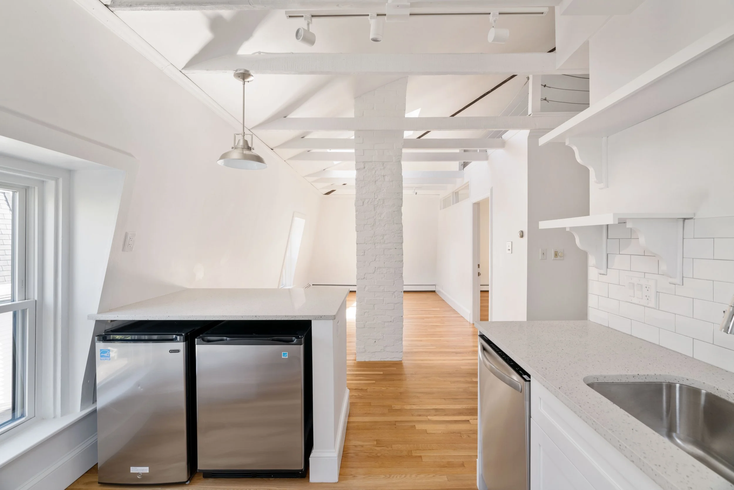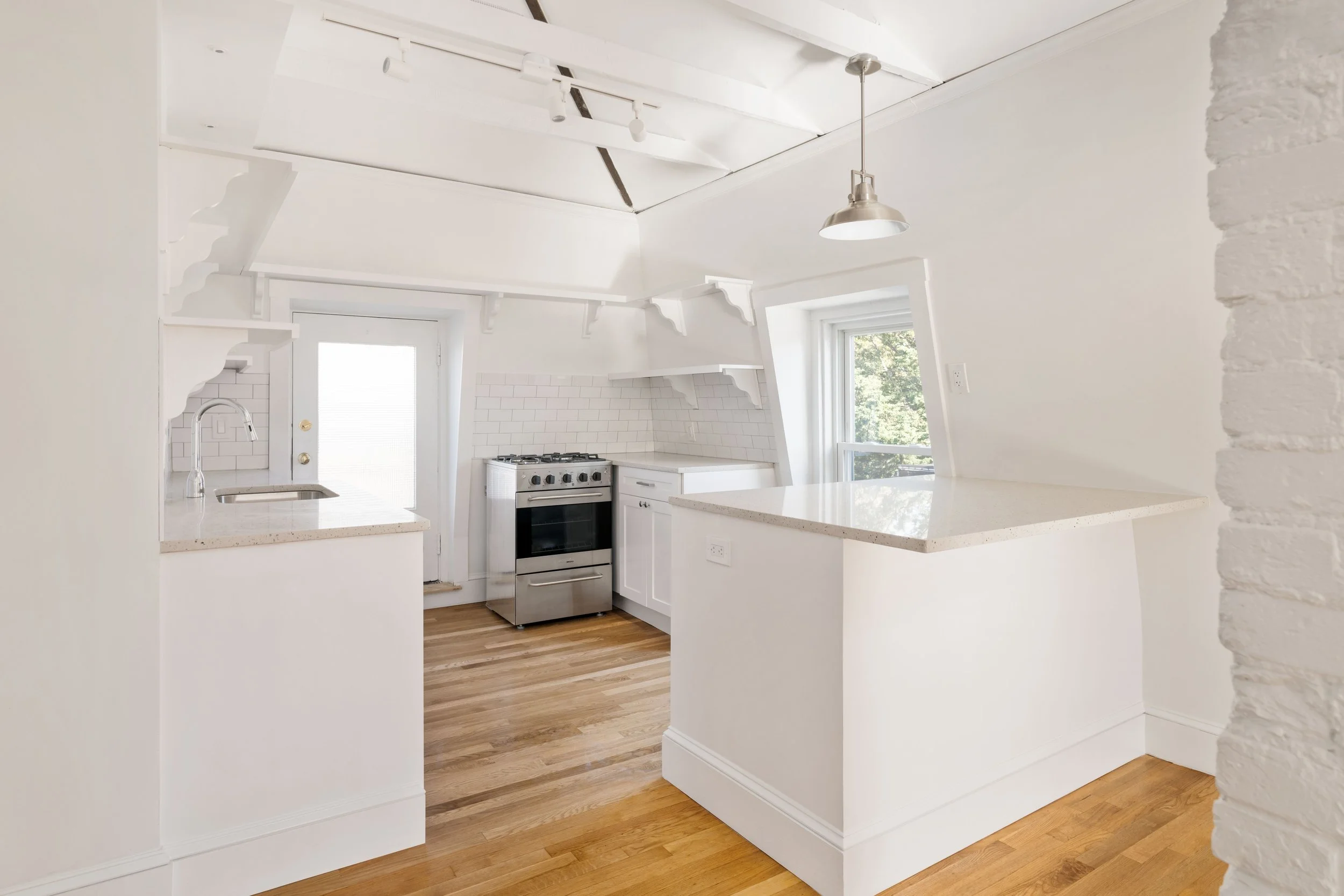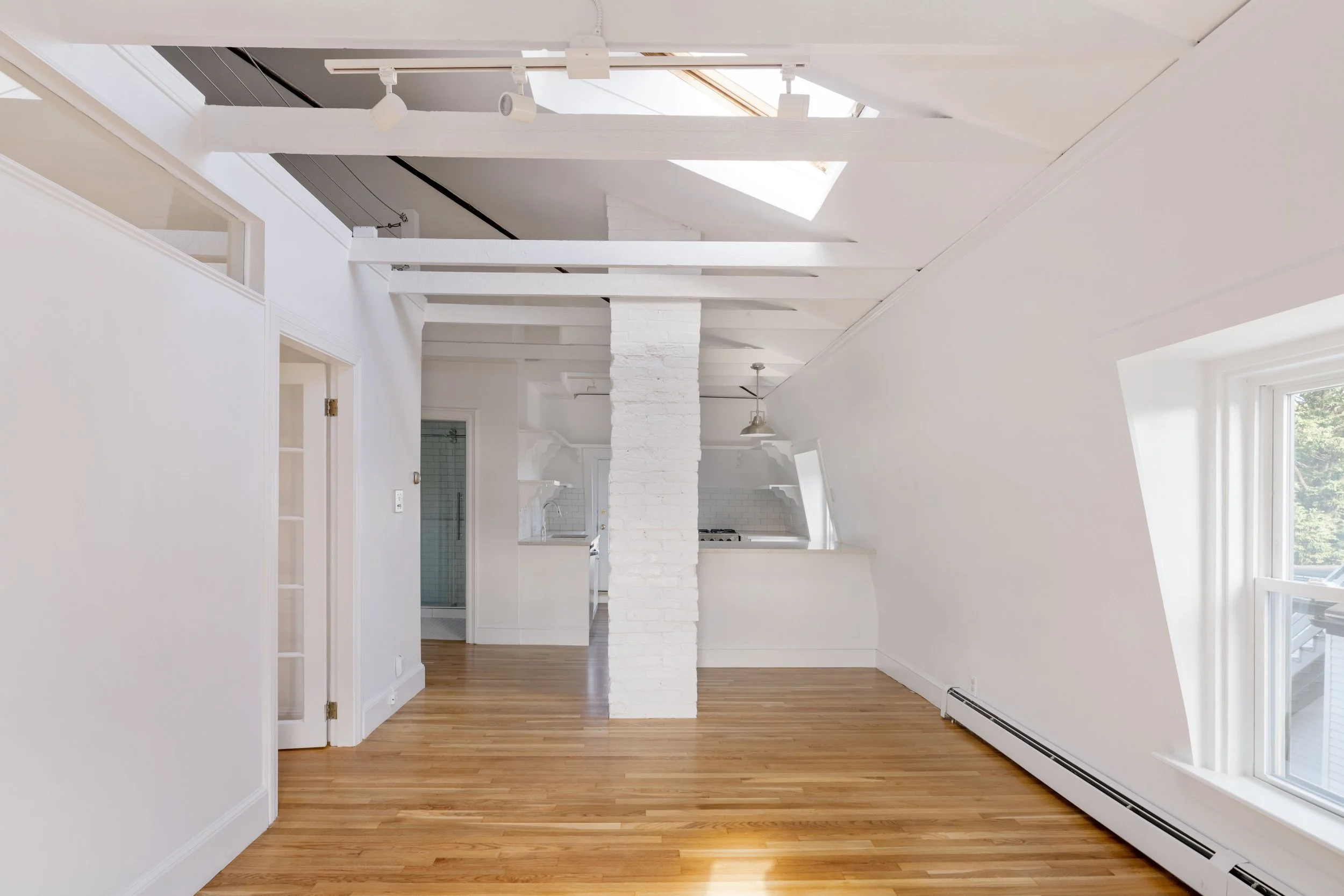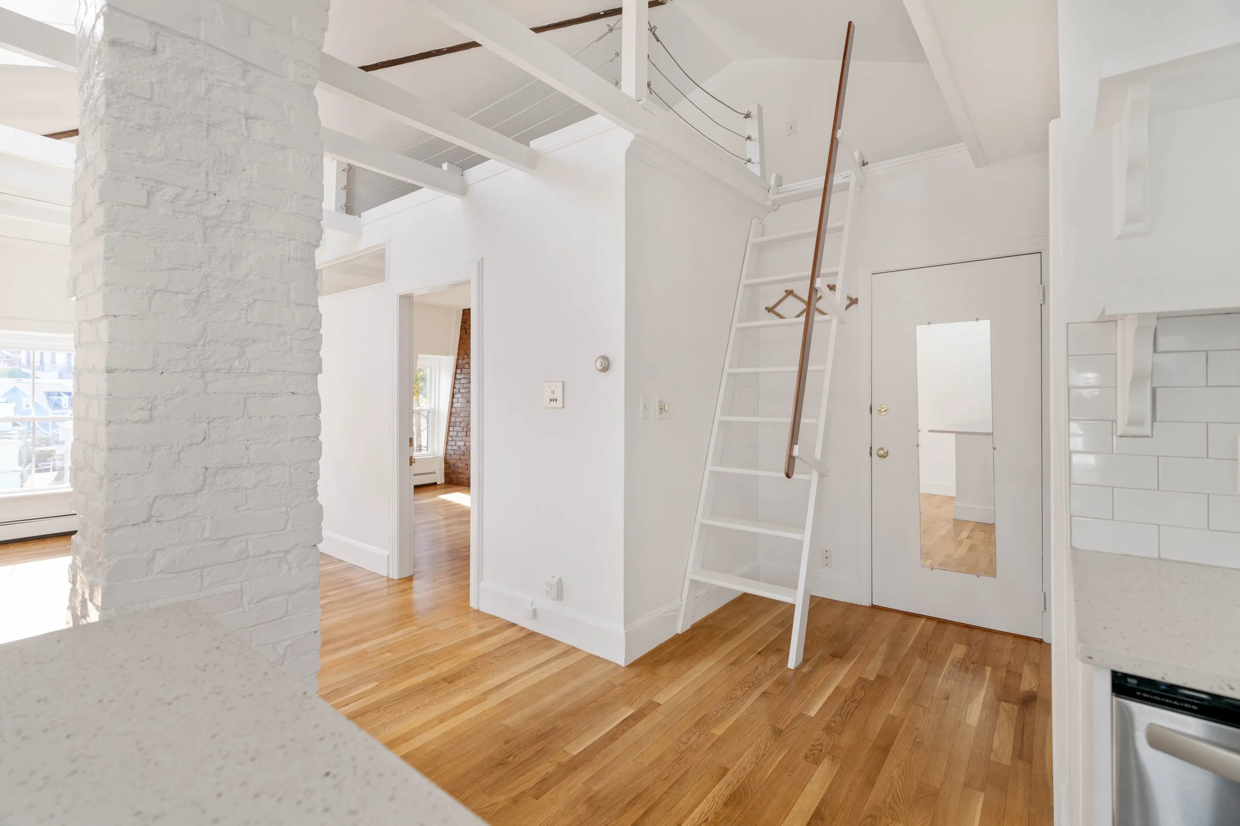 Enter into the penthouse to an open concept kitchen/dining/living room with cathedral ceilings and exposed wood beams. There are many large windows and a skylight that brings light into the apartment and the secret loft.