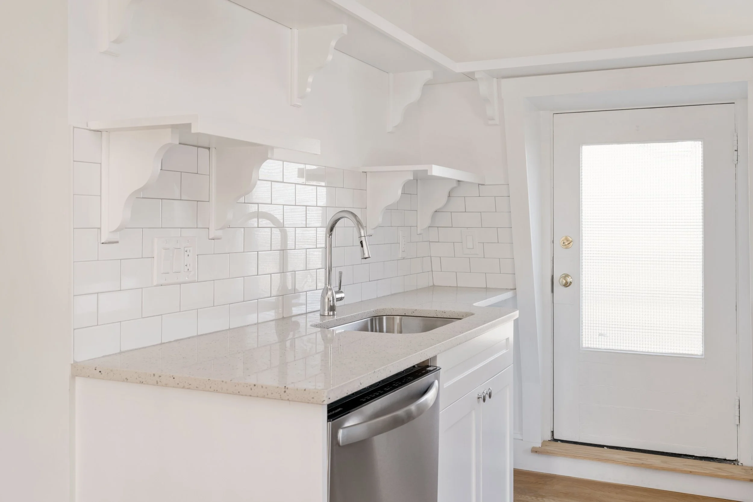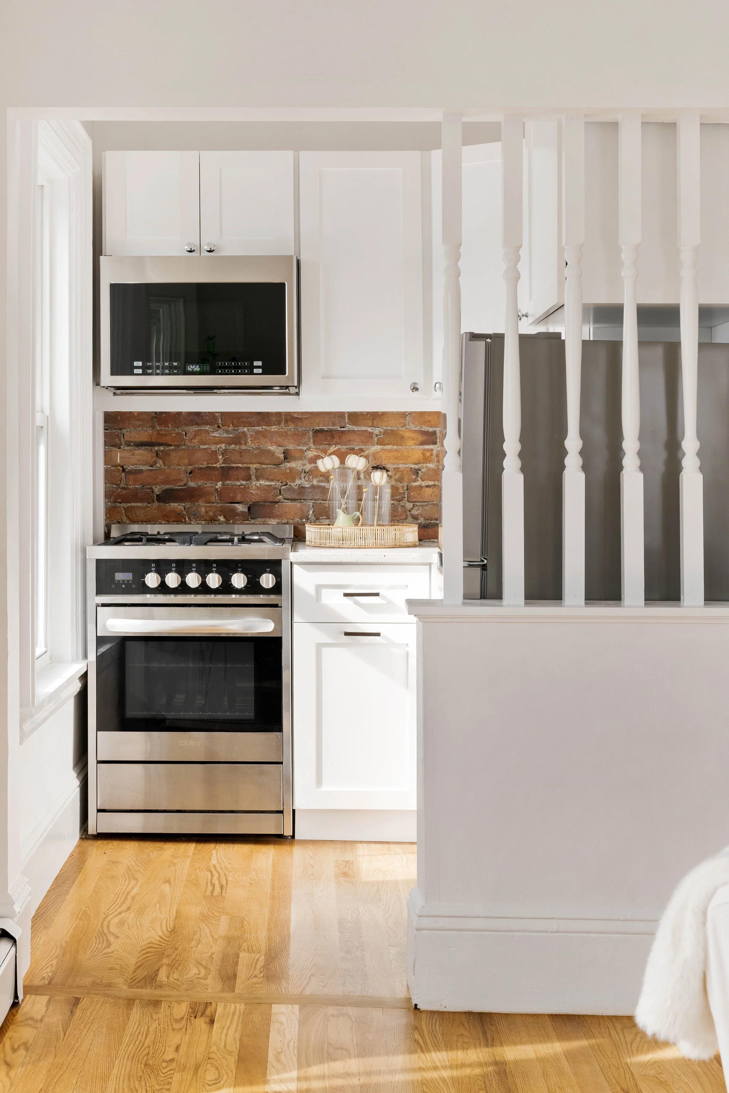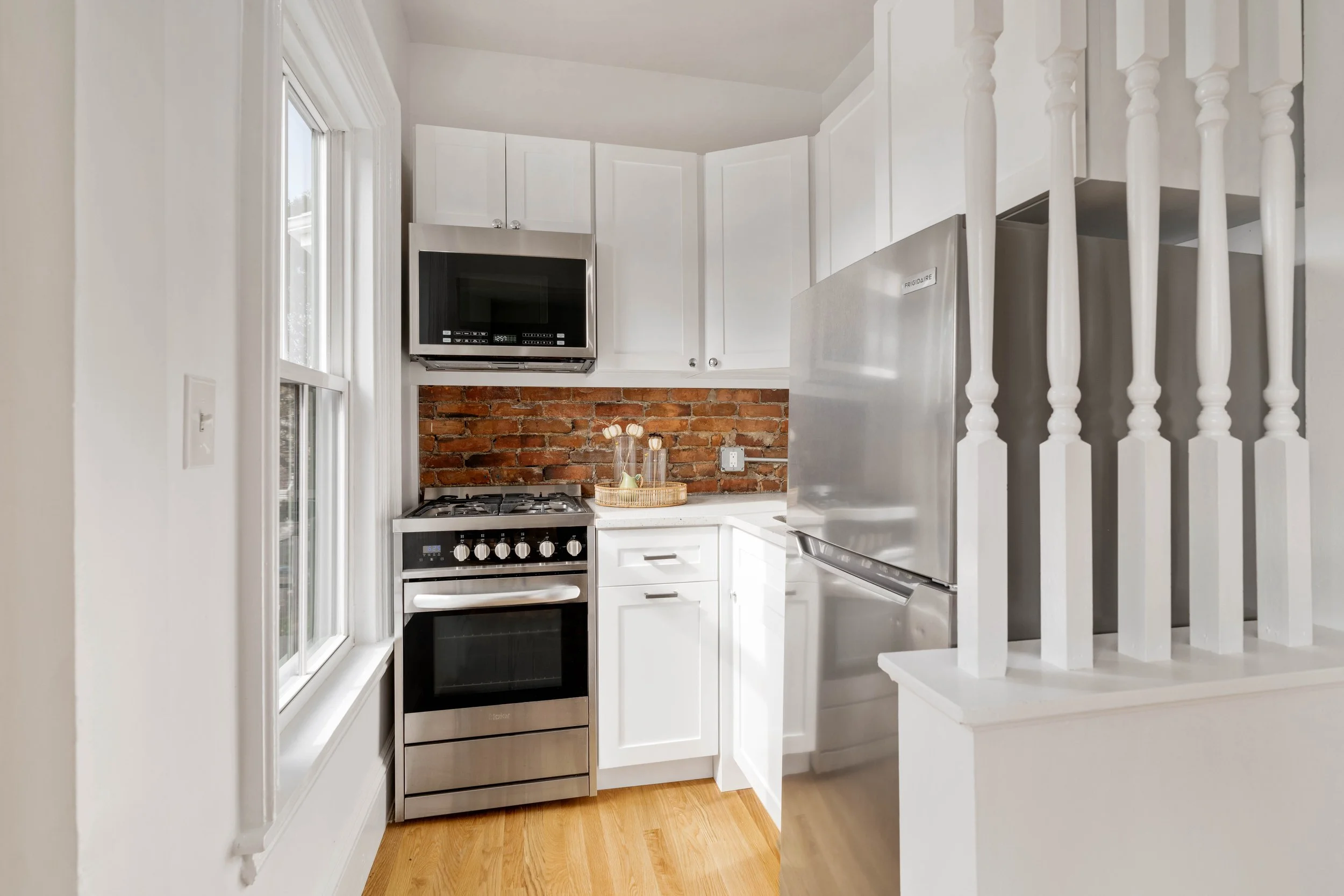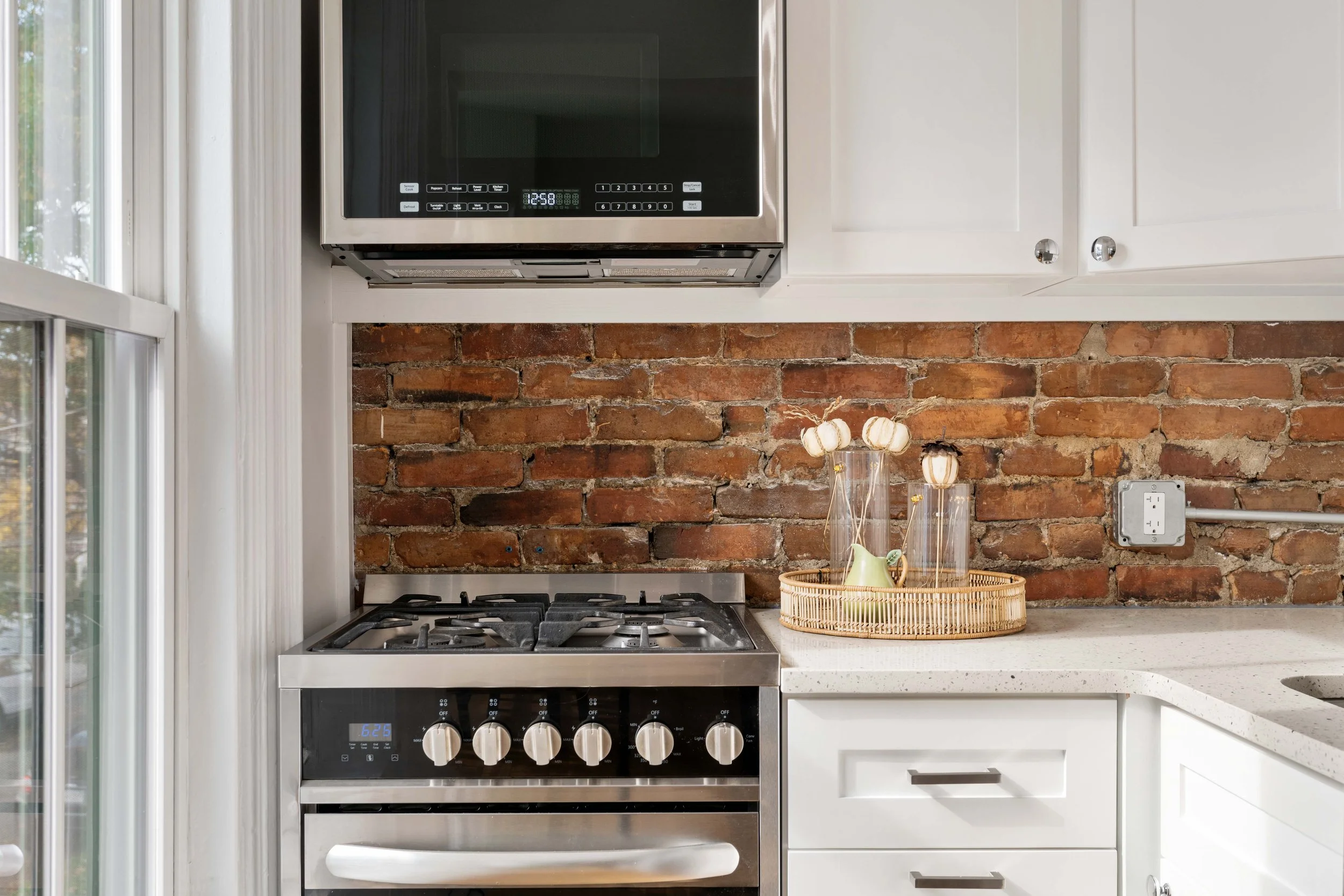 The open kitchen behind the signature brick exposed chimney has floating shelvings, under-counter refrigerator and freezer combo, quartz countertops, and modern track lighting. Appliances include a 24” Prestige gas stove, a Frigidaire dishwasher and refrigerator, and disposal.