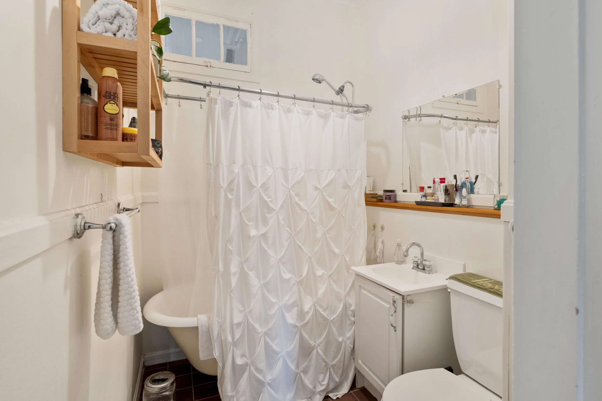 Off of the kitchen is the full bath with a clawfoot tub and shower, single vanity, and rustic tiled flooring.