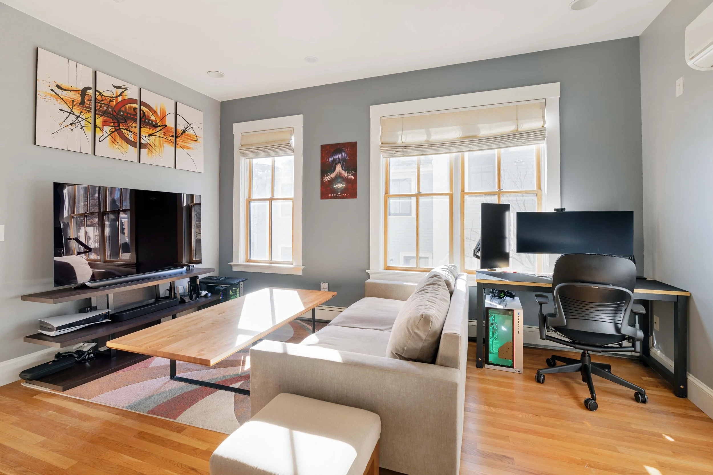 The living room offers plenty of space for both living and dining or office, and faces a wall of windows with handsome linen roman shades. A Mitsubishi split ductless system (new in 2021) can cool the space nicely and also offers supplemental heat if desired.