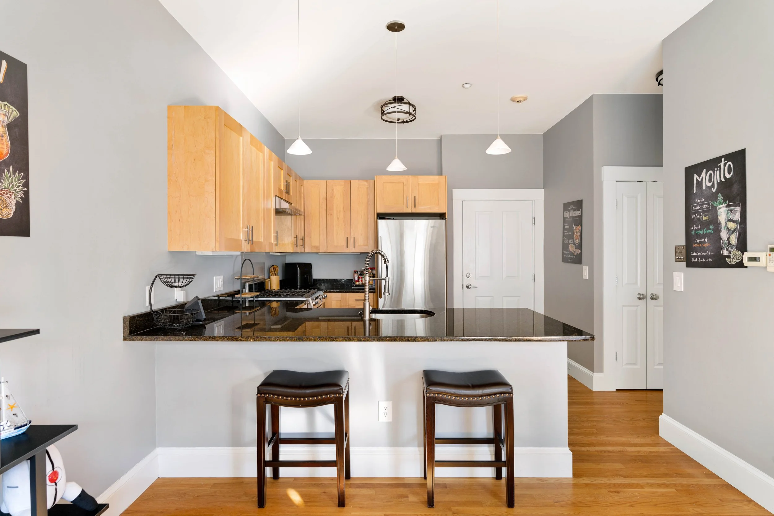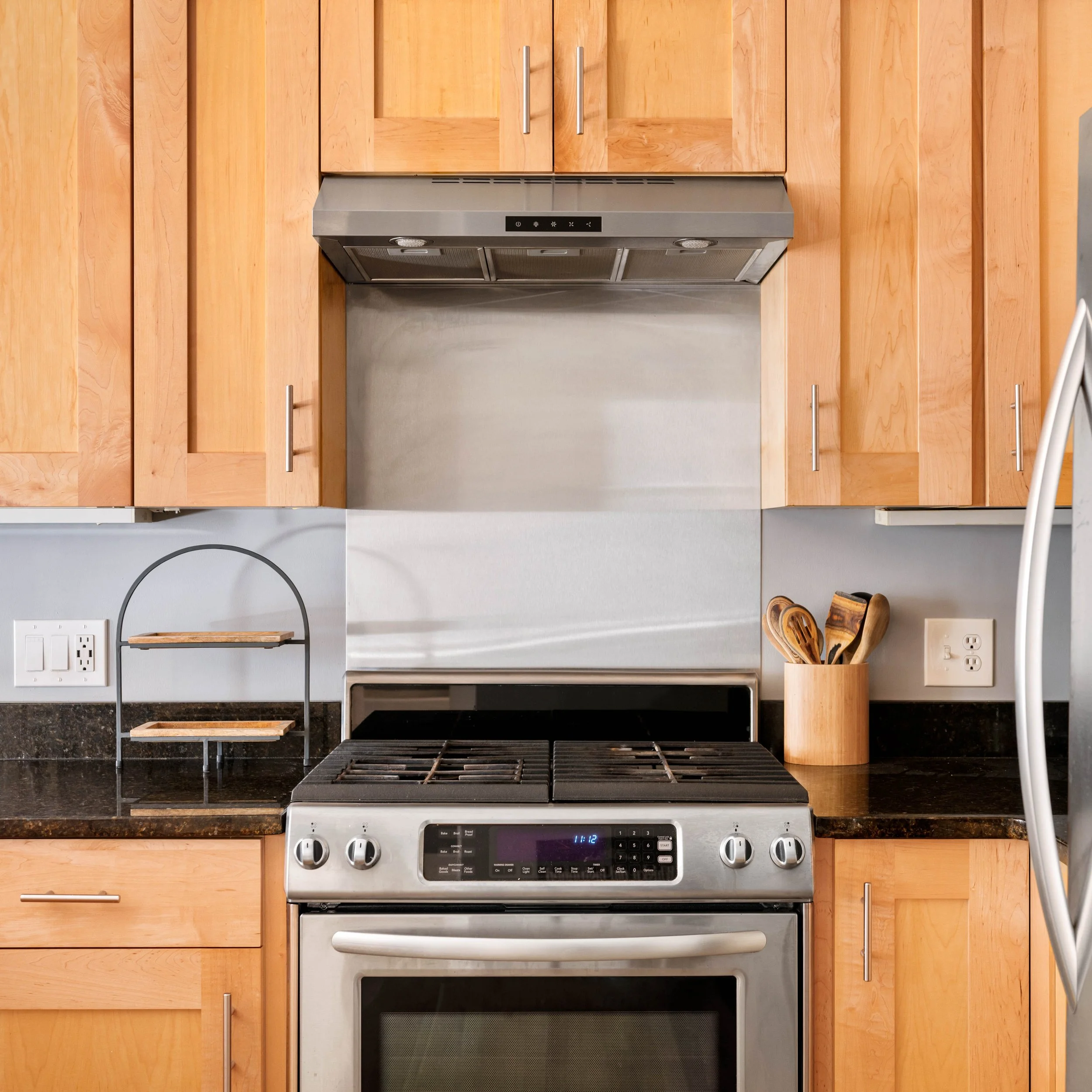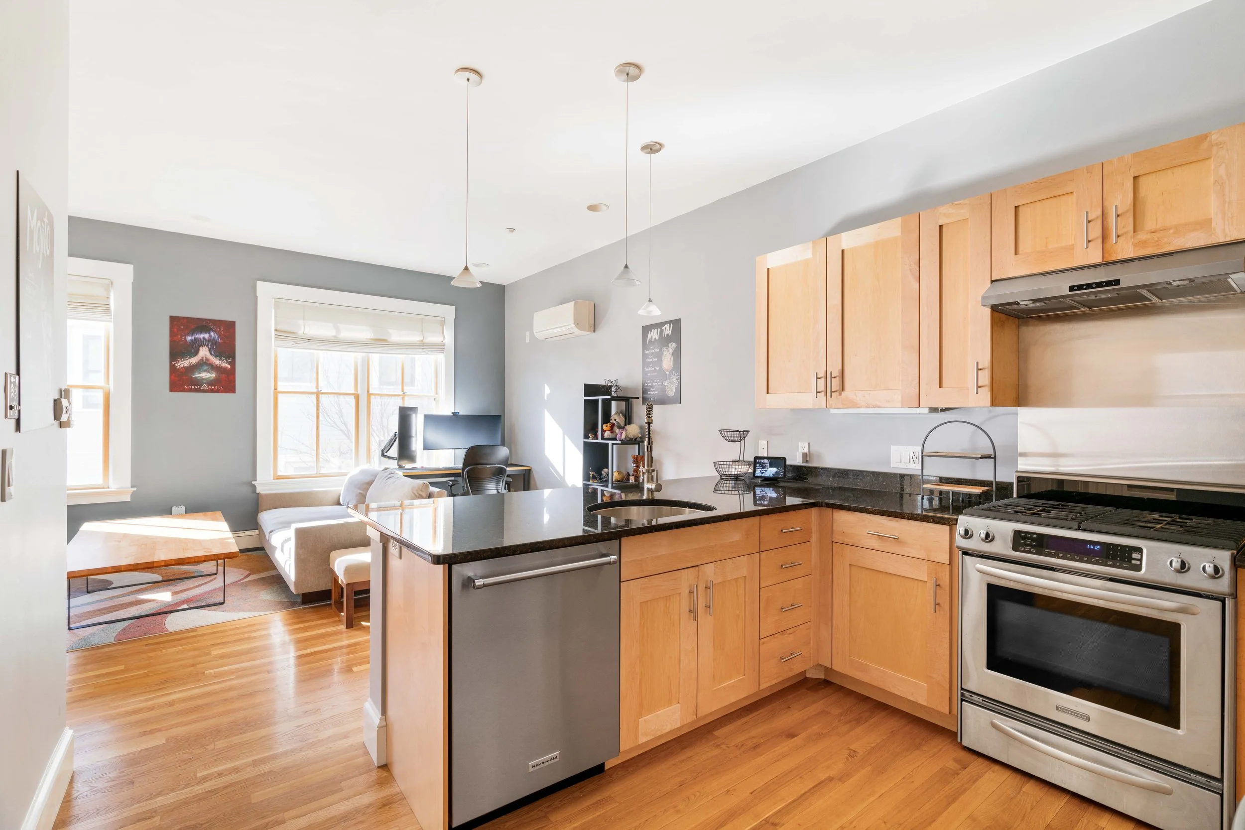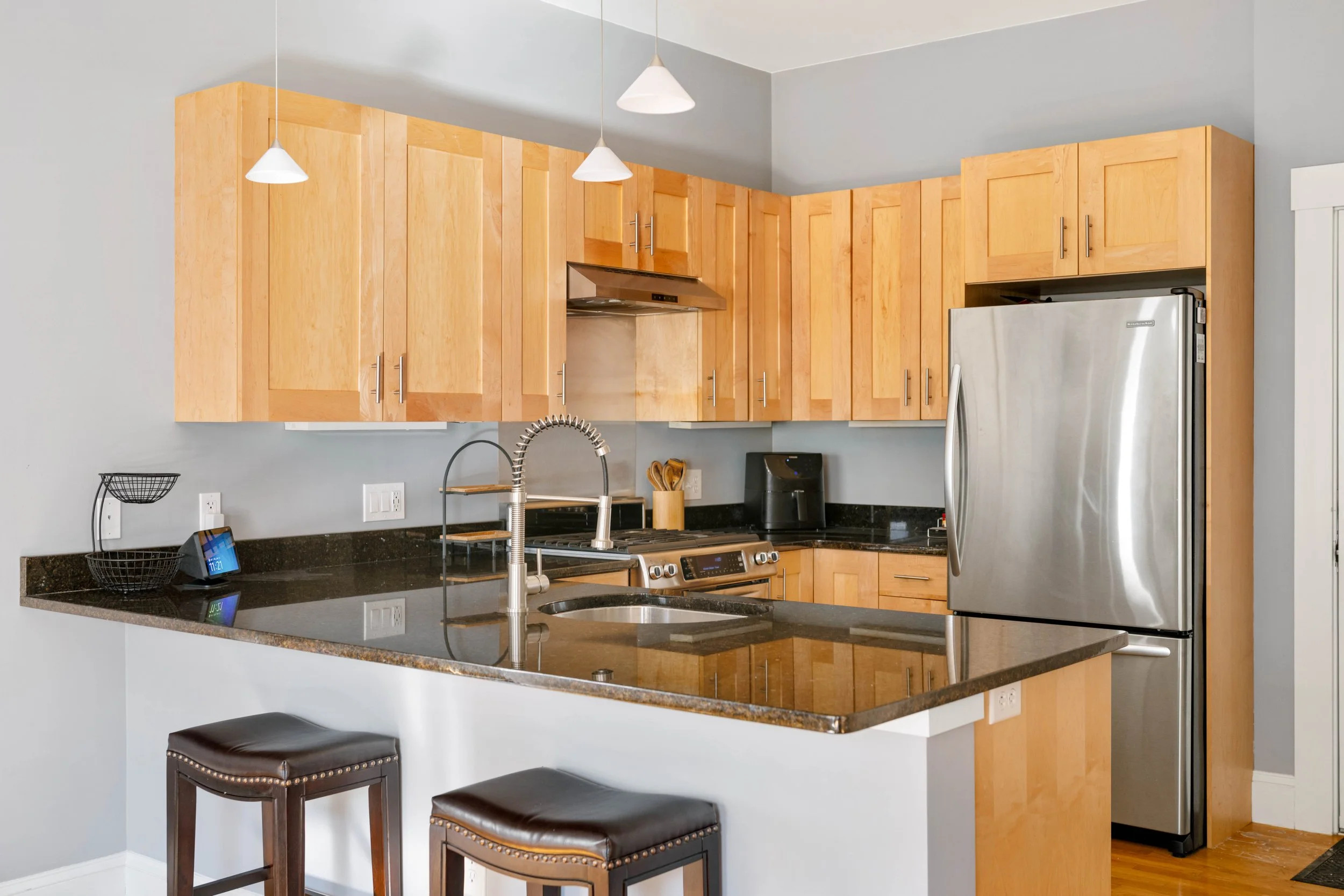 Kitchen has ample shaker-style maple cabinets, polished black granite countertops, stainless steel KitchenAid® refrigerator, slide-in stove with vent hood, and dishwasher, and a large stainless sink with disposal (new in 2023). The counter extends to offer a generous breakfast bar for 3-4, and there are 3 elegant frosted glass pendants overhead.