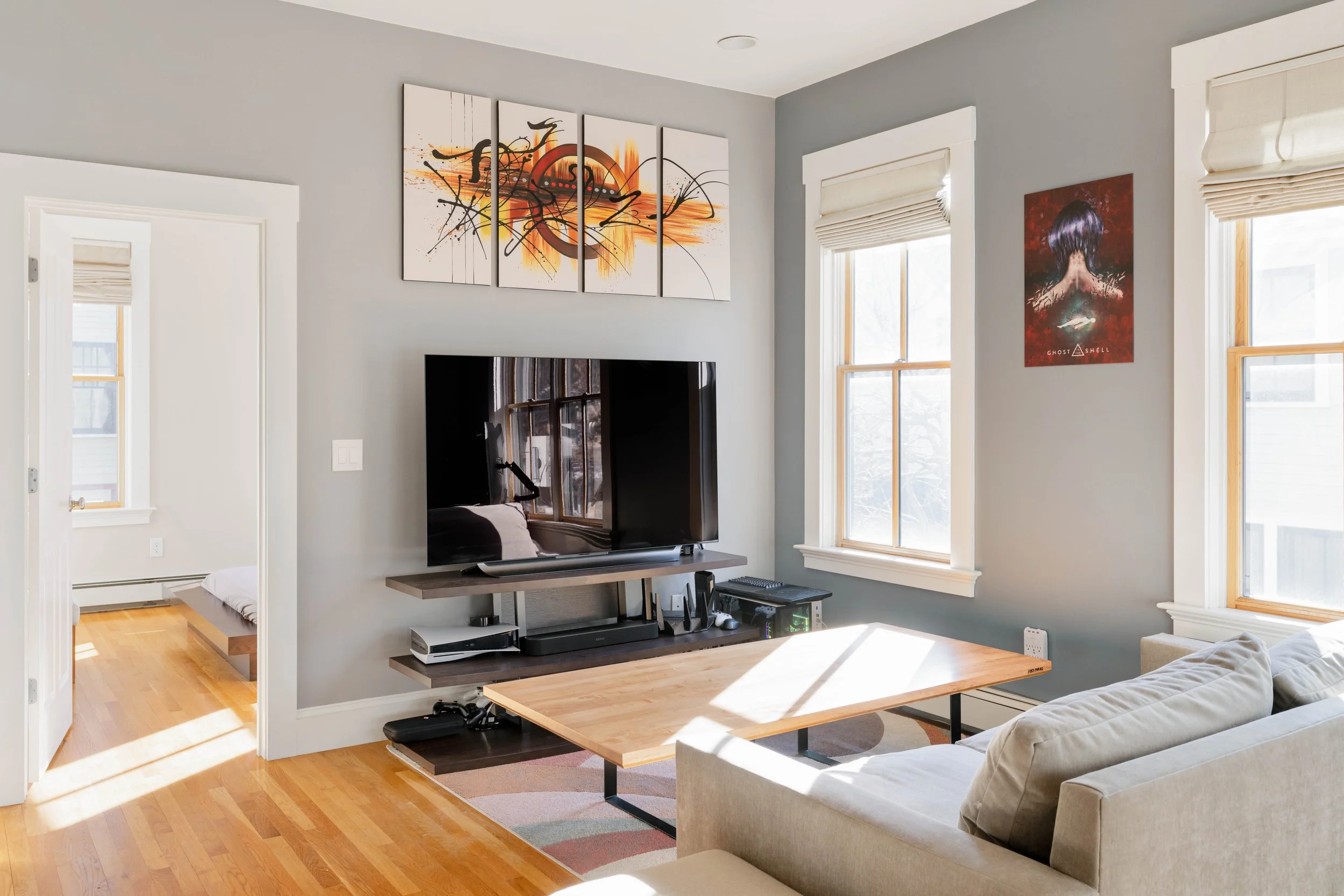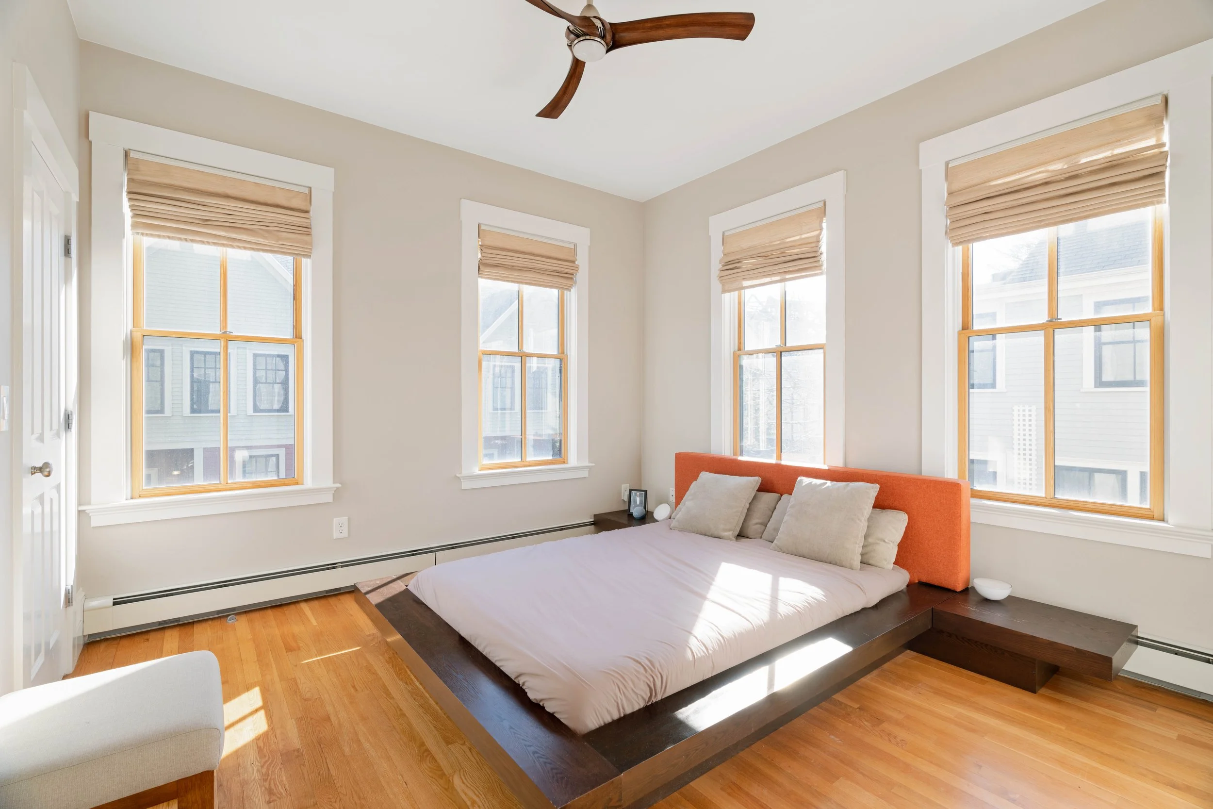 Beautiful oak hardwood floors and oversized wood framed windows set a modern backdrop.