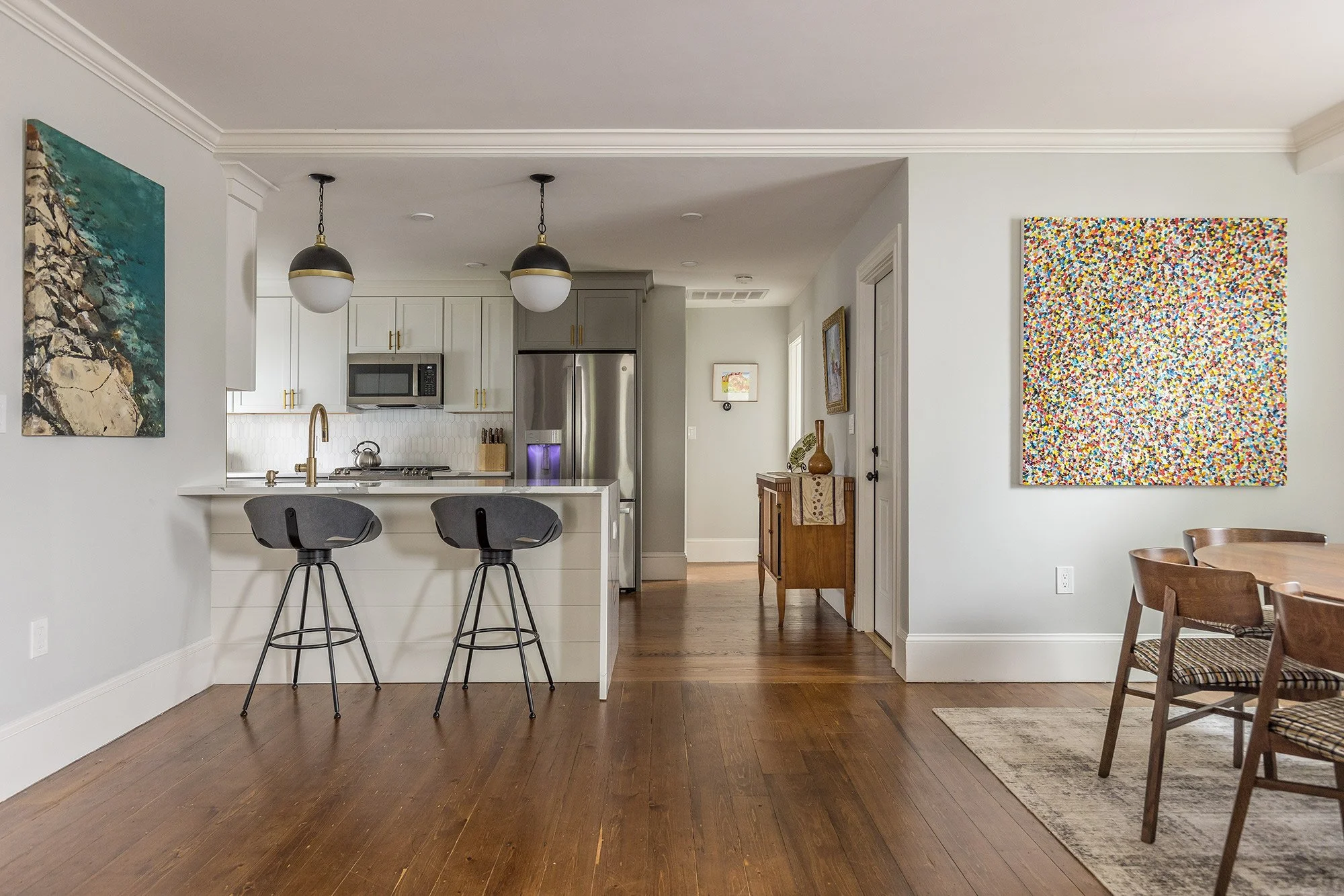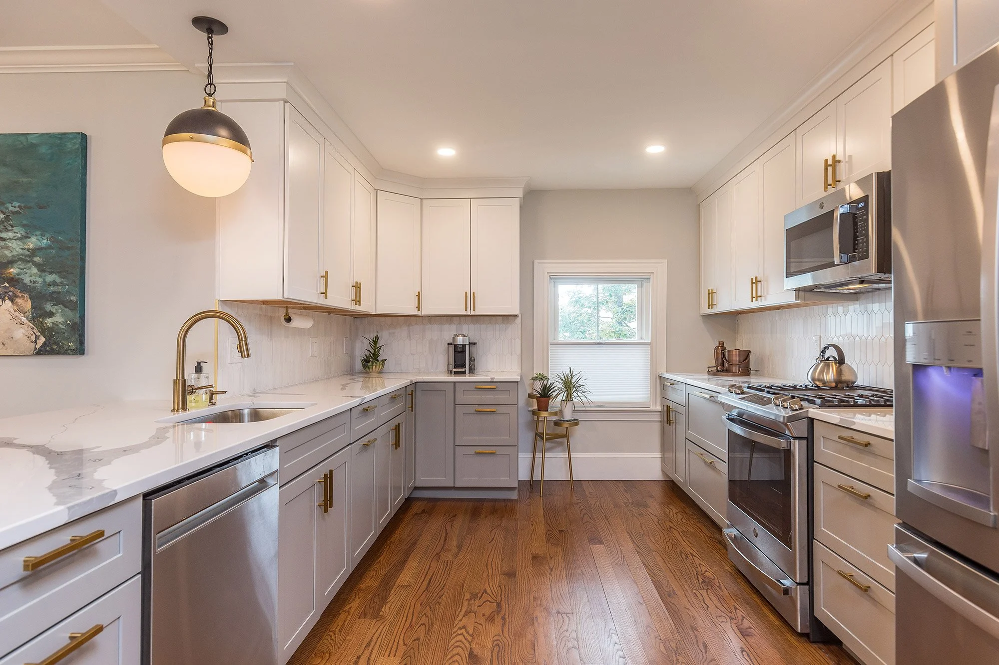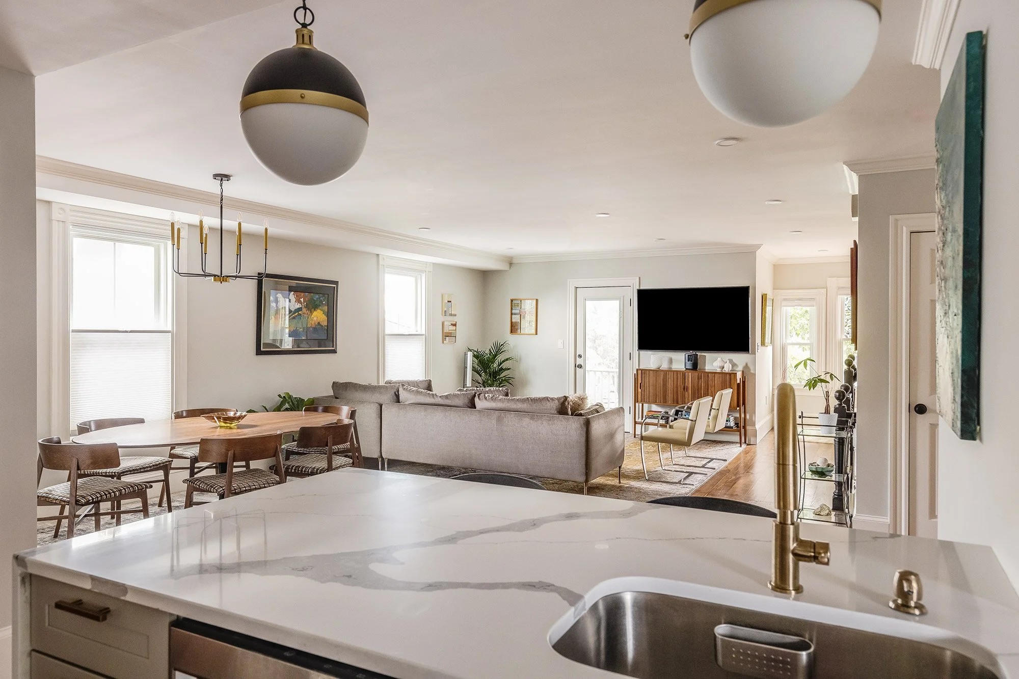 The spacious kitchen commands three full walls with gray lower and white upper cabinets, brass hardware and pull-down faucet, marble tile backsplash, and white quartz counters with assertive marble veining. Stainless steel appliances from GE include a french door refrigerator, a 5-burner slide-in range, dishwasher, and an overhead microwave that vents to the exterior. A waterfall style sit-up island connects to the dining area, seats three and has two substantial black and brass globe pendants above.