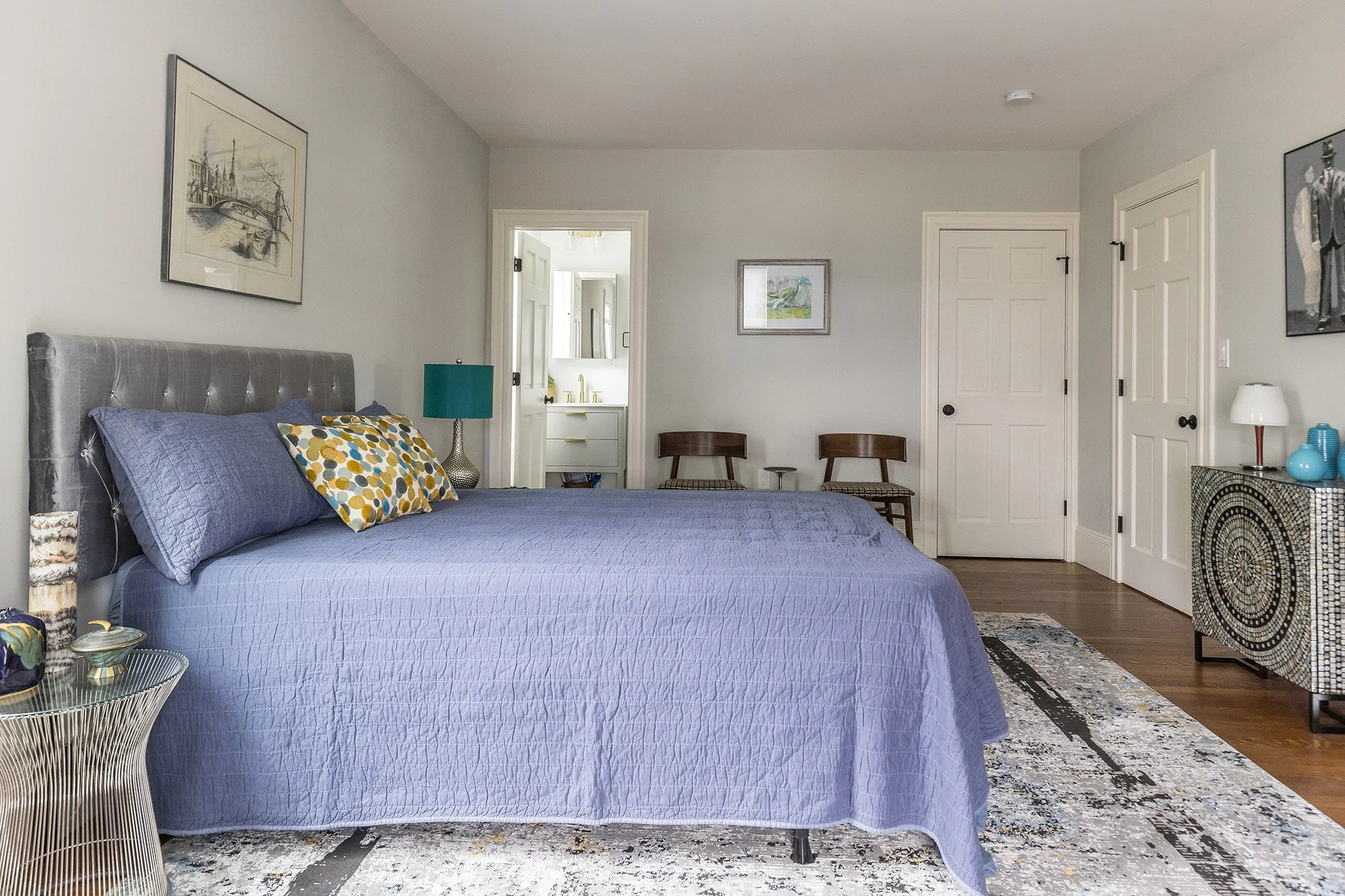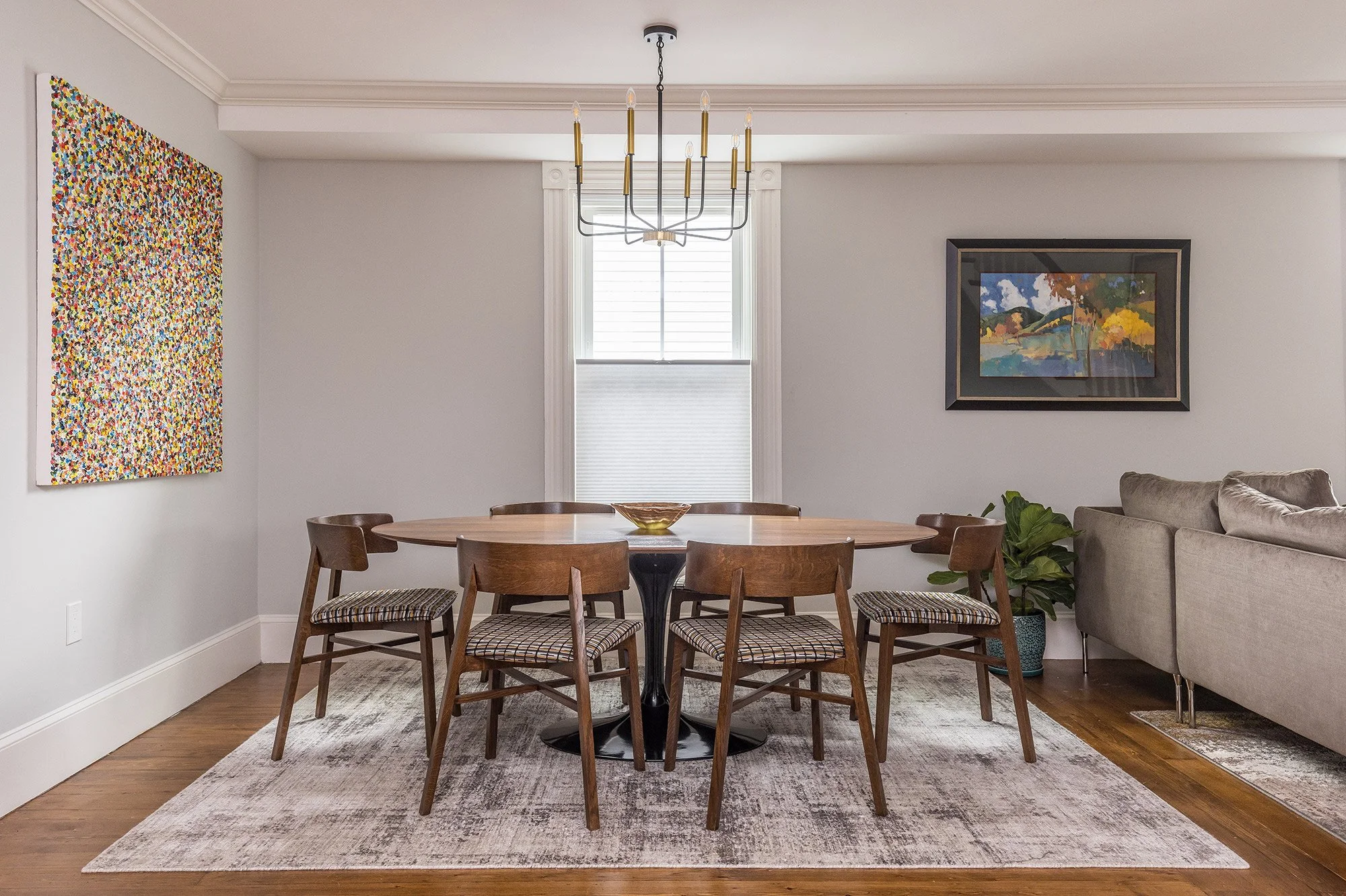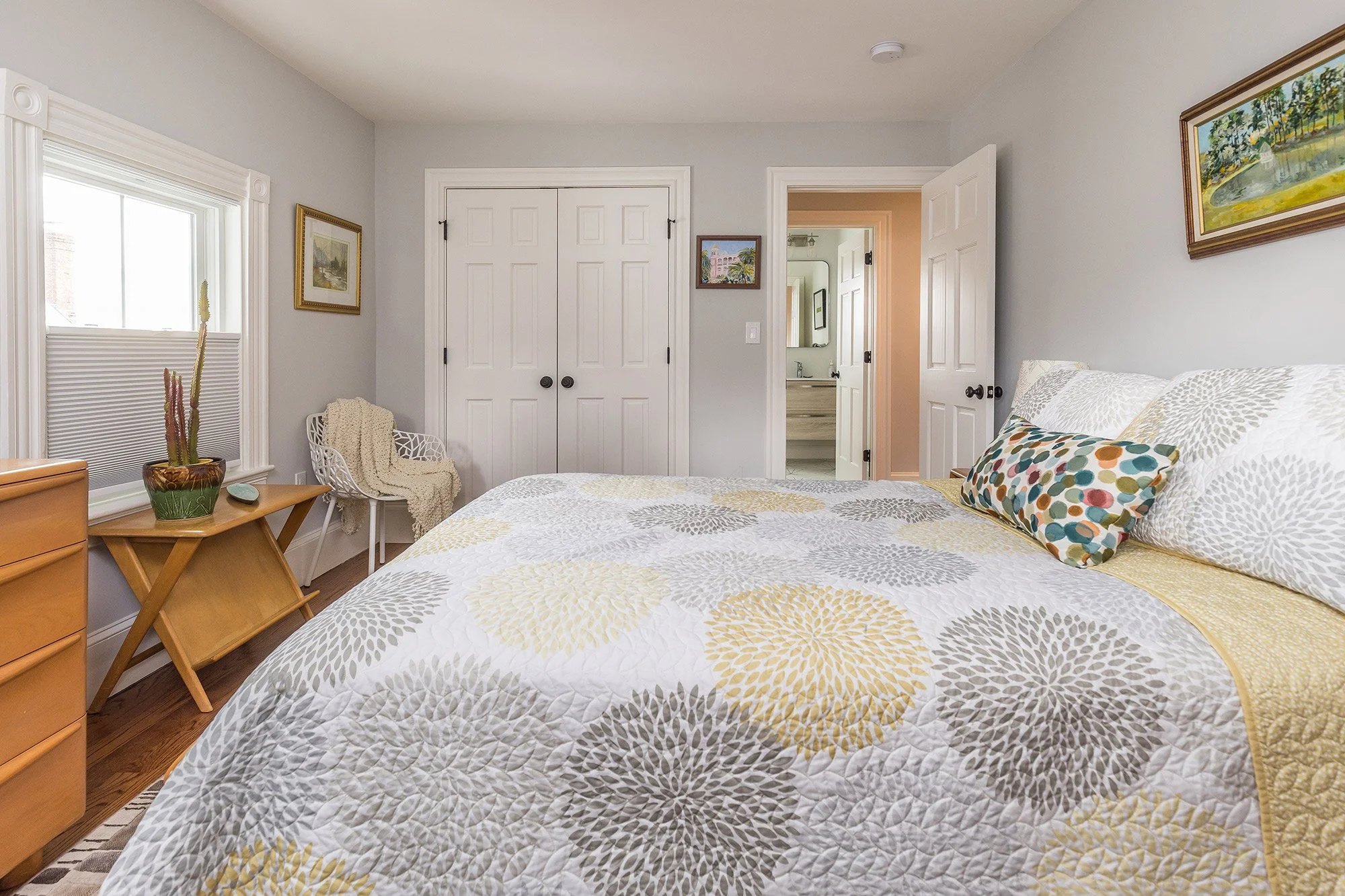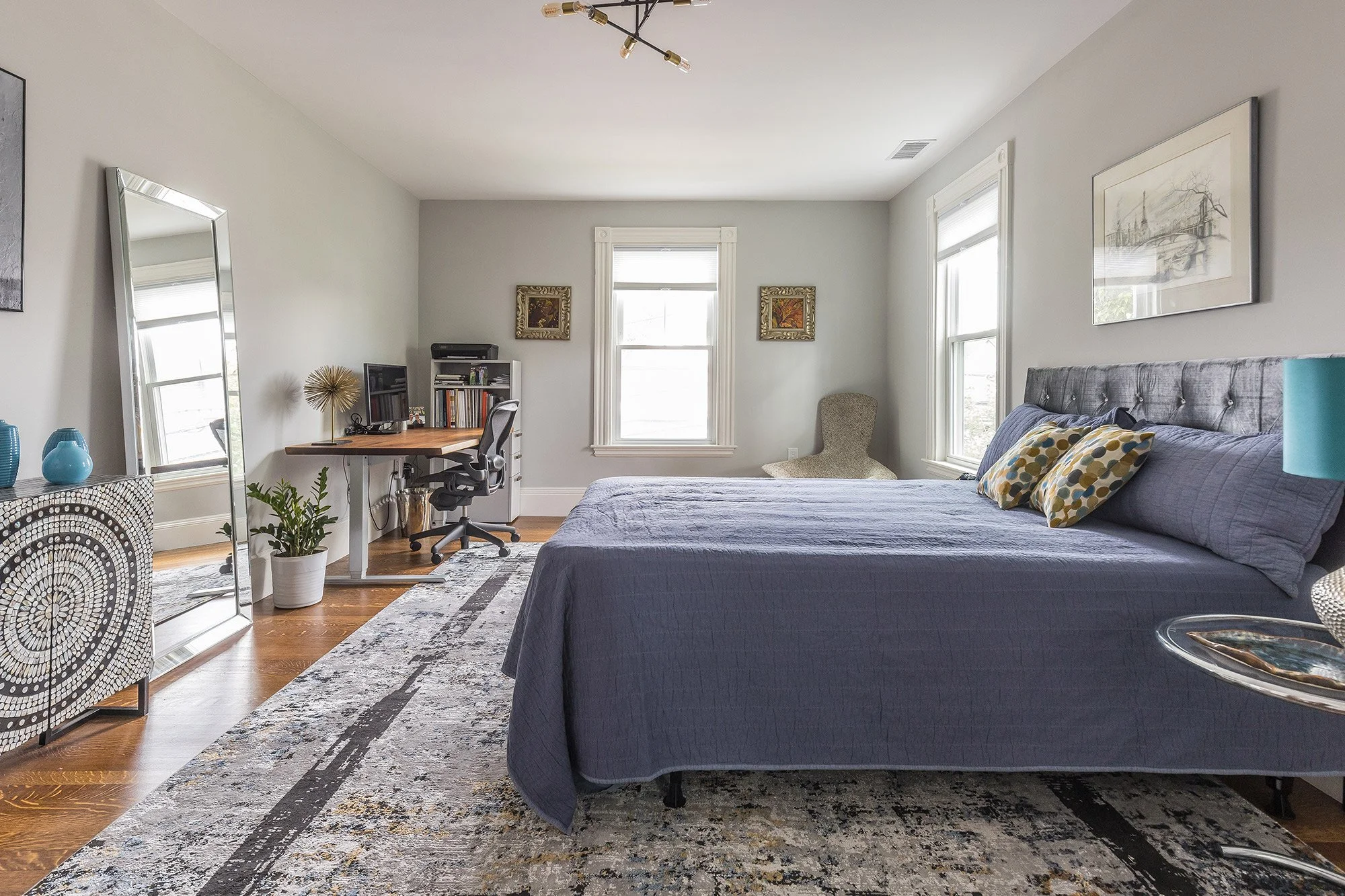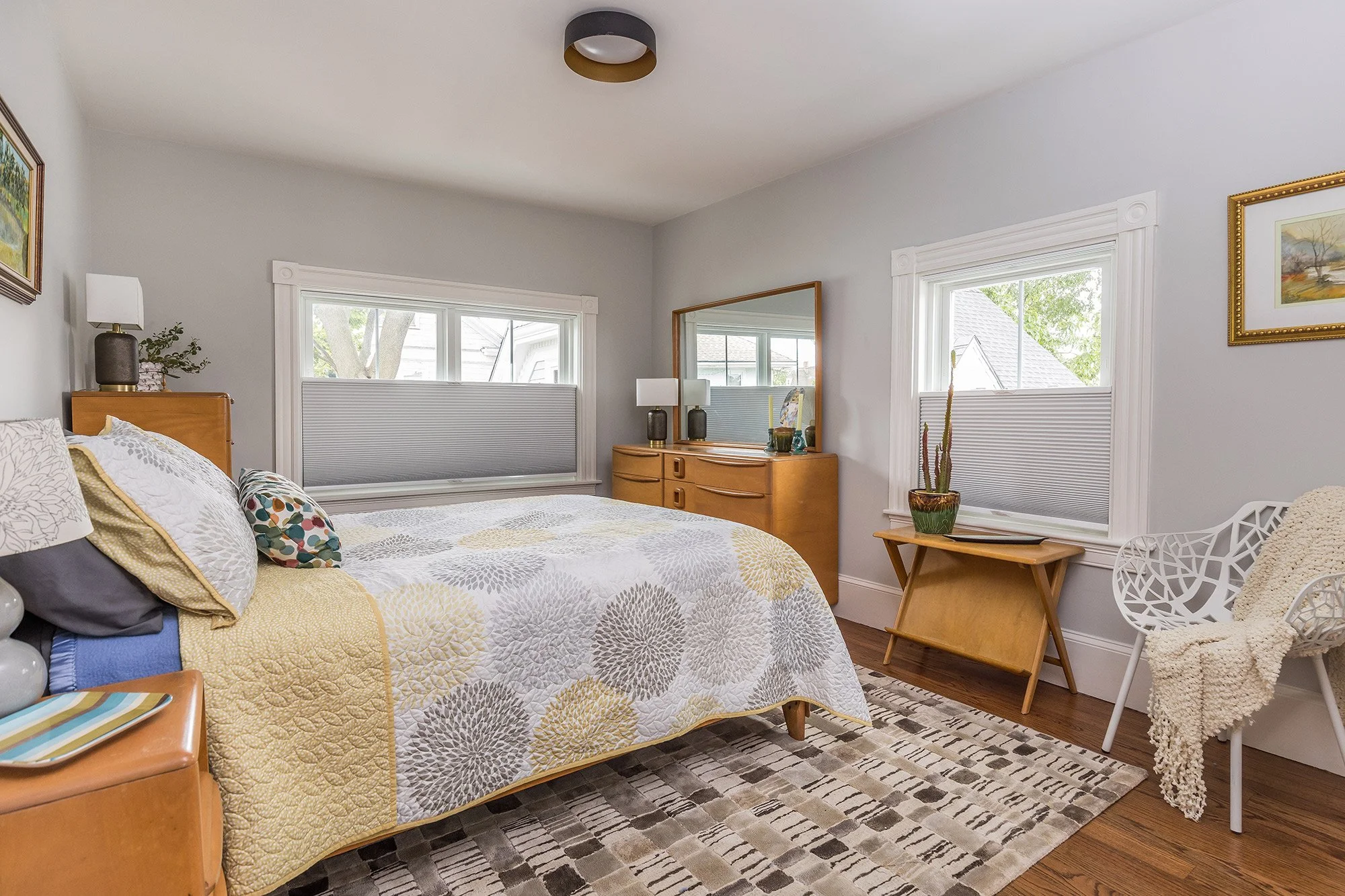 The generous primary bedroom has two windows with custom honeycomb blinds, a walk-in closet, Sputnik-style light fixture, and an ensuite bath.