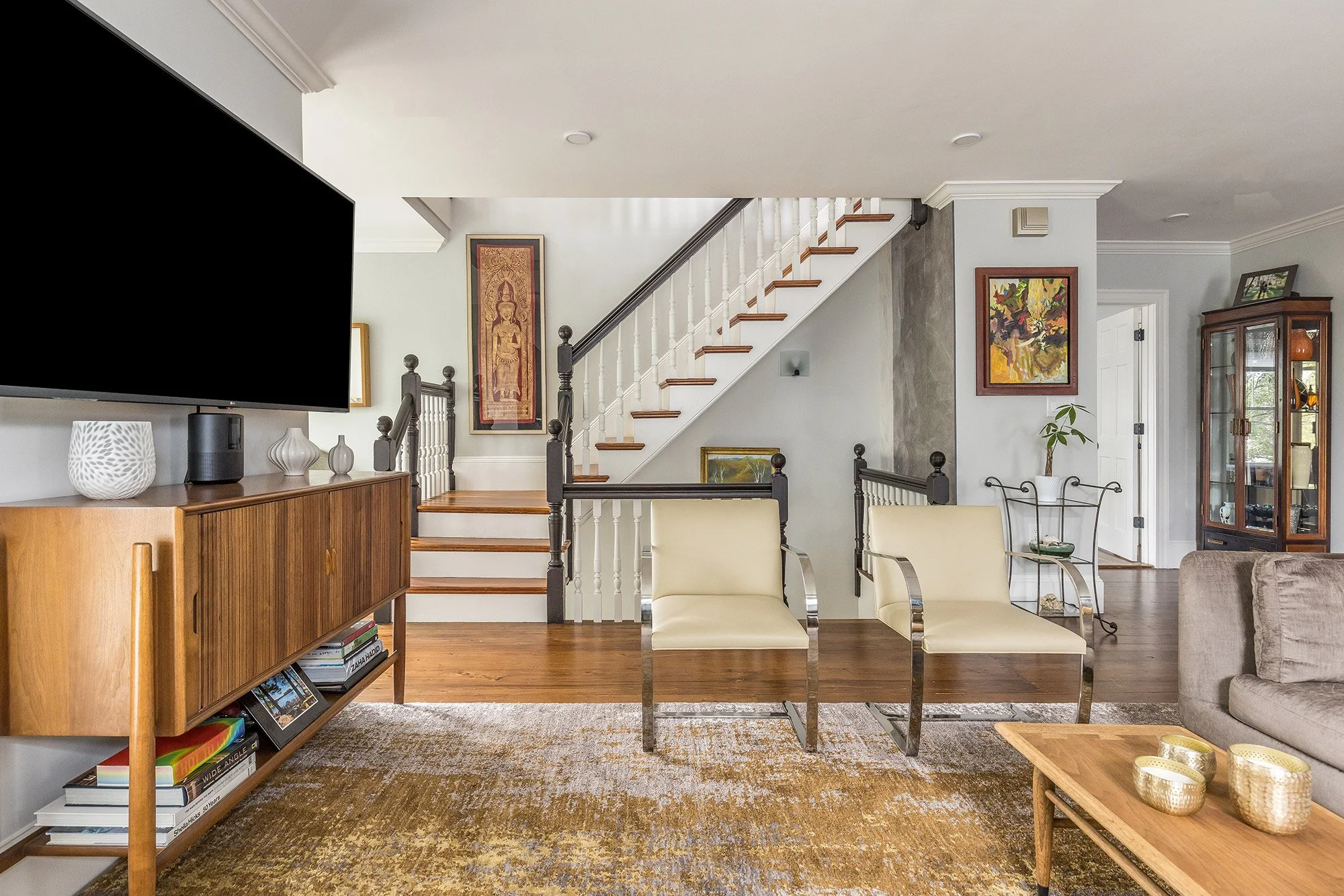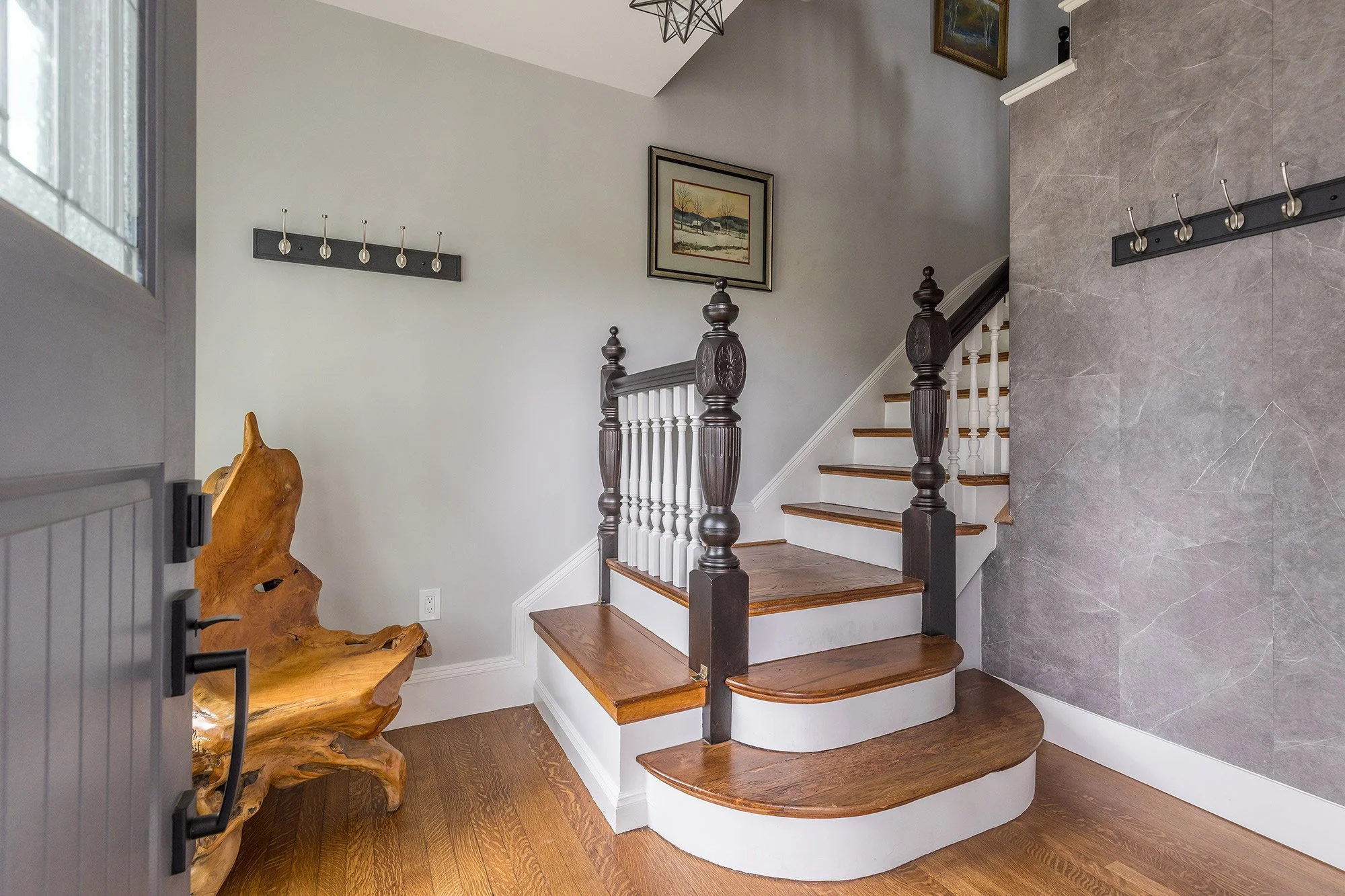 The private front entrance opens into a spacious mudroom style foyer with dramatic ceiling height, two walls clad in handsome gray tilework, and a sparkling moravian star pendant overhead. Select original details have been carefully preserved including a built-in storage bench and ornate staircase.