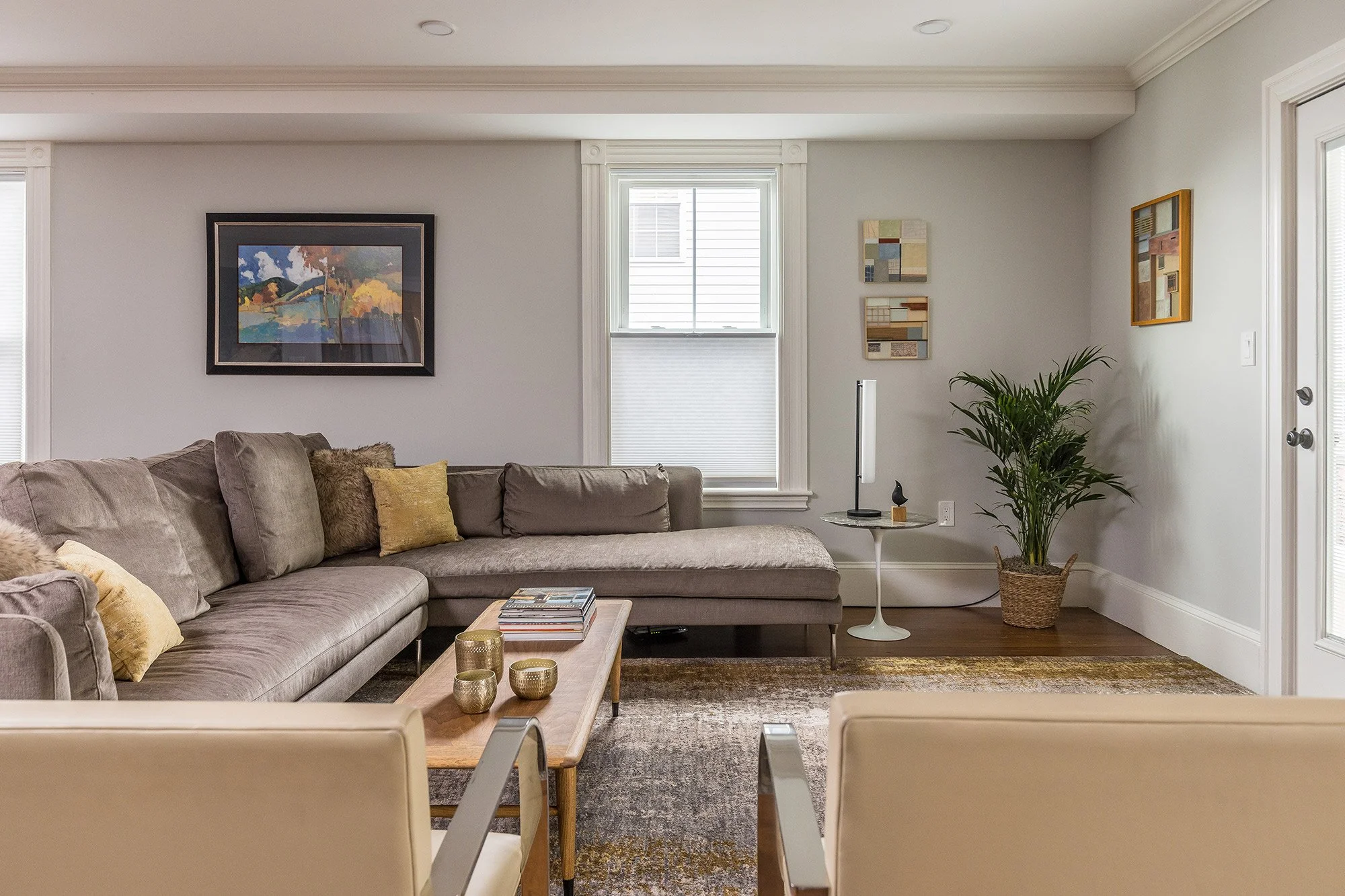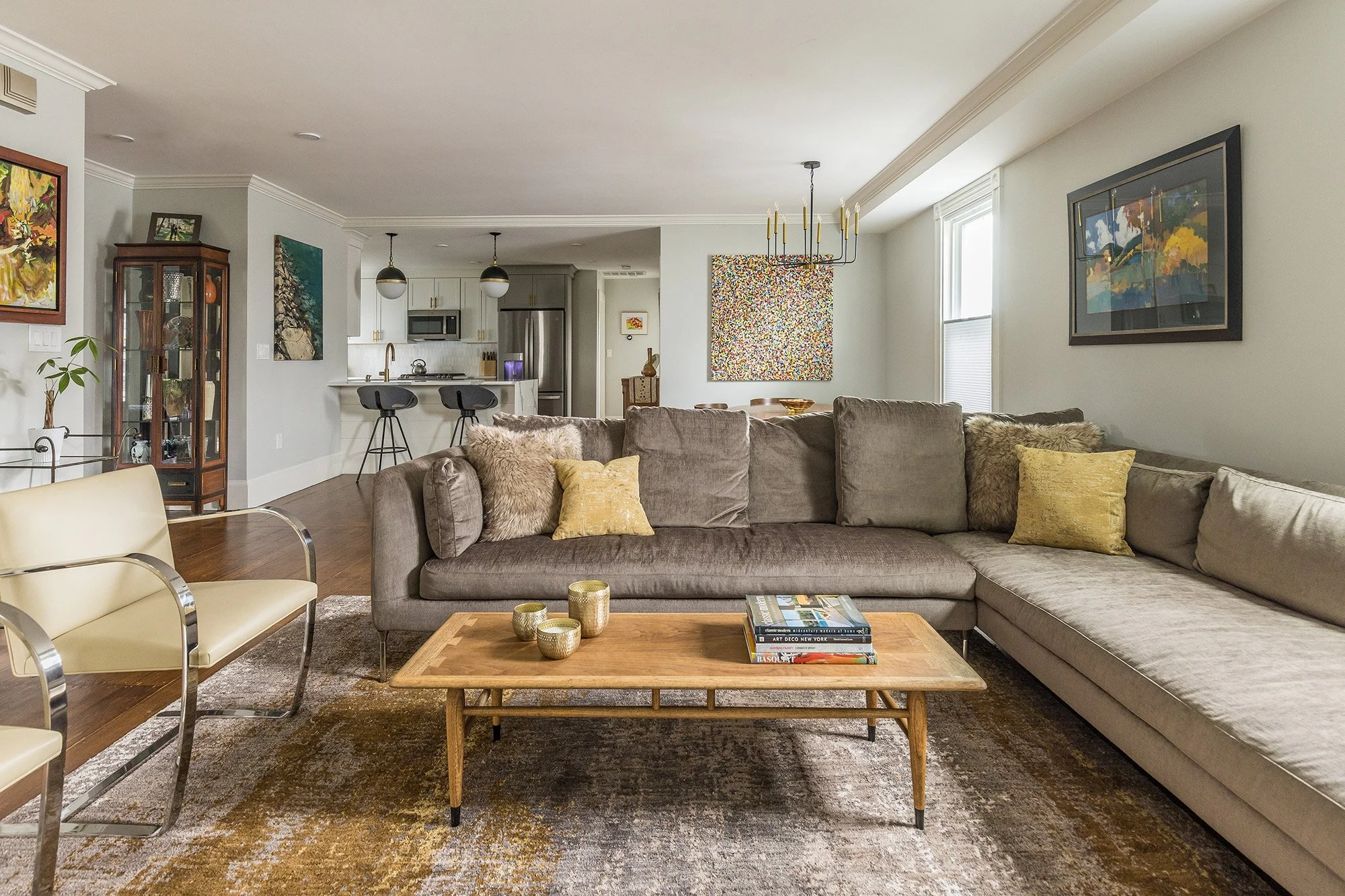 The condo’s open and expansive main floor has views across the living and dining rooms, adjacent kitchen and out onto a front deck. There are large windows, a coat closet, and a mix of recessed lights and coordinating ceiling light fixtures.