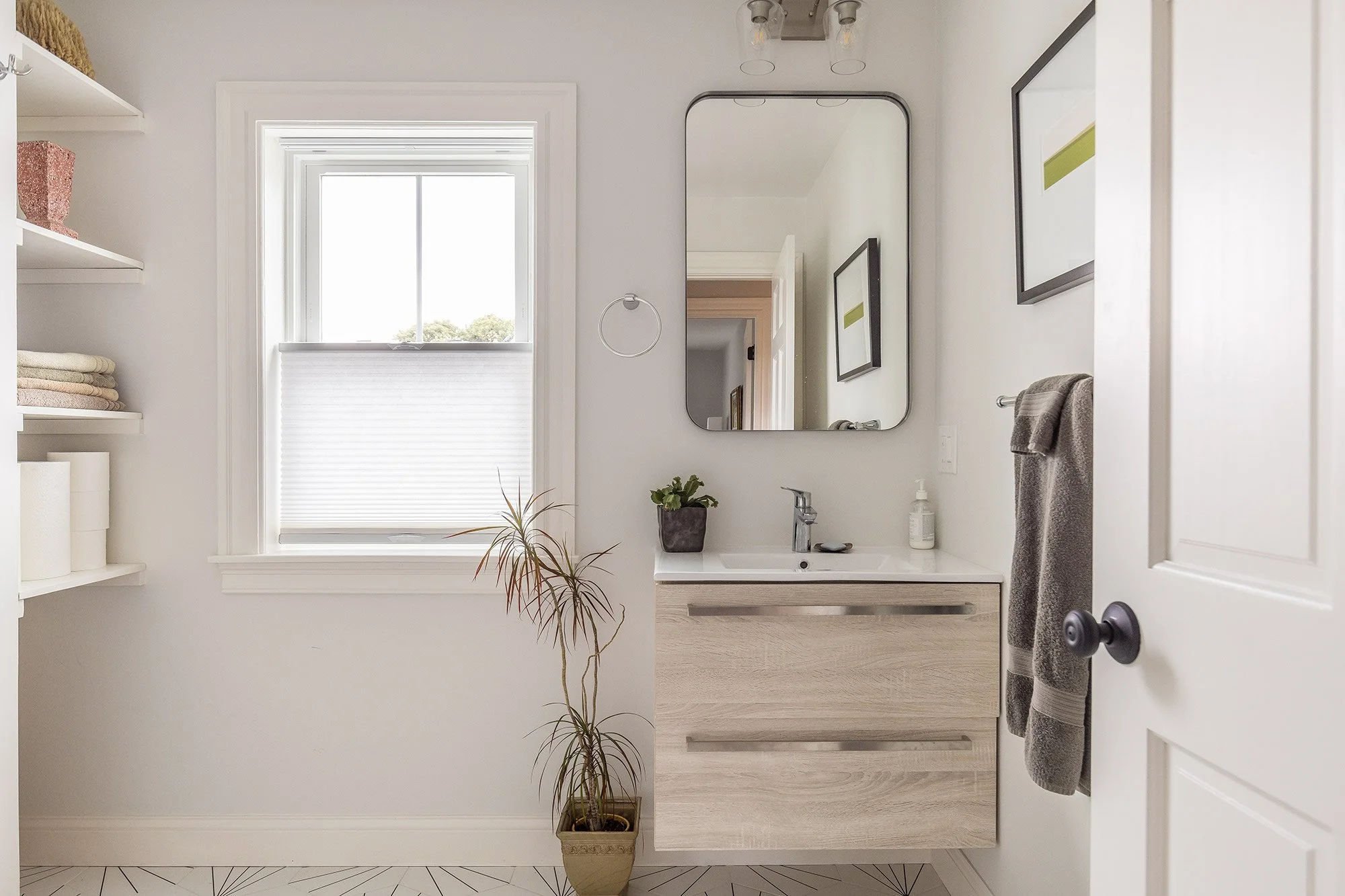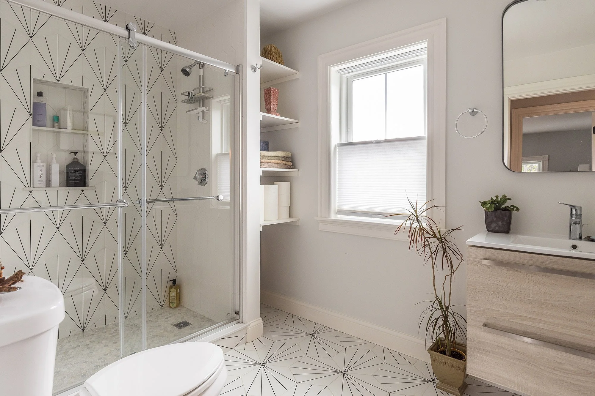 A full bathroom sits to the rear of this floor and has bold black & white starburst floor and shower tiles, a weathered gray floating vanity, and a dual flush toilet. The spacious walk-in shower is completed with sliding glass doors, marble hex tile floor, and a large toiletry niche. A column of deep shelving lines one wall, for all your storage needs.