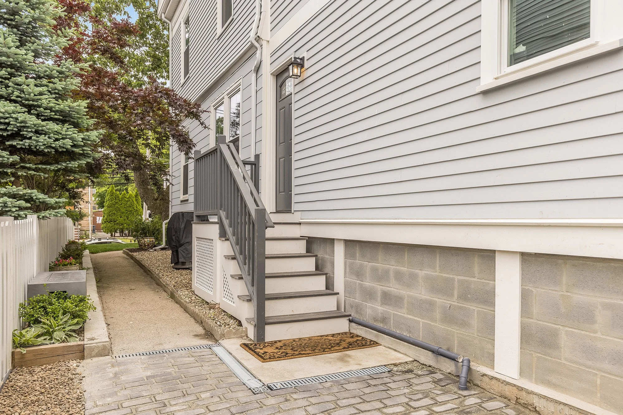 This condo has a private front deck off the living room, and exclusive outdoor space along the right hand side of the property. Elegant landscaping includes evergreen, hydrangea, dogwood shrubs, azalea and other perennials for year round interest.
