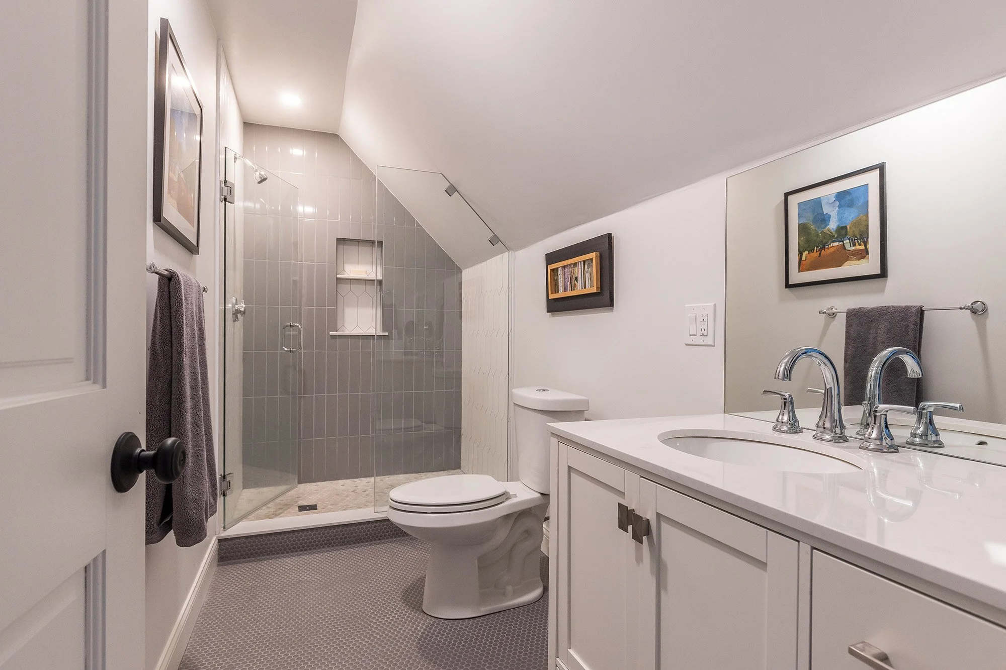 The 3rd bathroom features gray penny tile floors, a walk-in shower with oversized gray ceramic tiled surround and built-in toiletry niche, and a white vanity with chrome hardware and white quartz counter.